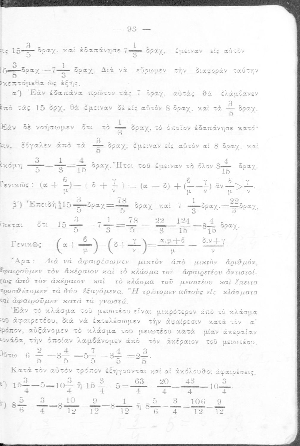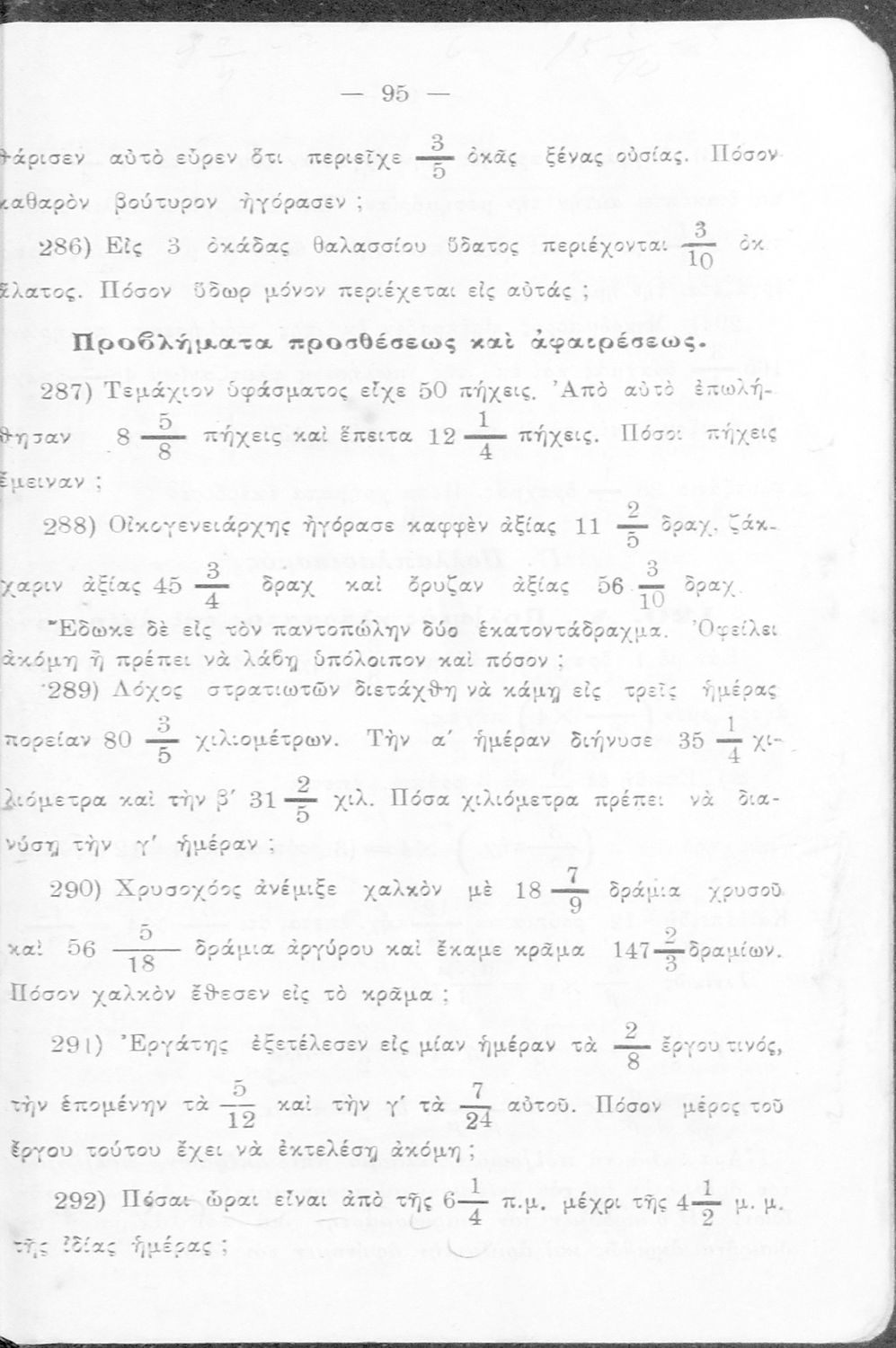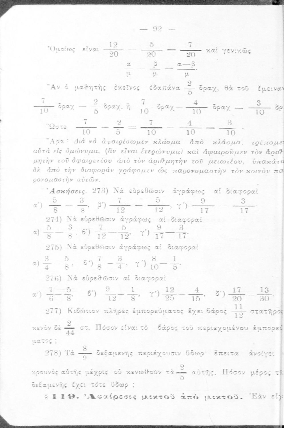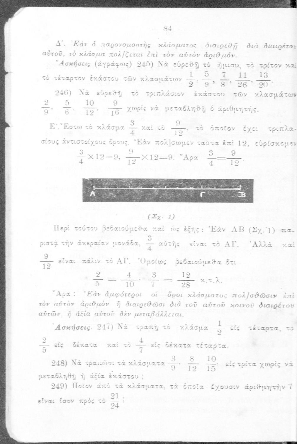 Σχολικό εγχειρίδιο Αριθμητικής για τις Α΄, Β΄, Γ΄ Γυμνασίου και τα Ανώτερα Παρθεναγωγεία που είναι χωρισμένο σε θεωρία και ασκήσεις και εστιάζει στις αριθμητικές πράξεις με κλάσματα και ακέραιους και συμμιγείς