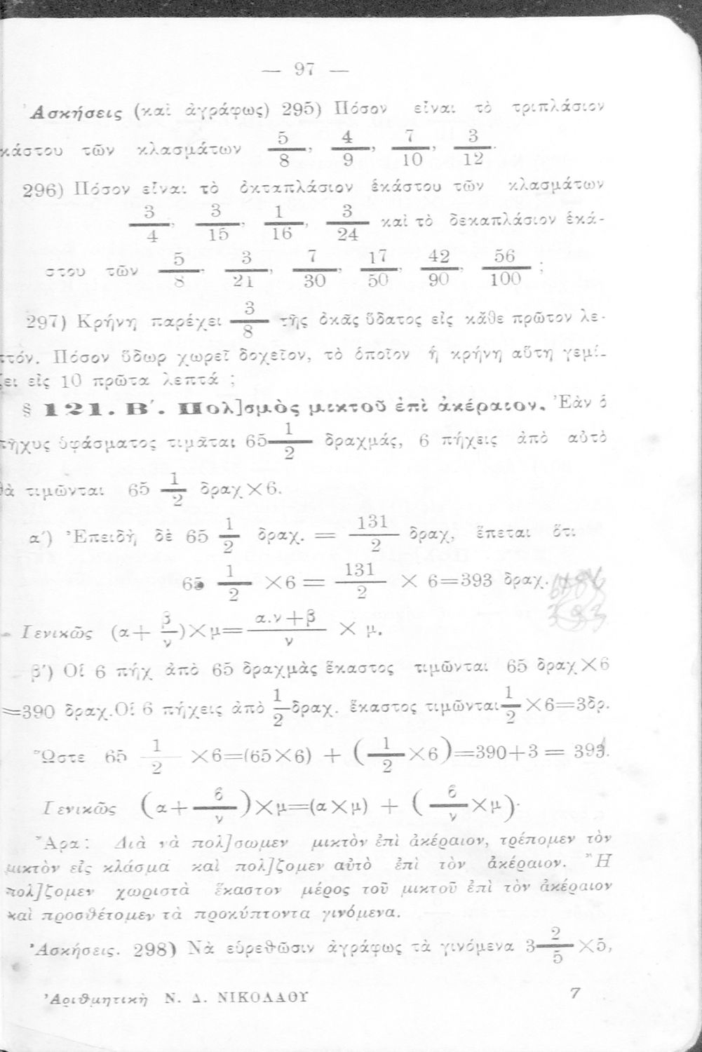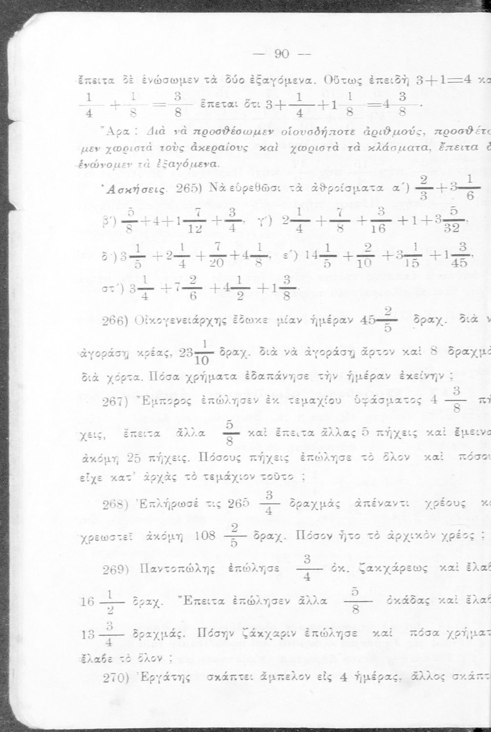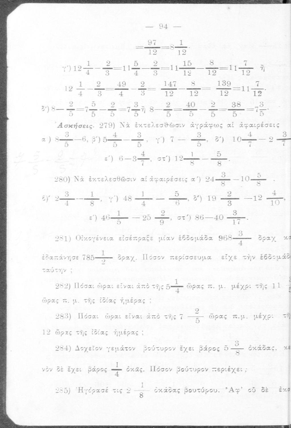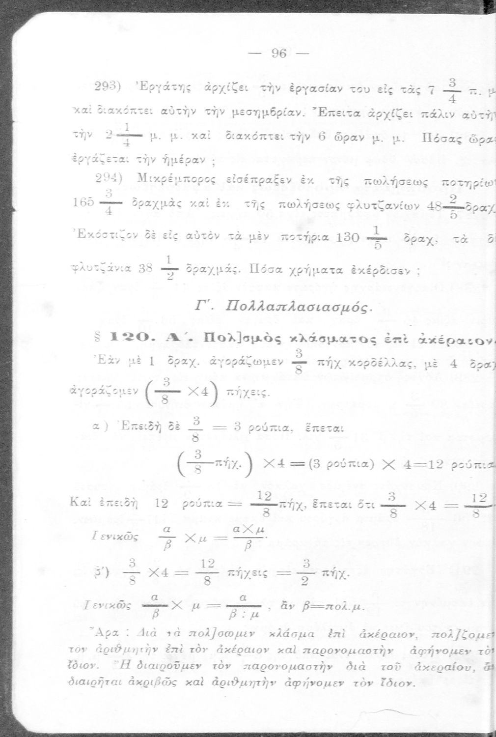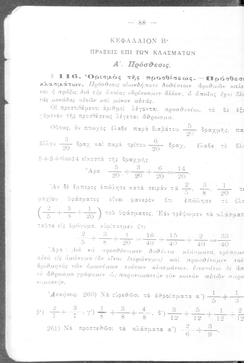 Σχολικό εγχειρίδιο Αριθμητικής για τις Α΄, Β΄, Γ΄ Γυμνασίου και τα Ανώτερα Παρθεναγωγεία που είναι χωρισμένο σε θεωρία και ασκήσεις και εστιάζει στις αριθμητικές πράξεις με κλάσματα και ακέραιους και συμμιγείς