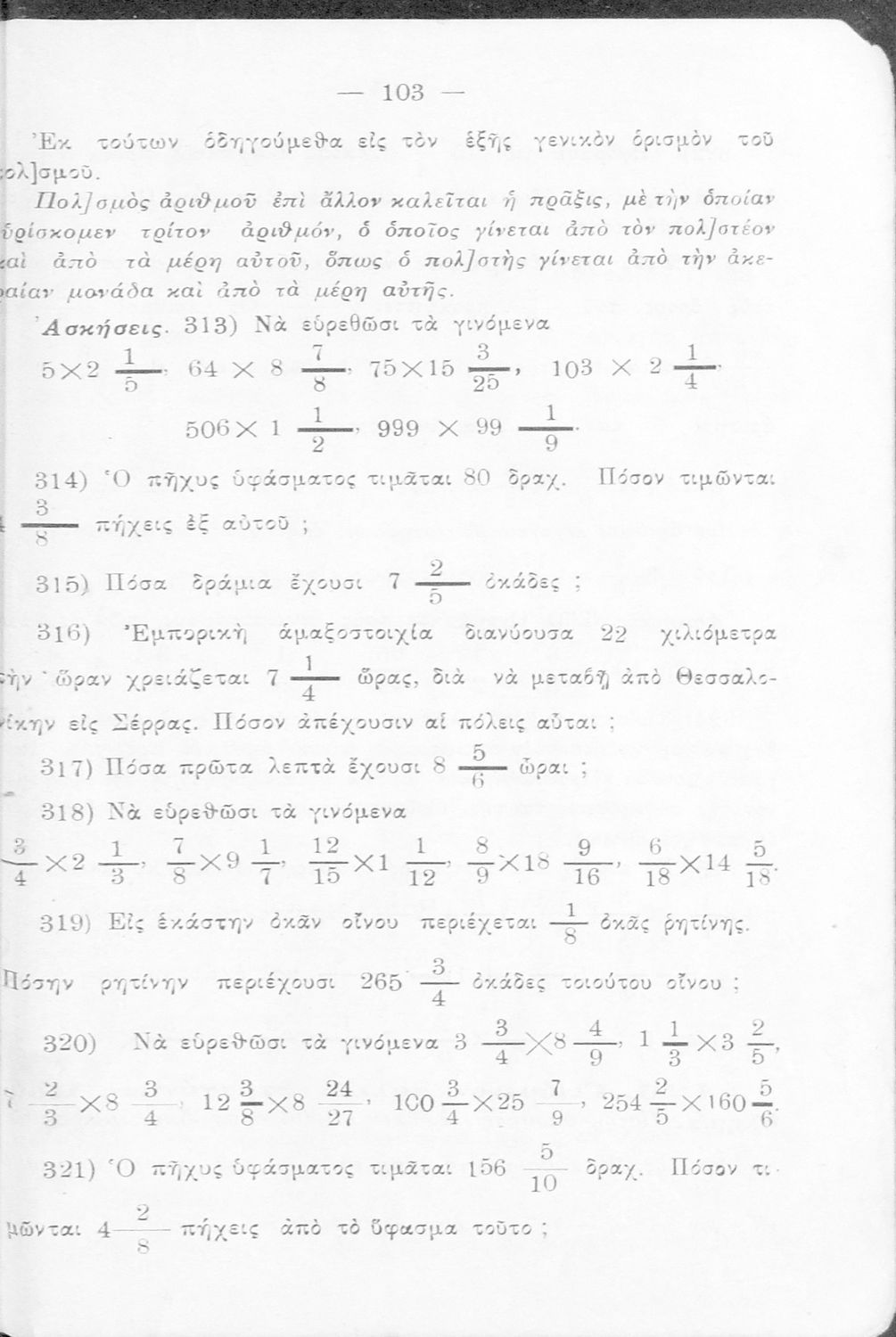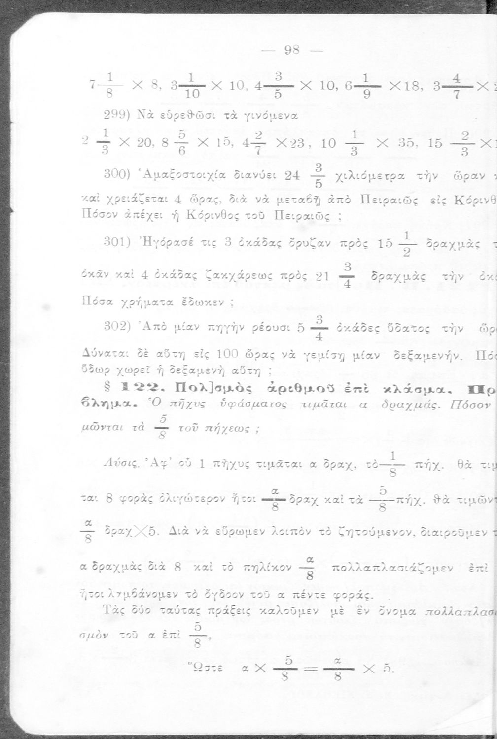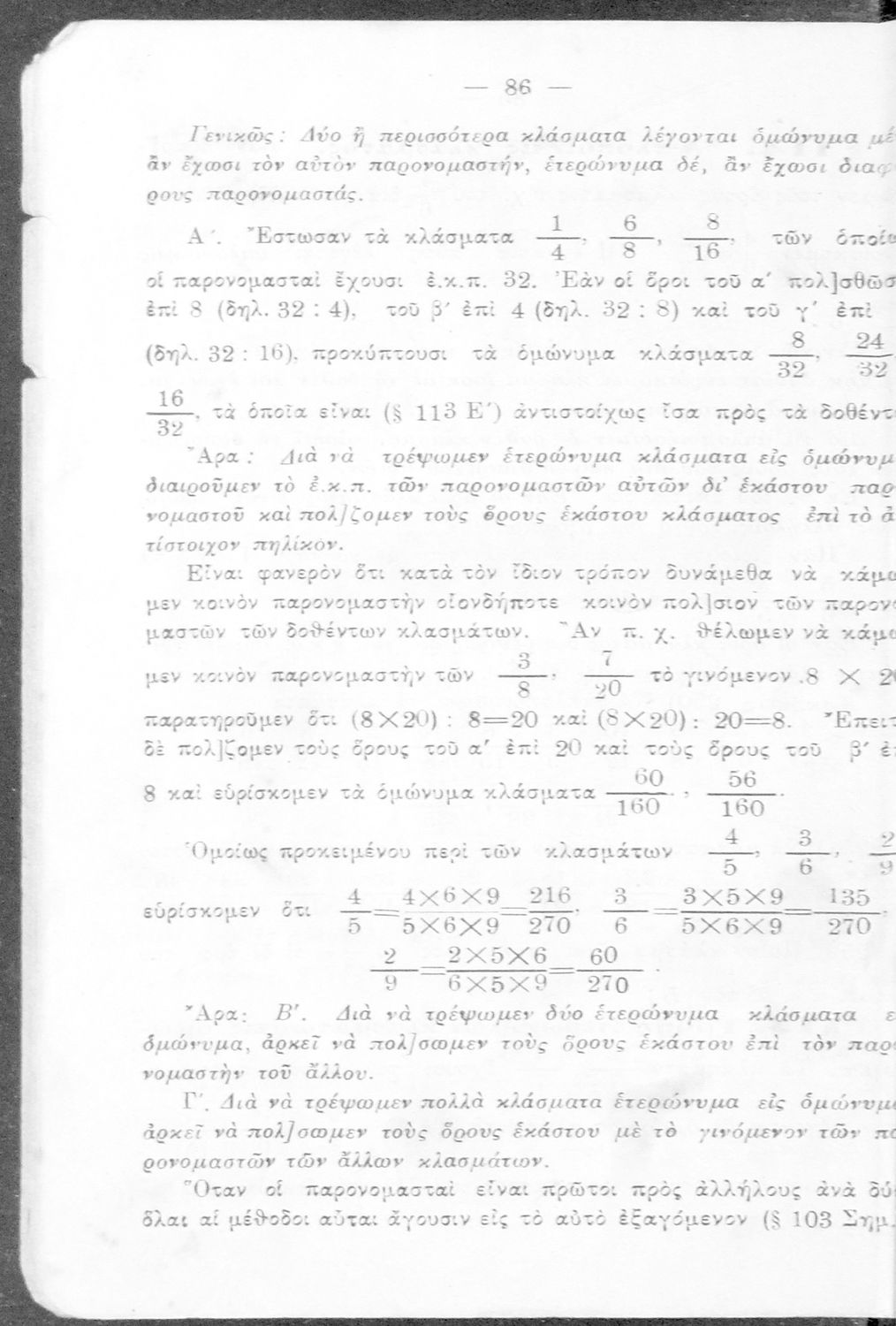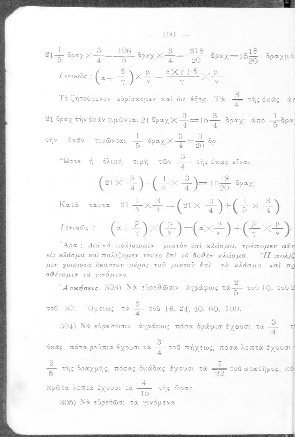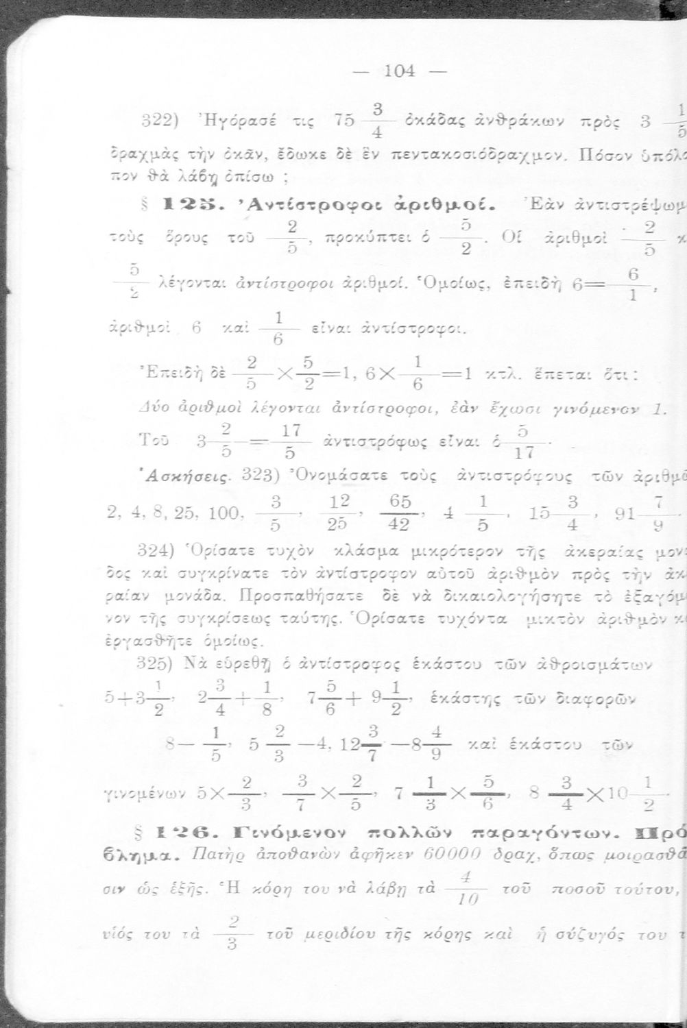 Σχολικό εγχειρίδιο Αριθμητικής για τις Α΄, Β΄, Γ΄ Γυμνασίου και τα Ανώτερα Παρθεναγωγεία που είναι χωρισμένο σε θεωρία και ασκήσεις και εστιάζει στις αριθμητικές πράξεις με κλάσματα και ακέραιους και συμμιγείς
