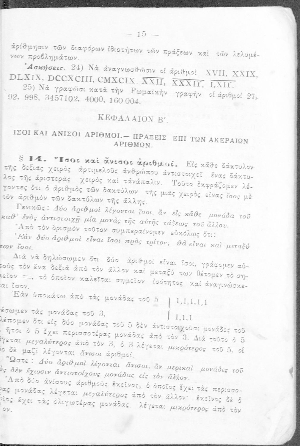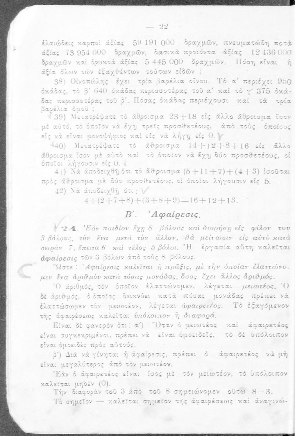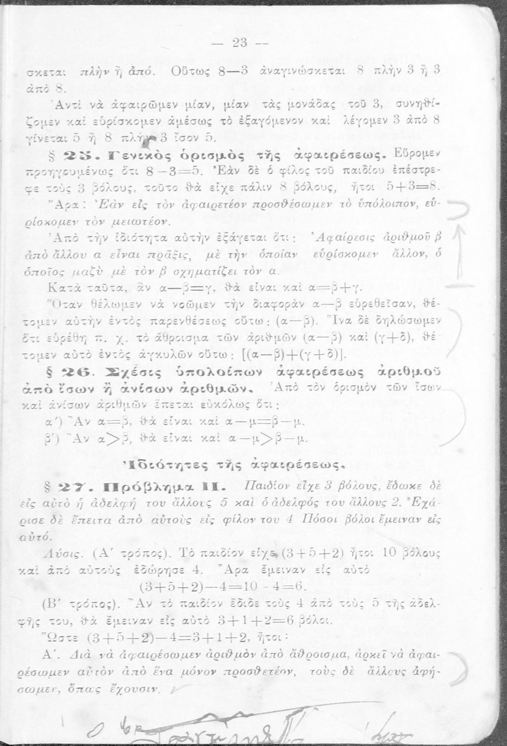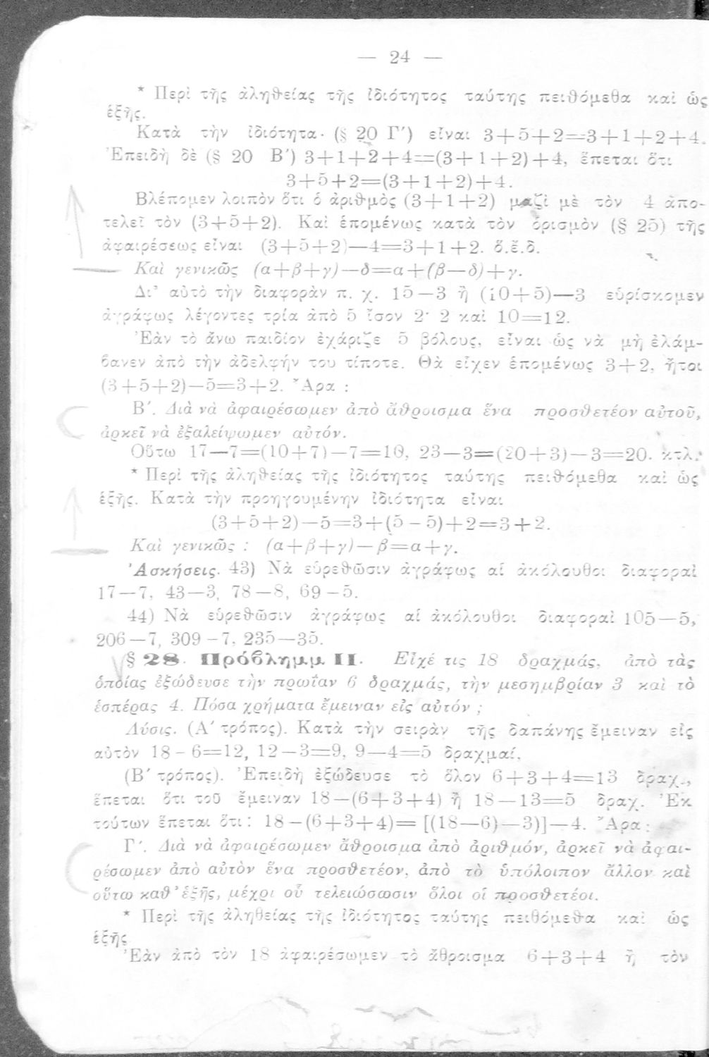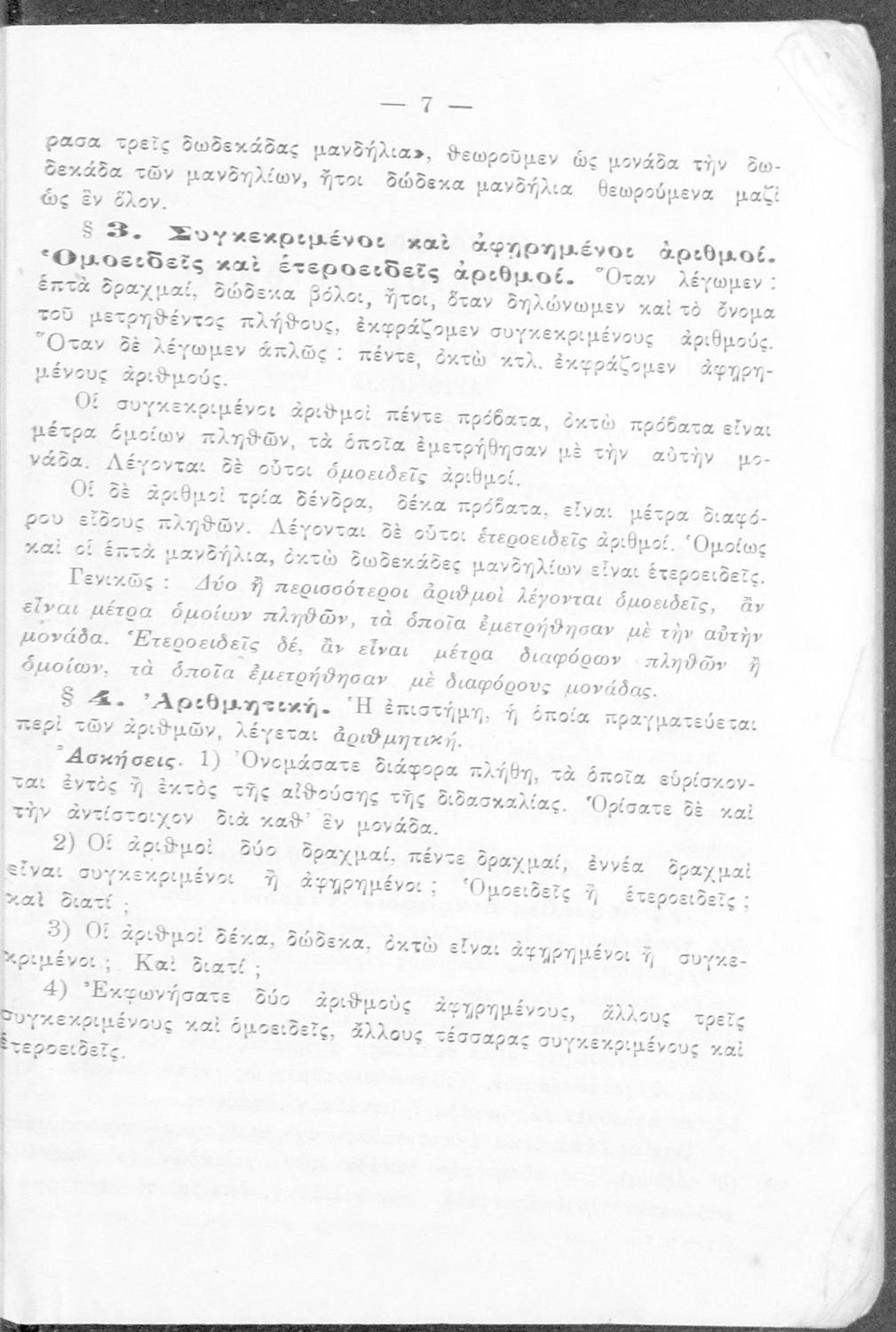 Σχολικό εγχειρίδιο Αριθμητικής για τις Α΄, Β΄, Γ΄ Γυμνασίου και τα Ανώτερα Παρθεναγωγεία που είναι χωρισμένο σε θεωρία και ασκήσεις και εστιάζει στις αριθμητικές πράξεις με κλάσματα και ακέραιους και συμμιγείς