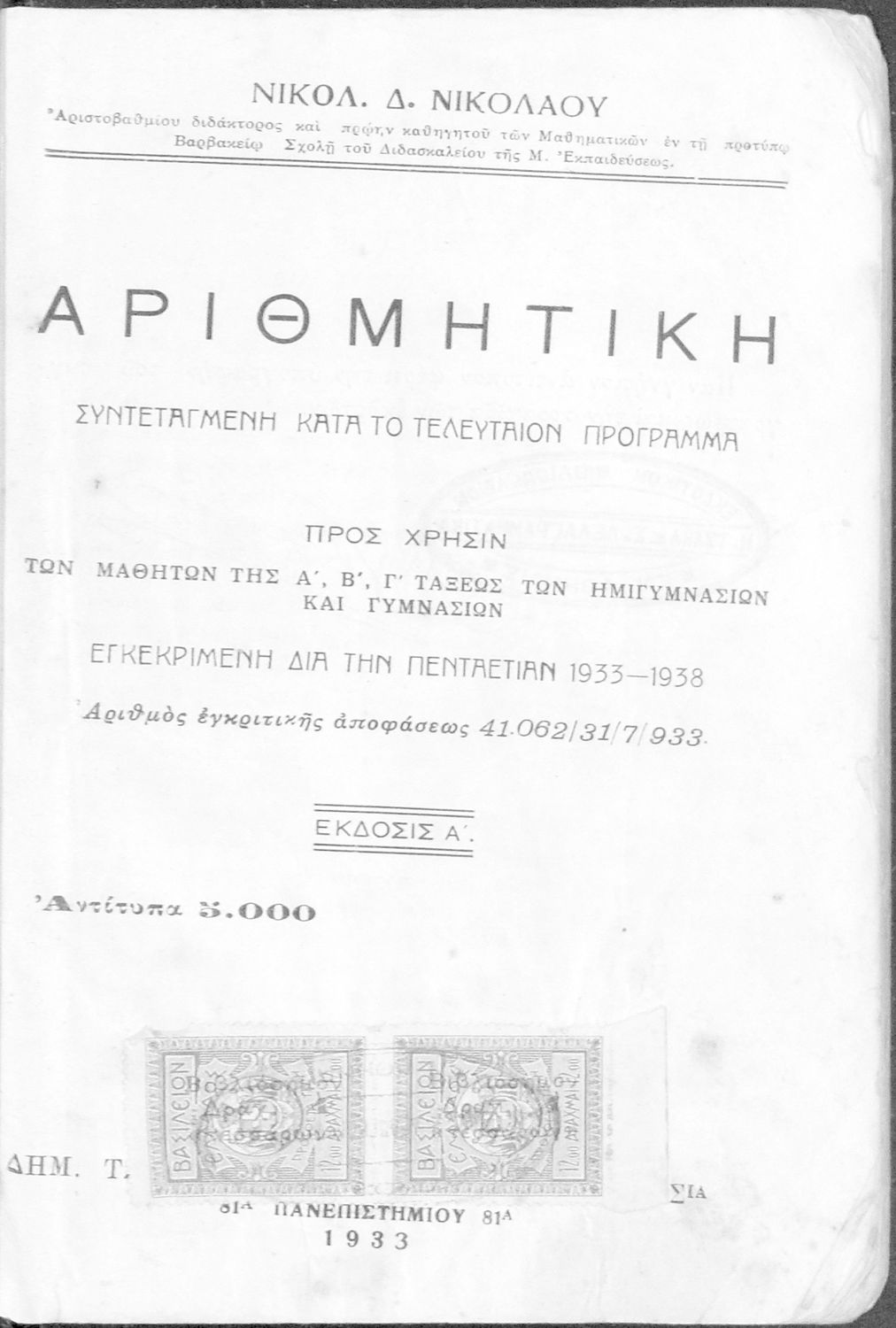 Τίτλος: Αριθμητική συντεταγμένη κατά το τελευταίον πρόγραμμα προς χρήσιν των μαθητών της Α΄, Β΄, Γ΄ τάξεως των Γυμνασίων και Ημιγυμνασίων