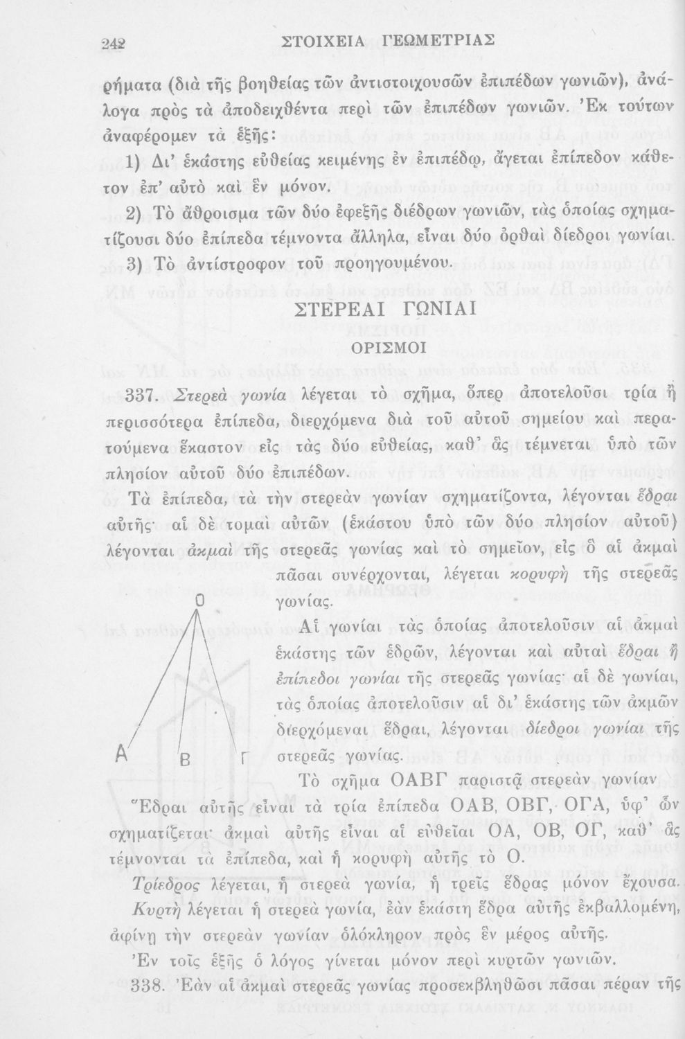 Σχολικό εγχειρίδιο Γεωμετρίας Γυμνασίου χωρισμένο σε ορισμούς, θεωρήματα, πορίσματα και ασκήσεις που εστιάζει στην Επιπεδομετρία και τη Στερεομετρία. Διαθέτει και παράρτημα με στοιχεία Αναλυτικής Γεωμετρίας.