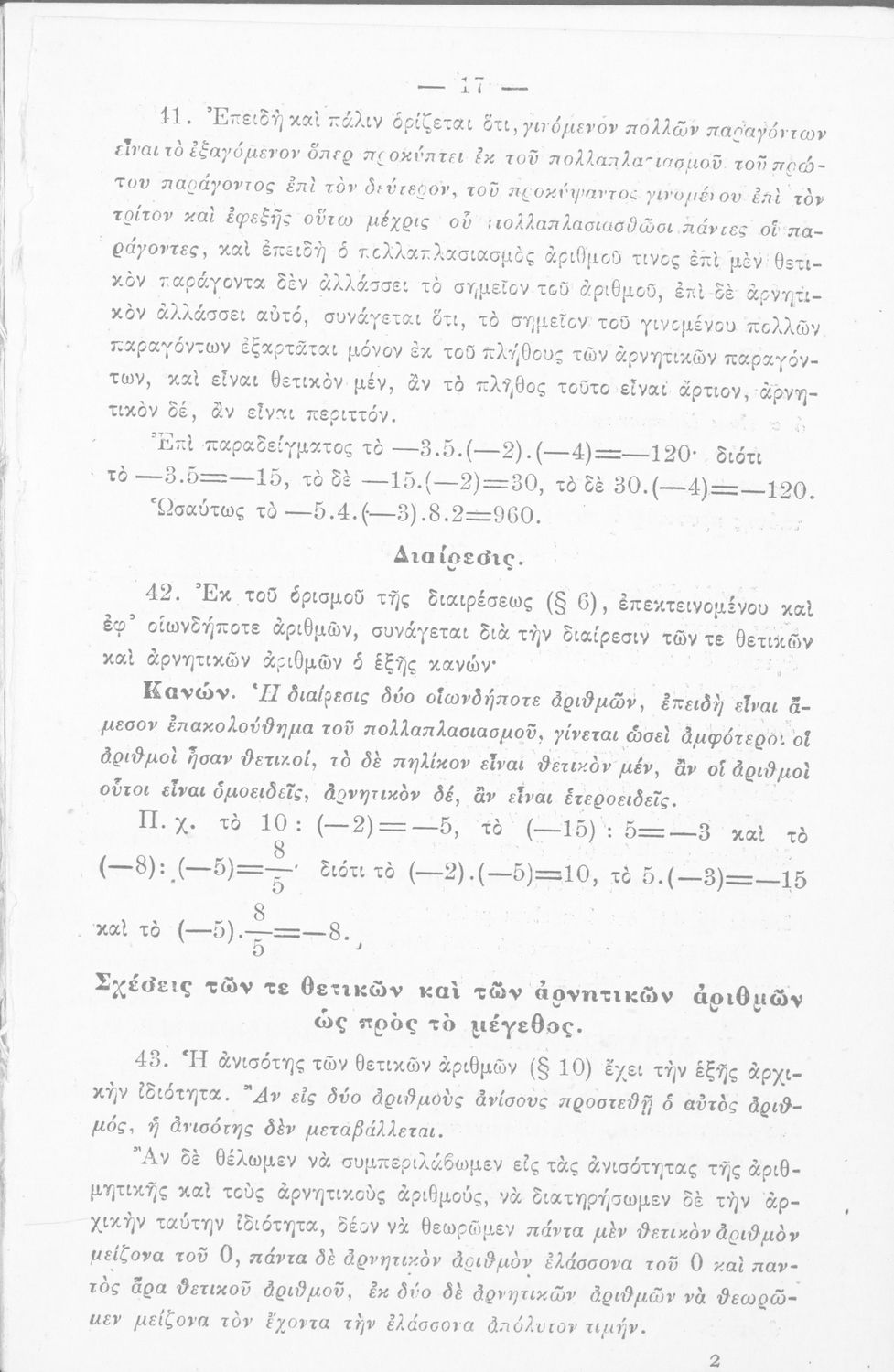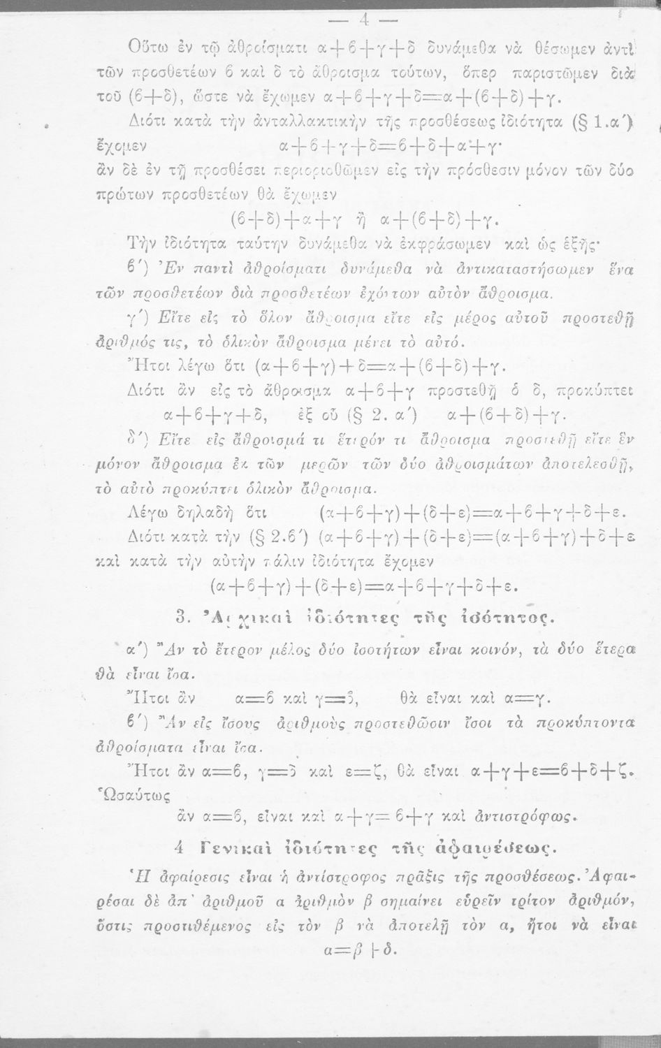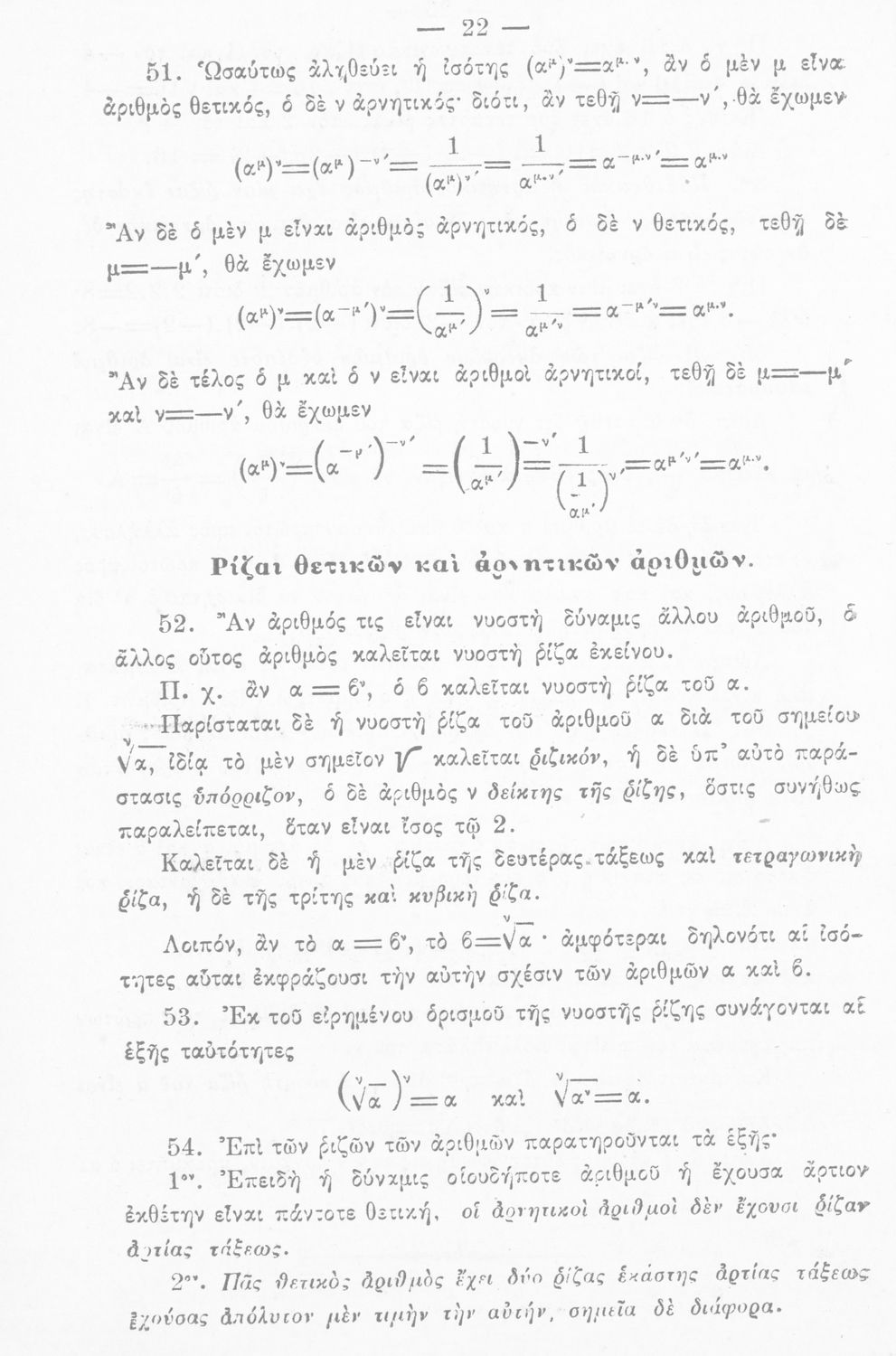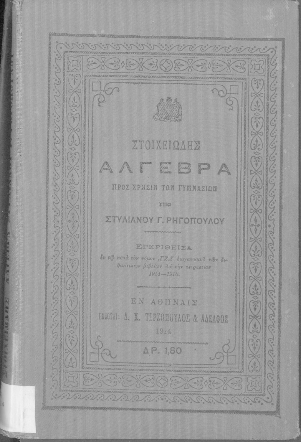 Σχολικό εγχειρίδιο Άλγεβρας Γυμνασίου που περιέχει θεωρία και ασκήσεις. Ο συγγραφέας ήταν υφηγητής στο Εθνικό Πανεπιστήμιο.