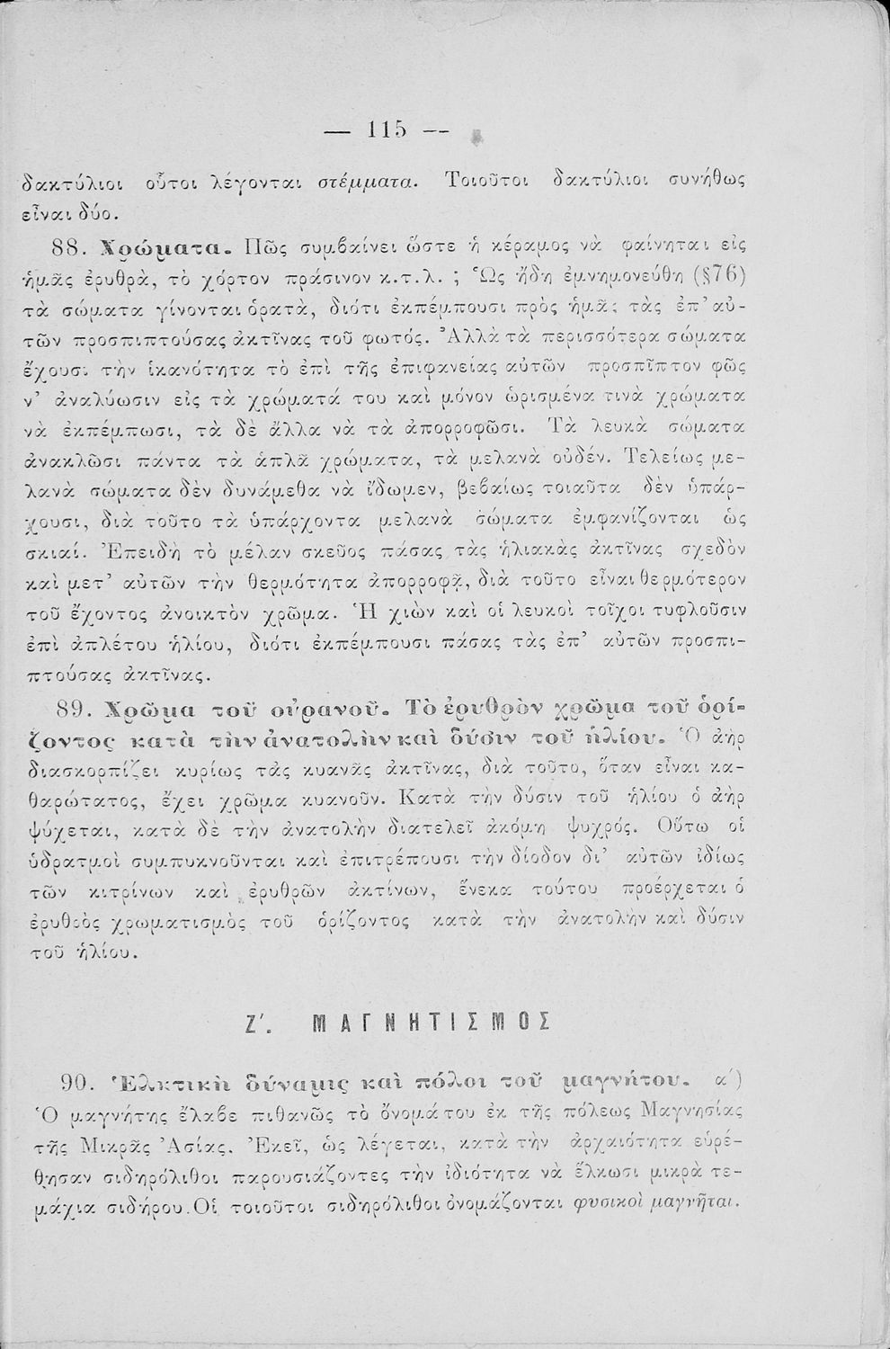 Παρουσίαση περιεχομένου: Σχολικό εγχειρίδιο Φυσικής για τα Ελληνικά Σχολεία και Παρθεναγωγεία που εστιάζει στα φυσικά φαινόμενα της θερμότητας, του ηλεκτρισμού και του μαγνητισμού, της υδροστατικής, της βαρύτητας και της αεροστατικής.