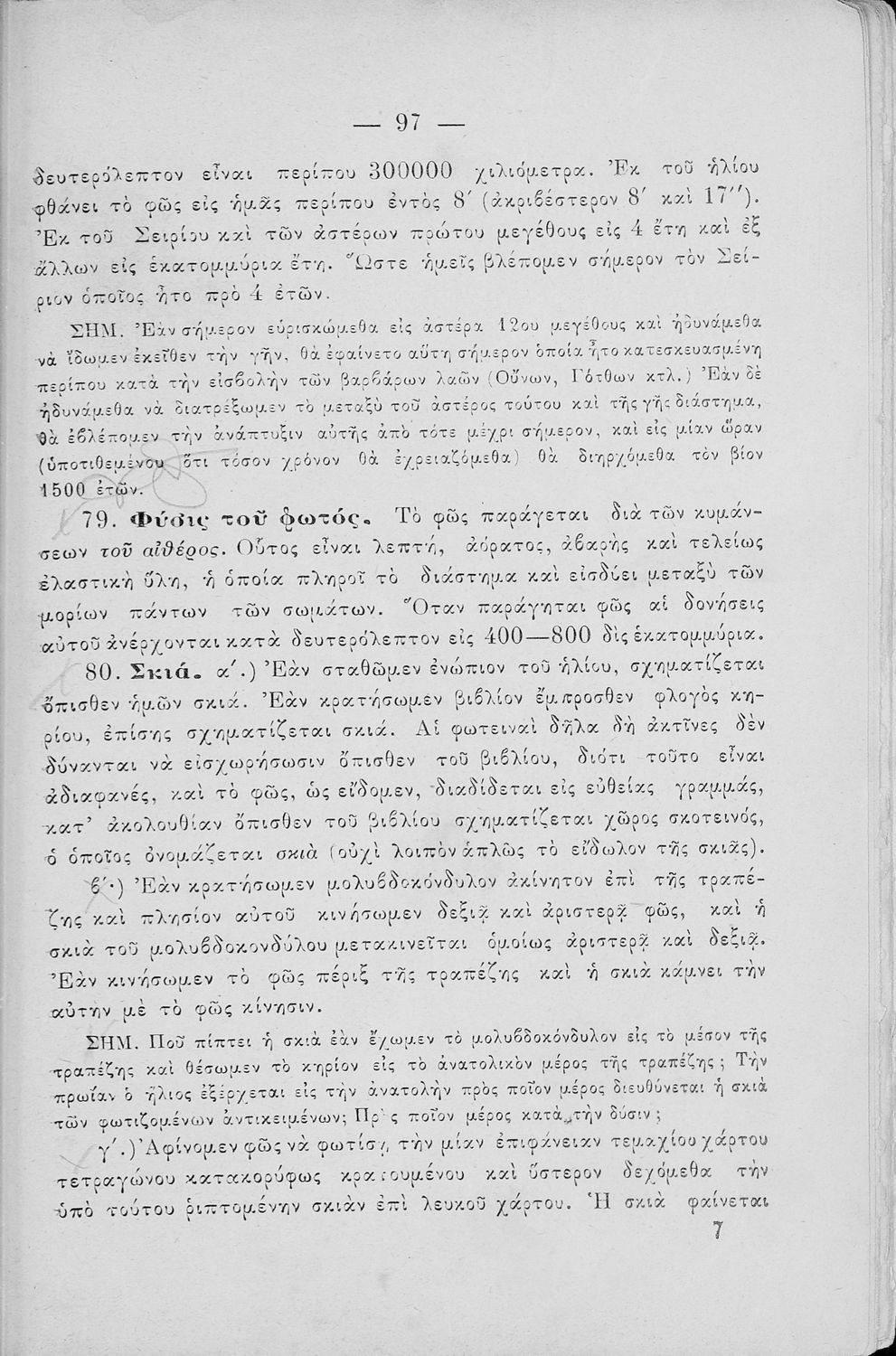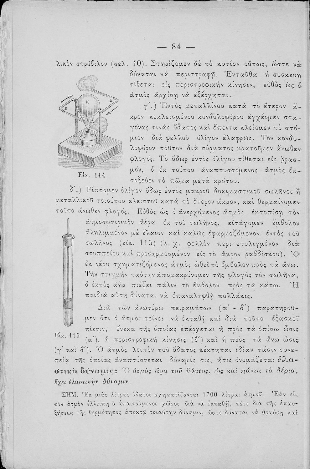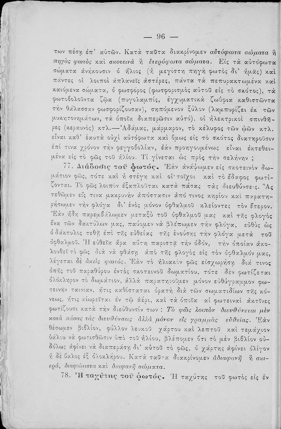 Βαθμίδα εκπαίδευσης: Δευτεροβάθμια Τάξη: Ελληνικό Σχολείο / Παρθεναγωγείο Μάθημα: Φυσική Γλώσσα: Καθαρεύουσα Παρουσίαση περιεχομένου: Σχολικό εγχειρίδιο Φυσικής για τα Ελληνικά Σχολεία και Παρθεναγωγεία που εστιάζει στα φυσικά φαινόμενα της θερμότητας, του ηλεκτρισμού και του μαγνητισμού, της υδροστατικής, της βαρύτητας και της αεροστατικής. |