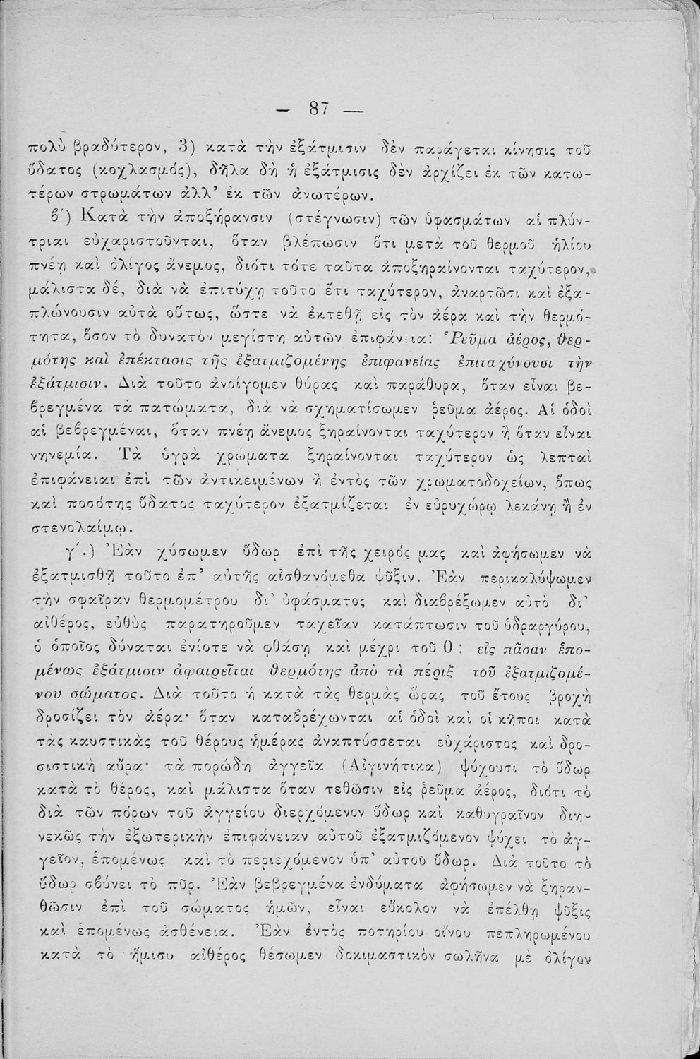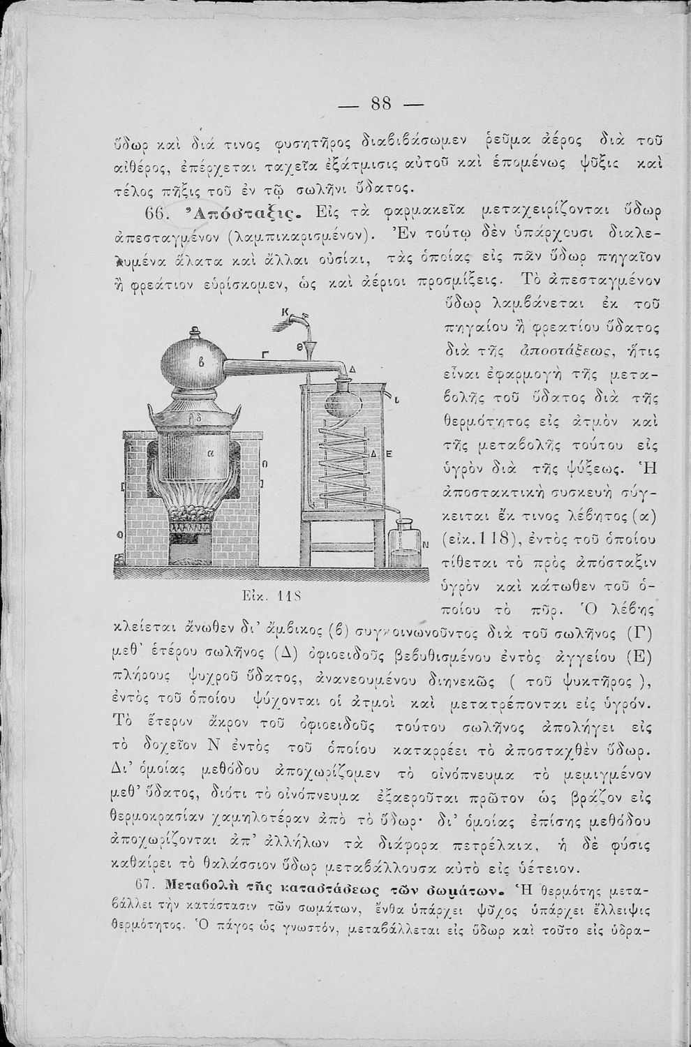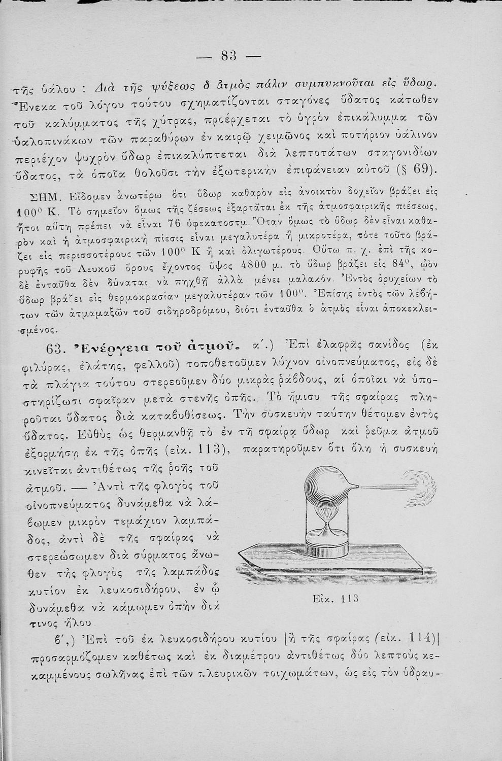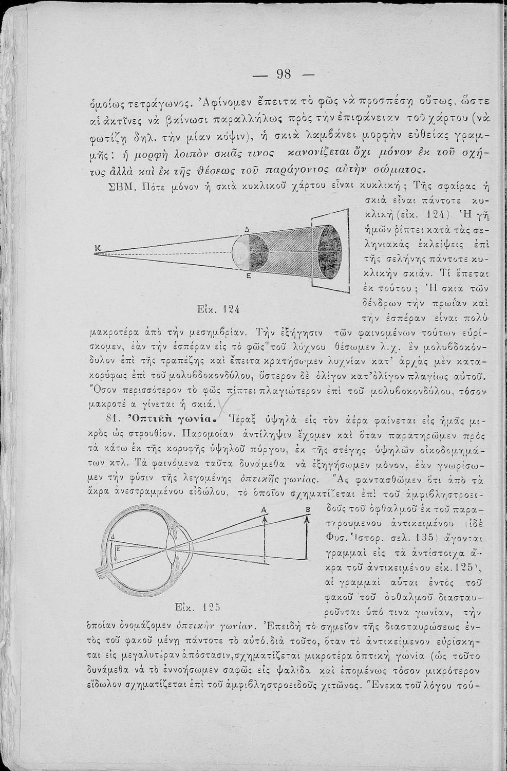 Βαθμίδα εκπαίδευσης: Δευτεροβάθμια Τάξη: Ελληνικό Σχολείο / Παρθεναγωγείο Μάθημα: Φυσική Γλώσσα: Καθαρεύουσα Παρουσίαση περιεχομένου: Σχολικό εγχειρίδιο Φυσικής για τα Ελληνικά Σχολεία και Παρθεναγωγεία που εστιάζει στα φυσικά φαινόμενα της θερμότητας, του ηλεκτρισμού και του μαγνητισμού, της υδροστατικής, της βαρύτητας και της αεροστατικής. |