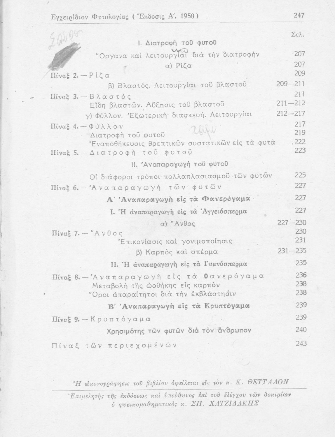 Σχολικό εγχειρίδιο Φυτολογίας που εξετάζει φυτά και δέντρα της Ελλάδας ανάλογα με τη συνομοταξία στην οποία ανήκουν και παρέχει πληροφορίες για την αναπαραγωγή τους και τη χρησιμότητά τους για τον άνθρωπο.
