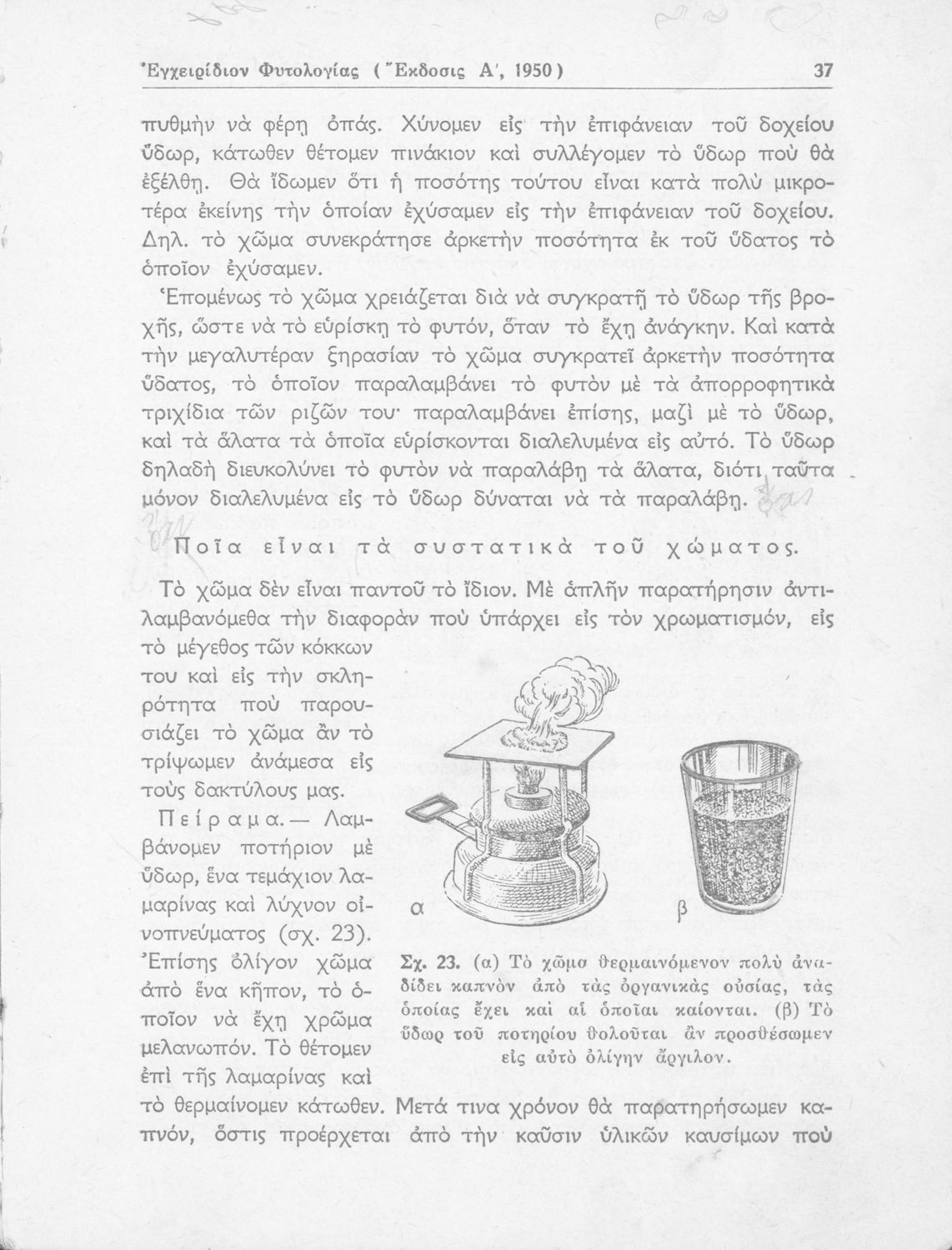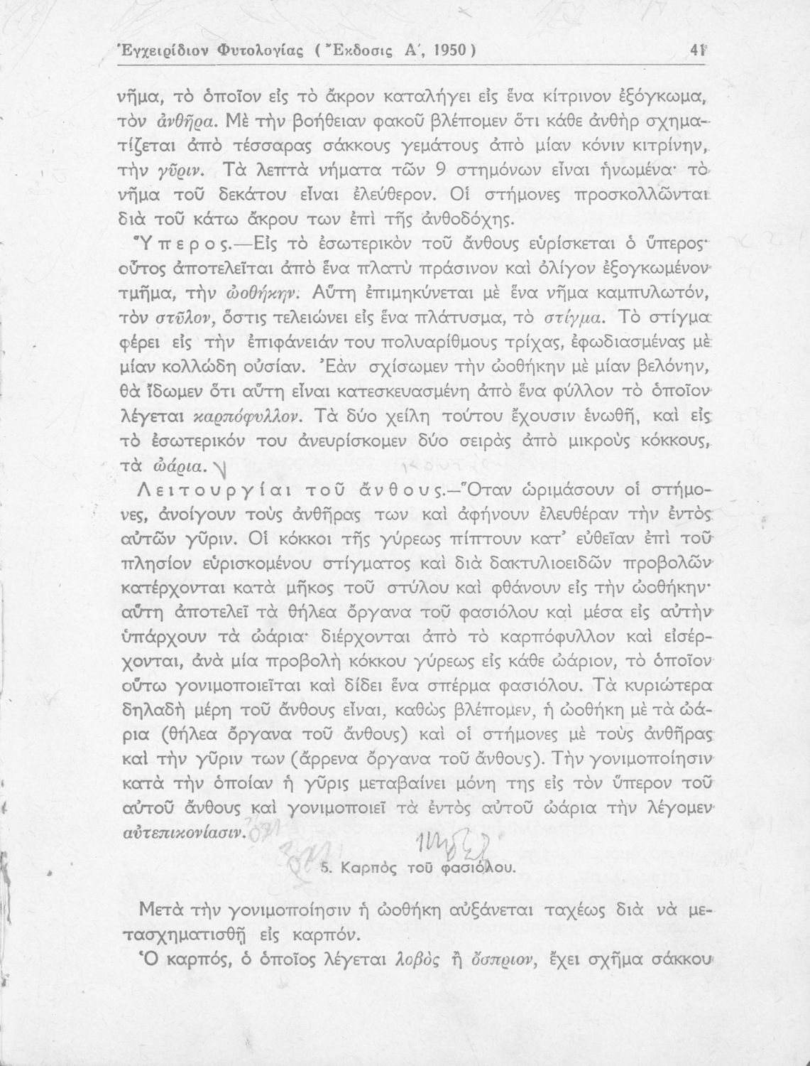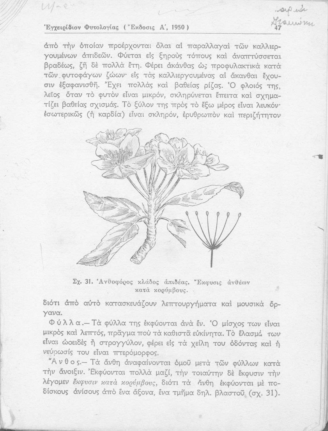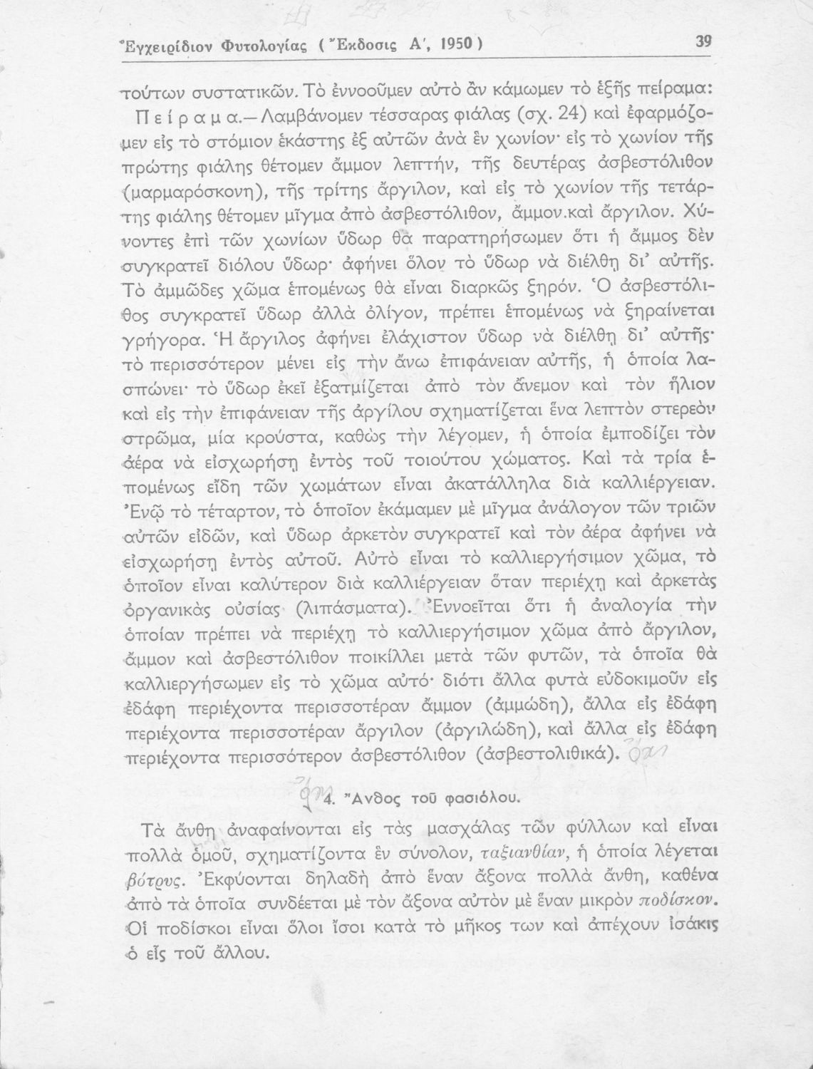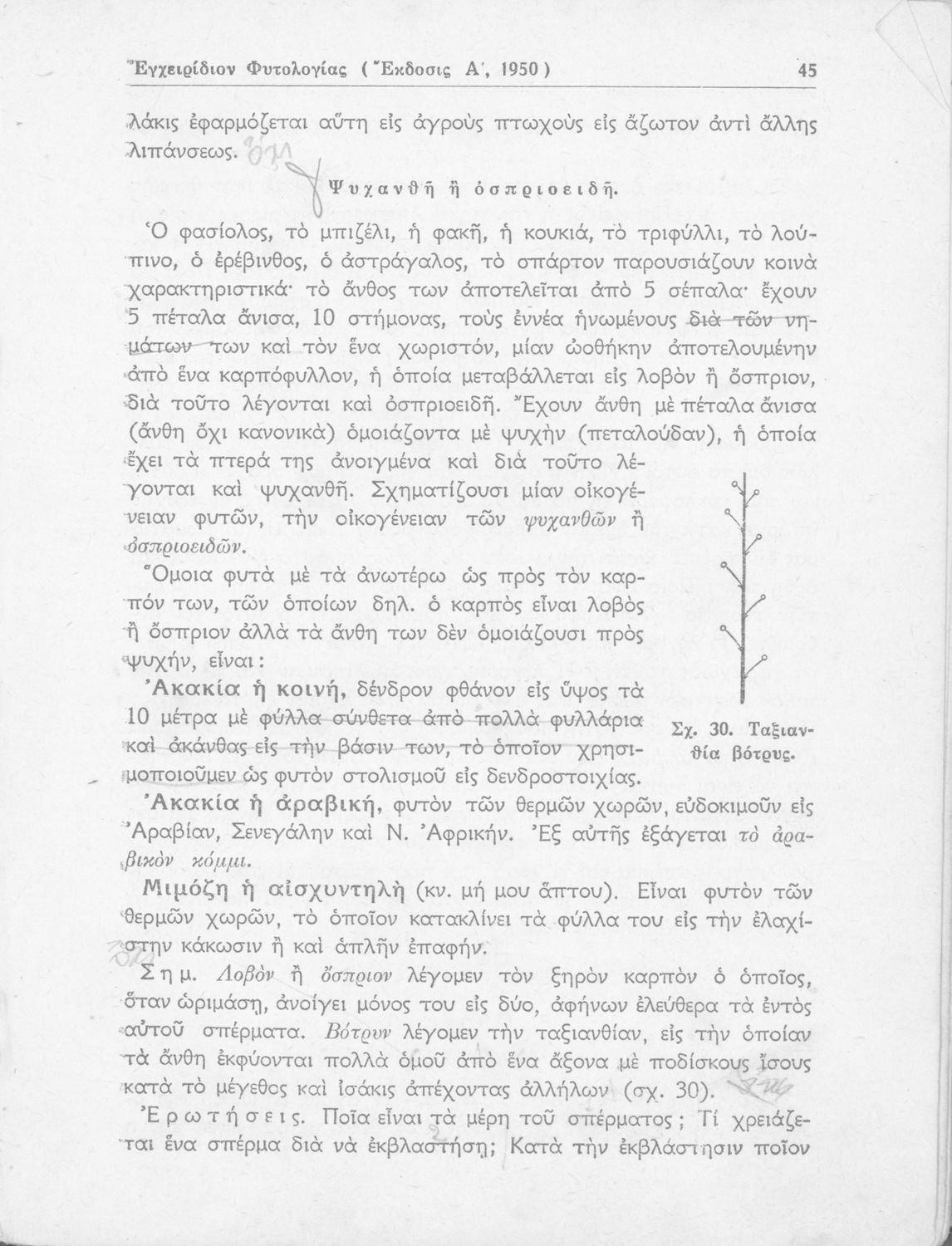 Σχολικό εγχειρίδιο Φυτολογίας που εξετάζει φυτά και δέντρα της Ελλάδας ανάλογα με τη συνομοταξία στην οποία ανήκουν και παρέχει πληροφορίες για την αναπαραγωγή τους και τη χρησιμότητά τους για τον άνθρωπο.