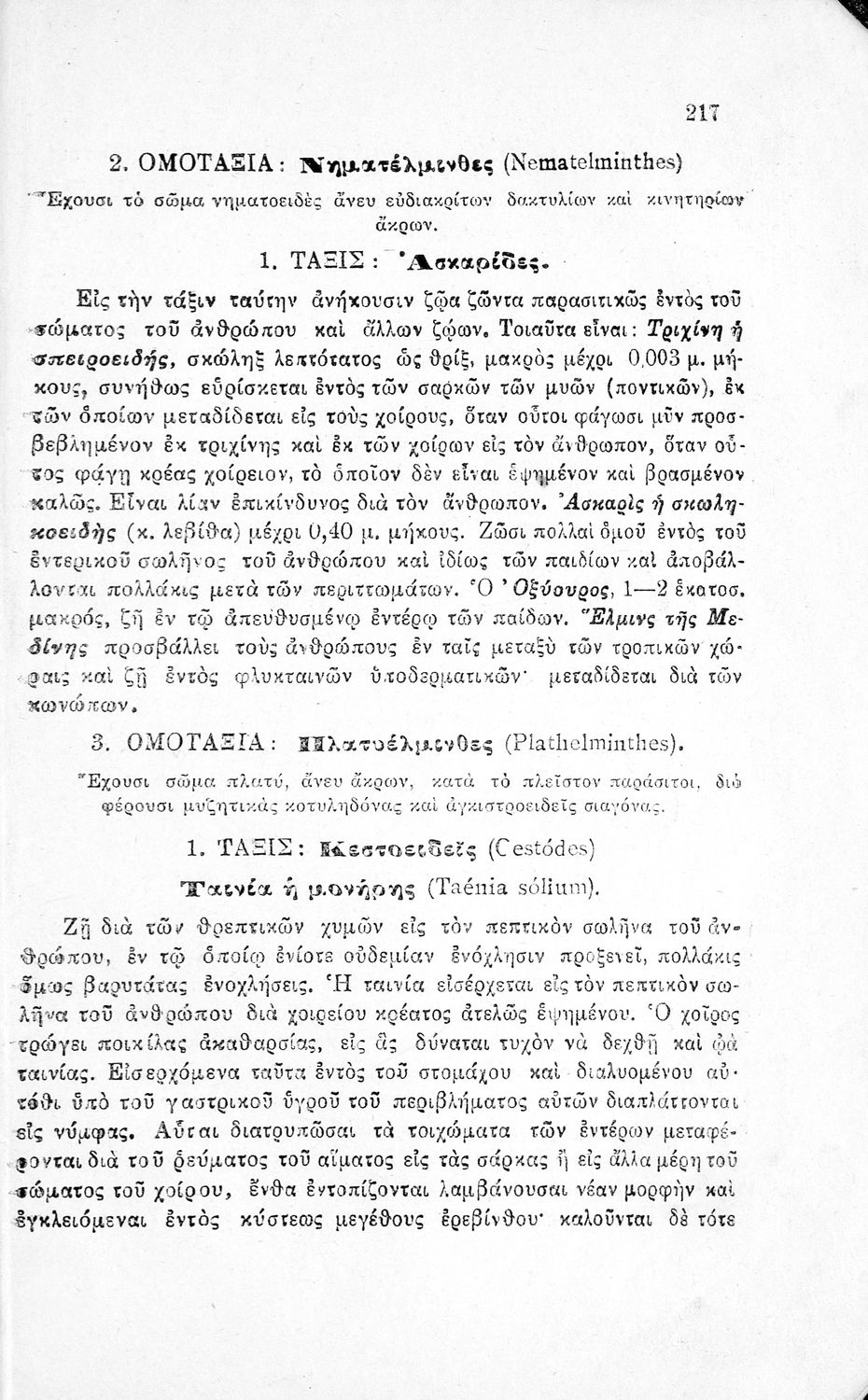Σχολικό εγχειρίδιο Ζωολογίας για τα Γυμνάσια και τα Διδασκαλεία που εστιάζει στην ανθρώπινη φυσιολογία και παρουσιάζει τα διάφορα ζώα ανάλογα με την συνομοταξία στην οποία ανήκουν.