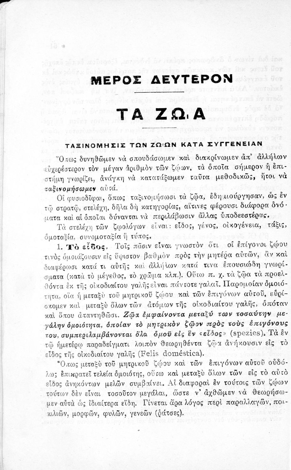 Σχολικό εγχειρίδιο Φυσικής Ιστορίας για τα Ελληνικά Σχολεία και Παρθεναγωγεία που περιλαμβάνει στοιχεία ζωολογίας και της φυτολογίας και διακρίνει τα ζώα και τα φυτά ανάλογα με την συνομοταξία στην οποία ...
