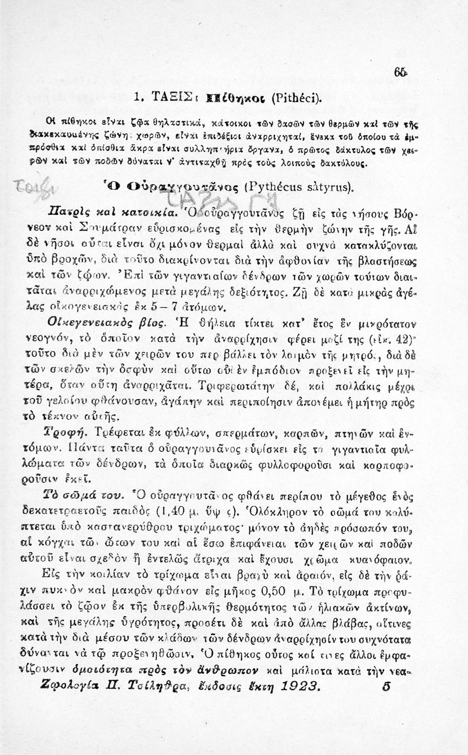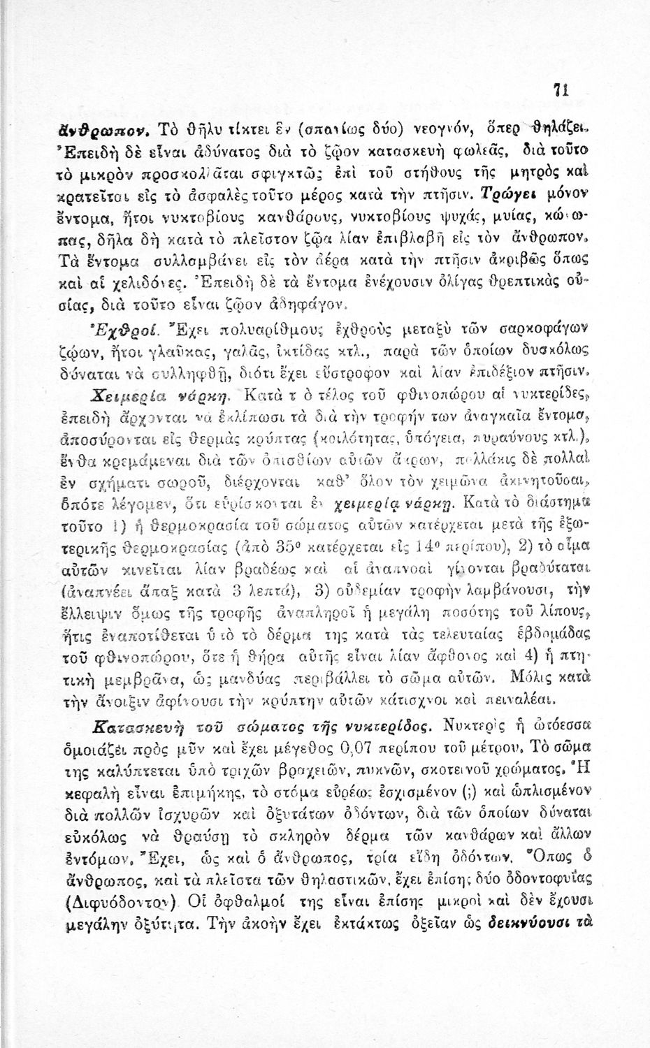 Σχολικό εγχειρίδιο Ζωολογίας για τα Γυμνάσια, τα Παρθεναγωγεία και τα Διδασκαλεία που εστιάζει στην ανθρώπινη φυσιολογία και παρουσιάζει τα διάφορα ζώα ανάλογα με την συνομοταξία στην οποία ανήκουν.
