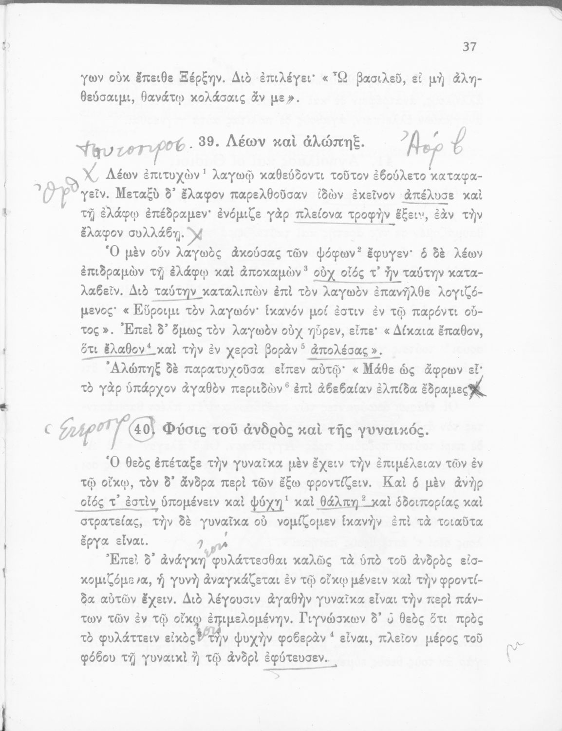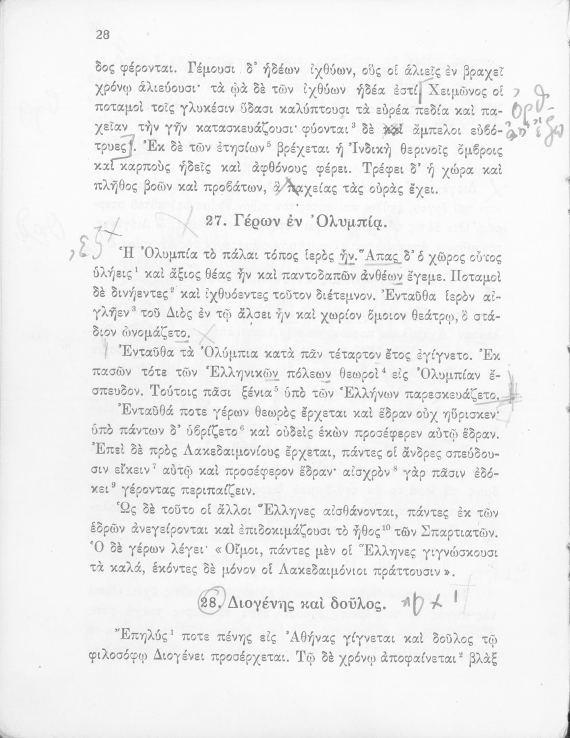 Σχολικό Εγχειρίδιο Αρχαίων Ελληνικών που περιλαμβάνει κείμενα προσαρμοσμένα στη διδασκαλία των γραμματικών και συντακτικών φαινομένων, και ερμηνευτικές και λεξιλογικές σημειώσεις.