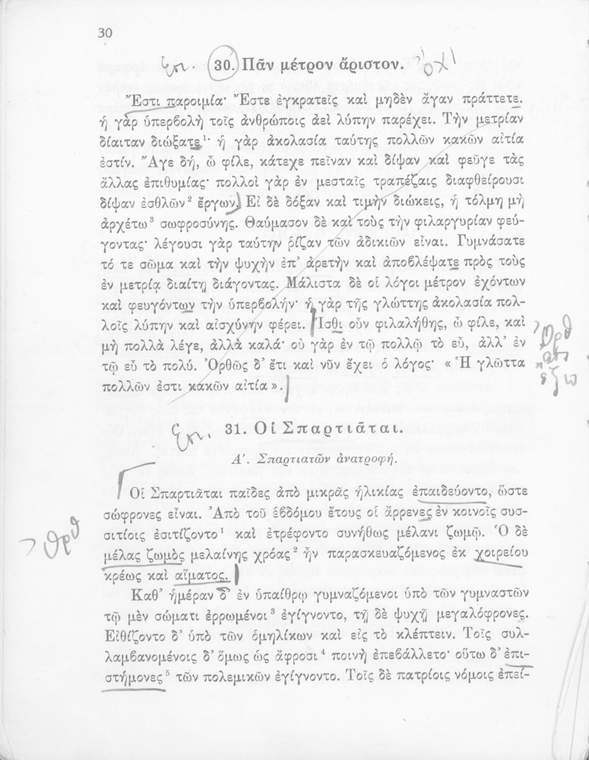 Σχολικό Εγχειρίδιο Αρχαίων Ελληνικών Α' και Β΄ Γυμνασίου που περιλαμβάνει κείμενα προσαρμοσμένα στη διδασκαλία των γραμματικών και συντακτικών φαινομένων, και ερμηνευτικές και λεξιλογικές σημειώσεις.