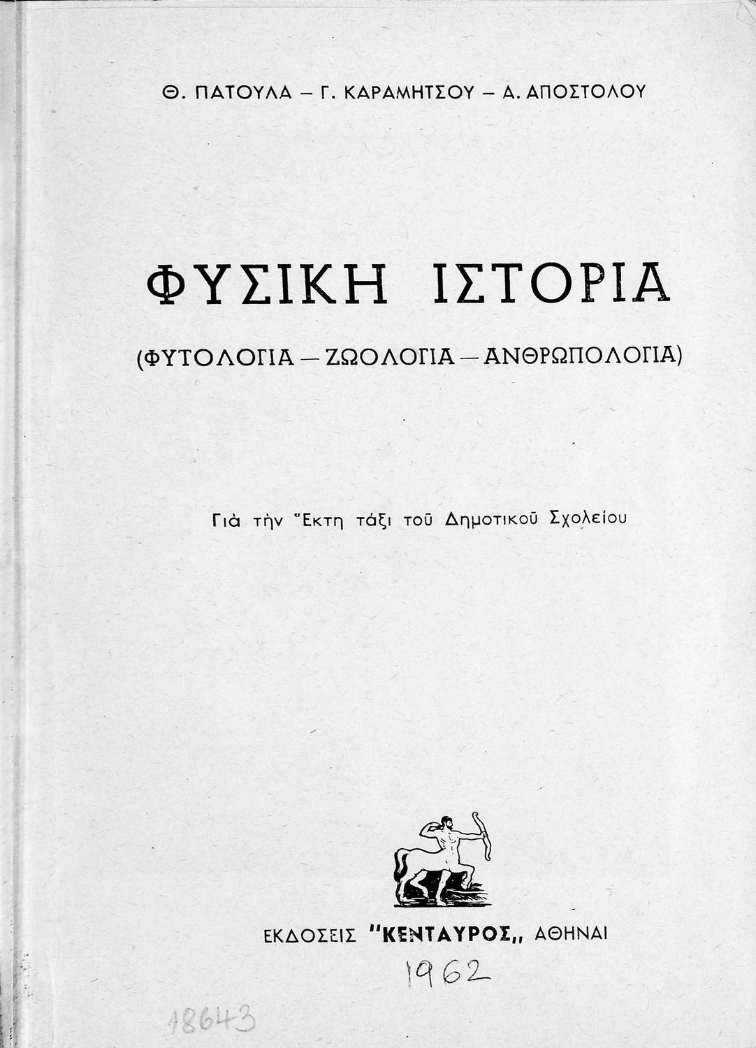 Κωδικός αναγνώρισης: 01-18643 Τίτλος: Φυσική Ιστορία (Φυτολογία-Ζωολογία-Ανθρωπολογία) για την έκτη τάξι του Δημοτικού Σχολείου Συγγραφέας: Θ. Πατουλάς, Γ. Καραμήτσος, Α. Απόστολου Εικονογράφος: Ρένα Τζολάκη Μέγεθος και υπόστρωμα: Μαθητικό βοήθημα, μαλακό εξώφυλλο, 128 σελίδες. Σκίτσα, εικόνες (ασπρόμαυρα). |