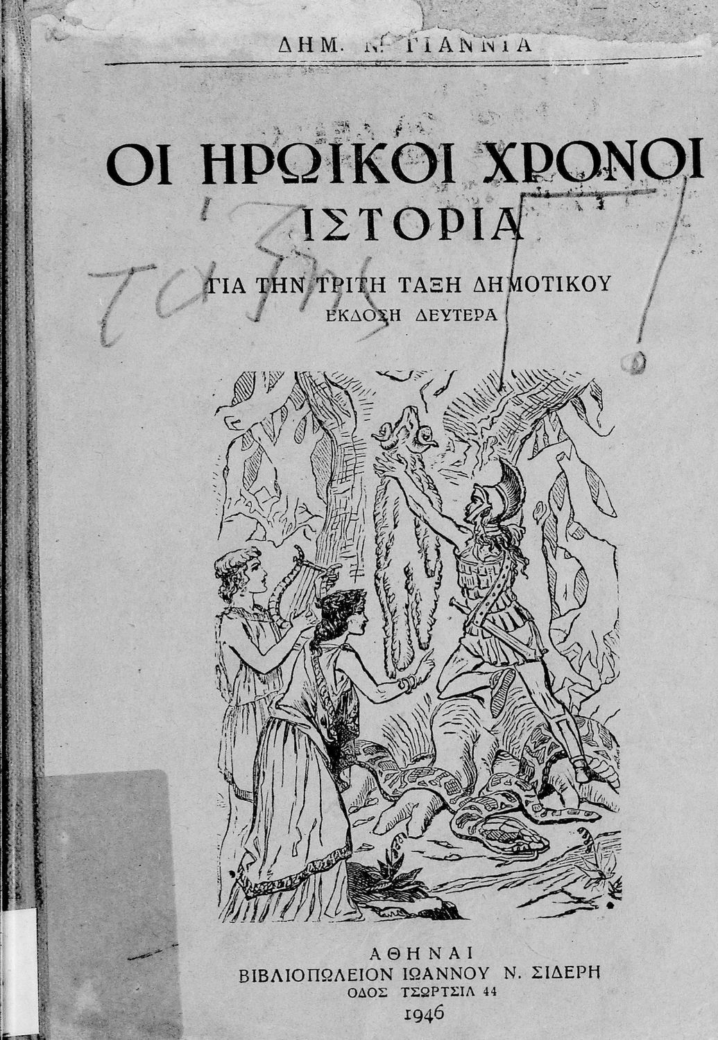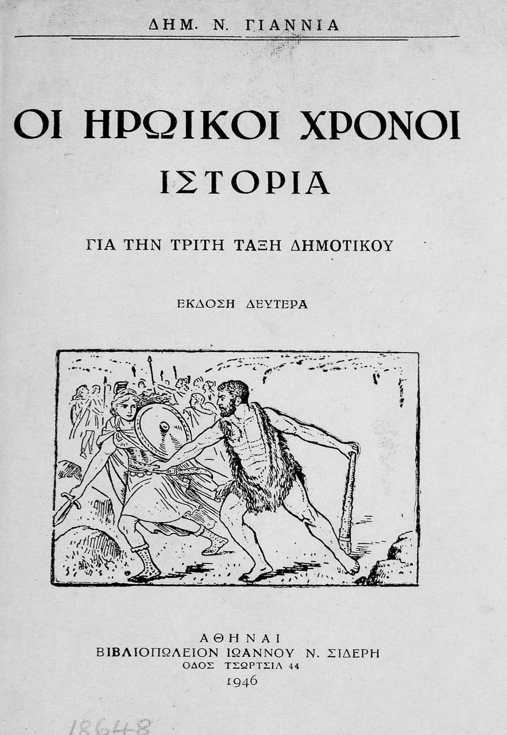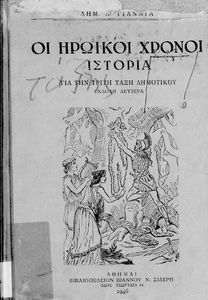 Κωδικός αναγνώρισης: 01-18648 Τίτλος: Οι ηρωικοί χρόνοι. Ιστορία για την Τρίτη Τάξη του Δημοτικού Συγγραφέας: Δημ. Ν. Γιαννιάς Μέγεθος και υπόστρωμα: Μαθητικό βοήθημα, 80 σελίδες. Σκίτσα, εικόνες (ασπρόμαυρα). |