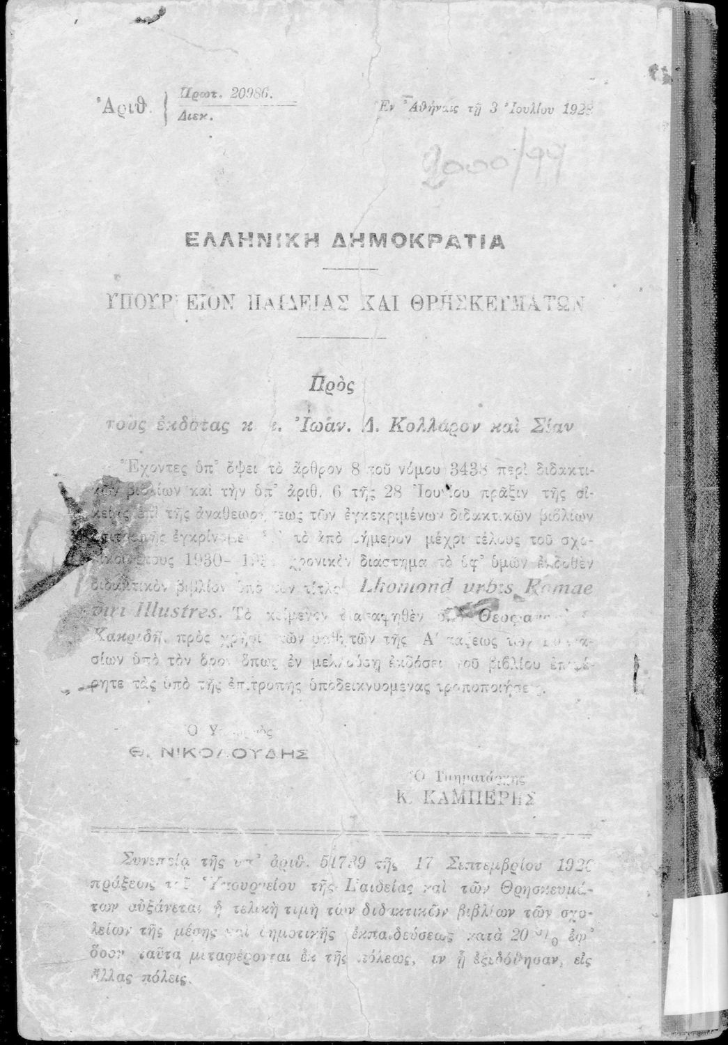 Τίτλος: Urbis Romae viri illustres προς χρήσιν των μαθητών της Α΄ τάξεως των Γυμνασίων