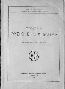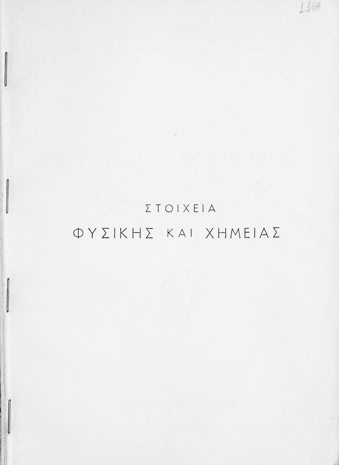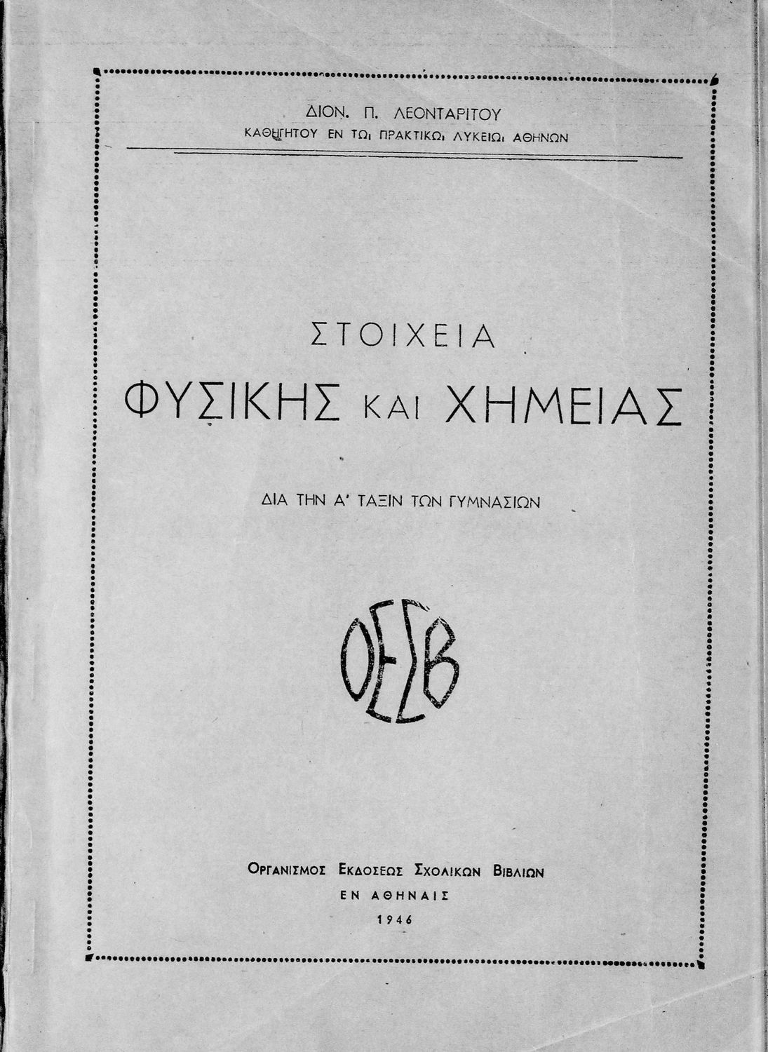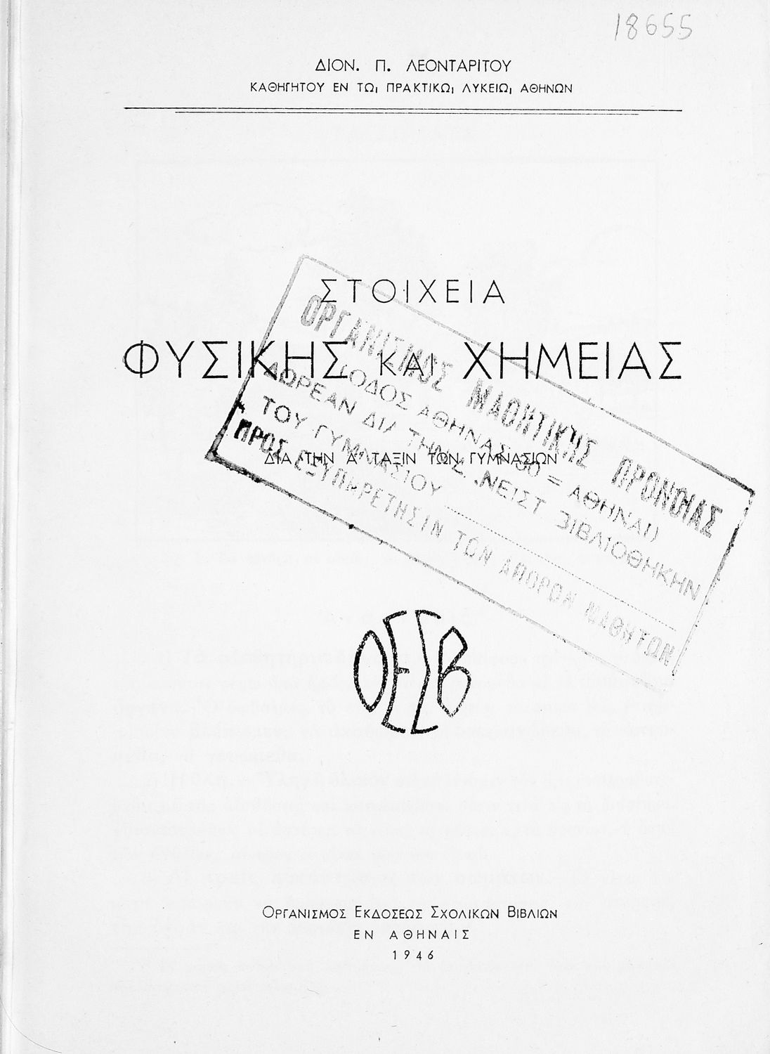 Κωδικός αναγνώρισης: 01-18655 Τίτλος: Στοιχεία Φυσικής και Χημείας δια την Α΄ Τάξιν των Γυμνασίων Συγγραφέας: Διον. Π. Λεονταρίτης Μέγεθος και υπόστρωμα: Σχολικό εγχειρίδιο, μαλακό εξώφυλλο, 175 σελίδες. Σκίτσα, σχεδιαγράμματα (ασπρόμαυρα). |