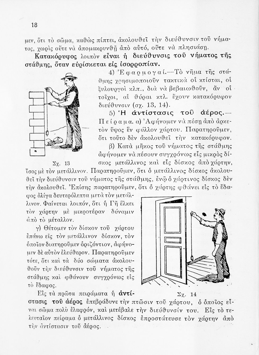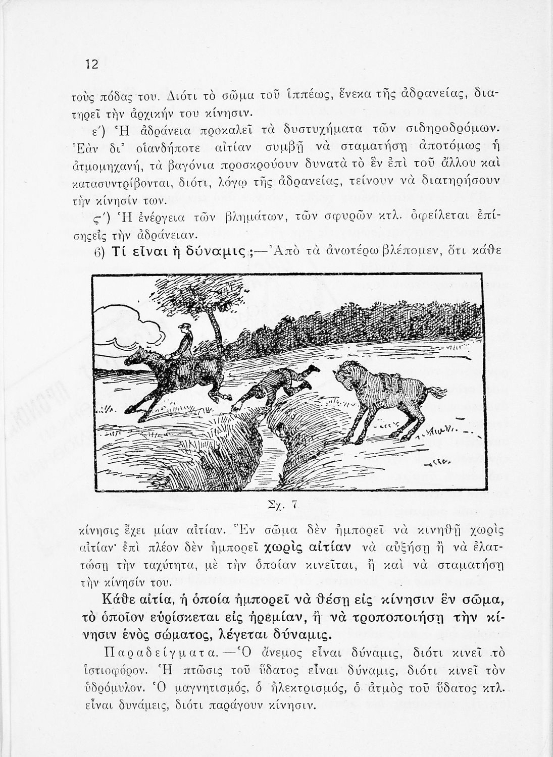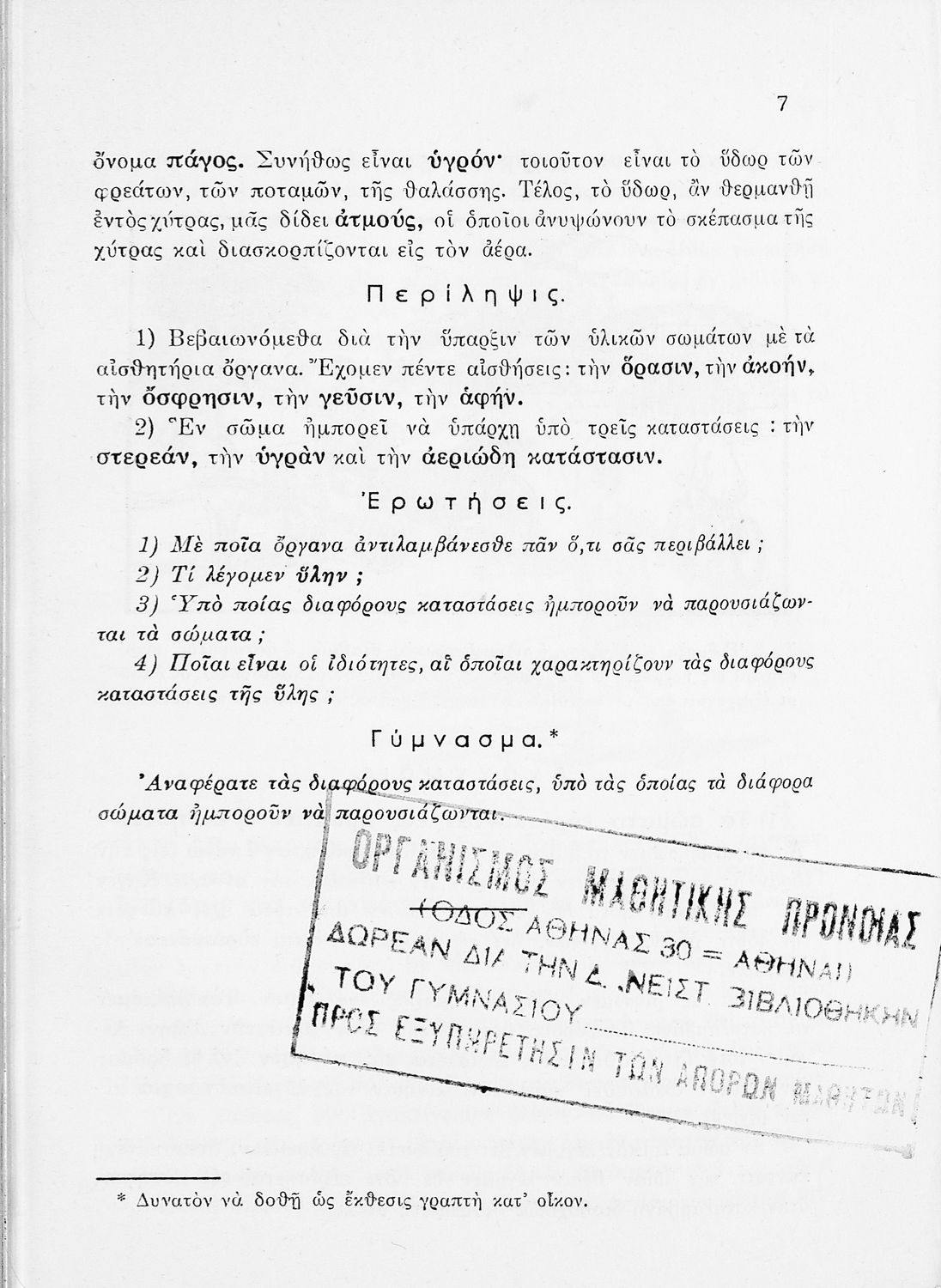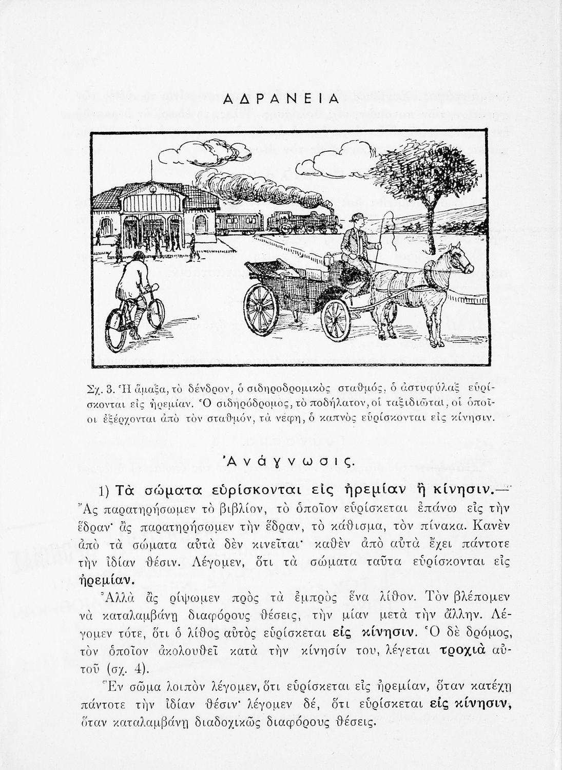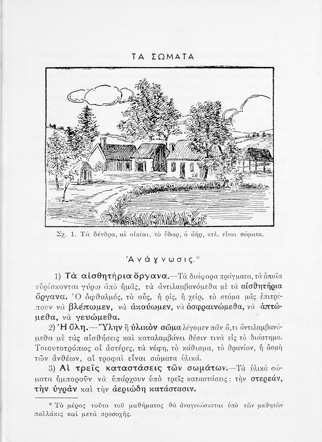 Βαθμίδα εκπαίδευσης: Δευτεροβάθμια Τάξη: Α' Γυμνασίου Μάθημα: Φυσική Γλώσσα: Απλή καθαρεύουσα Παρουσίαση περιεχομένου: Σχολικό εγχειρίδιο της Α΄ Γυμνασίου για το μάθημα της Φυσικής. Παρέχει βασικές γνώσεις της φυσικής επιστήμης. Αναλύει τα φαινόμενα της αδράνειας, της βαρύτητας, της υδροστατικής πίεσης κ.α. Όσον αφορά τη χημεία αναφέρεται στις ιδιότητες των μετάλλων, τα οξέα, τις βάσεις και τα άλατα. Αναφέρεται στην πρακτική εφαρμογή της φυσικής και της χημείας στην καθημερινότητά. Επίσης, περιλαμβάνει πολλά από τα όργανα, που χρησιμοποιούνται στη φυσική. Περιέχει εικόνες και σχεδιαγράμματα τα οποία βοηθούν τη διδασκαλία. |