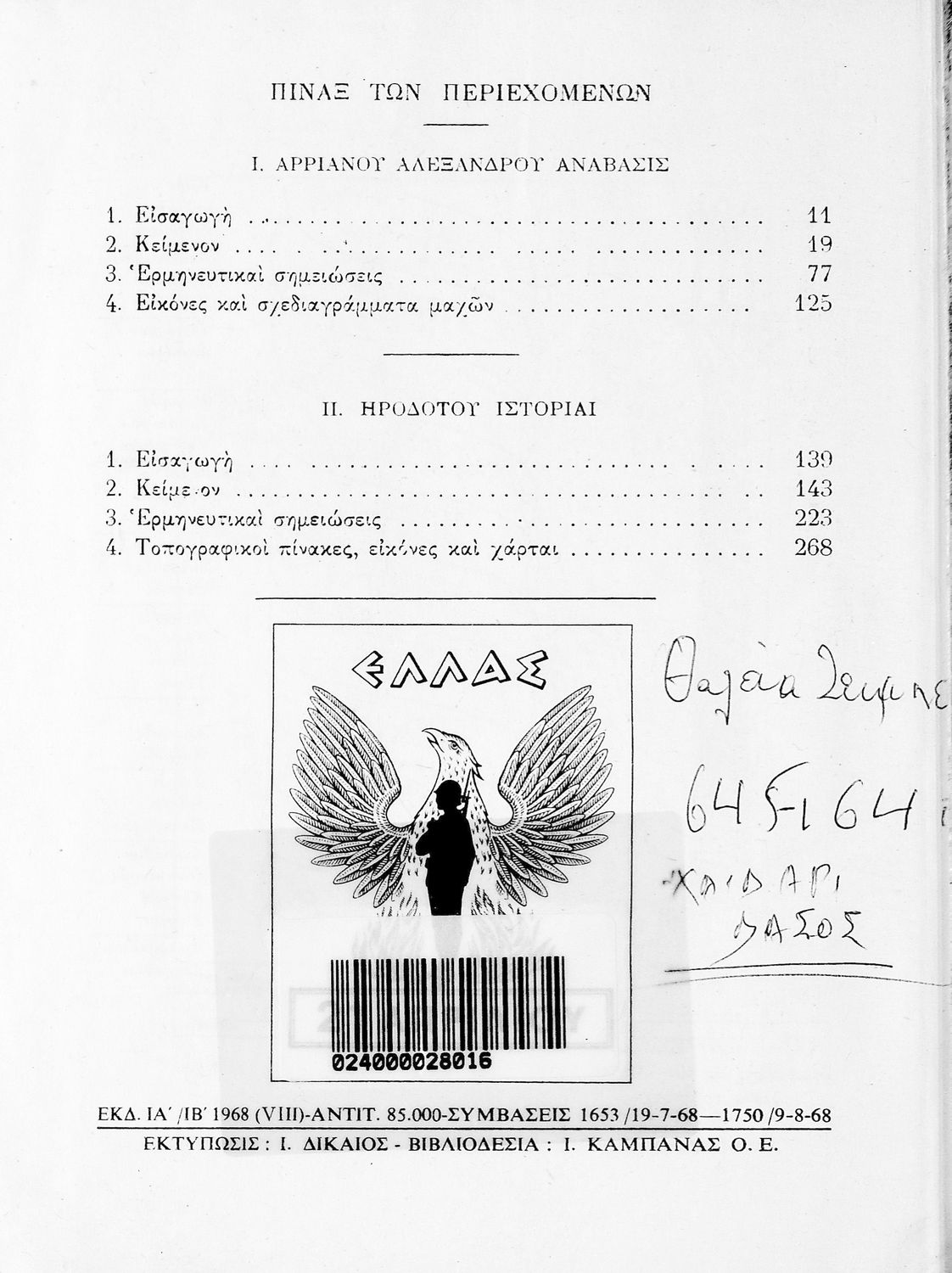 Σχολικό εγχειρίδιο Αρχαίων Ελληνικών που περιλαμβάνει αποσπάσματα από το έργο του Αρριανού Αλέξανδρου Ανάβασις και του Ηρόδοτου Ιστορίαι, ερμηνευτικές και λεξιλογικές παρατηρήσεις καθώς και τοπογραφικούς πίνακες και χάρτες..