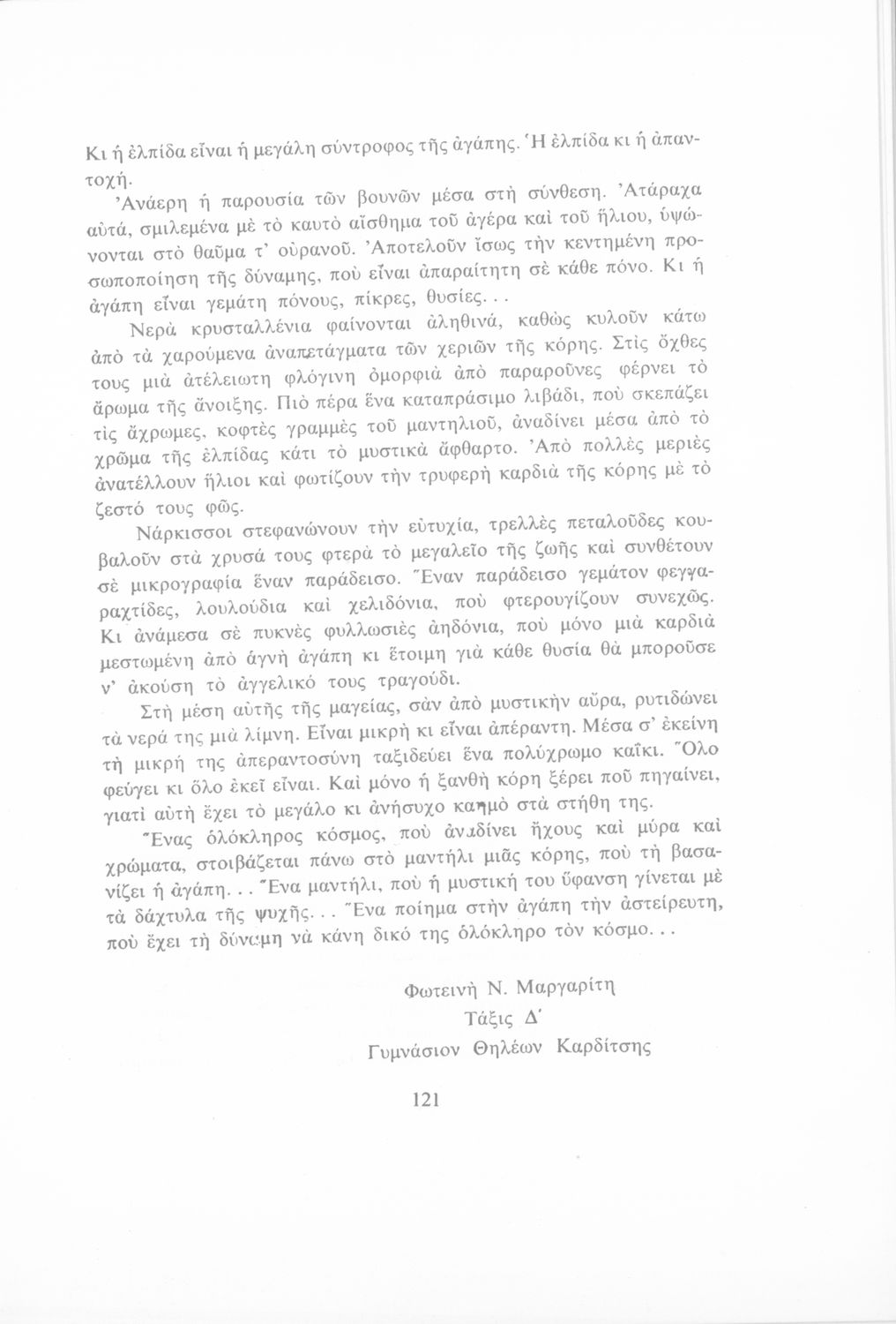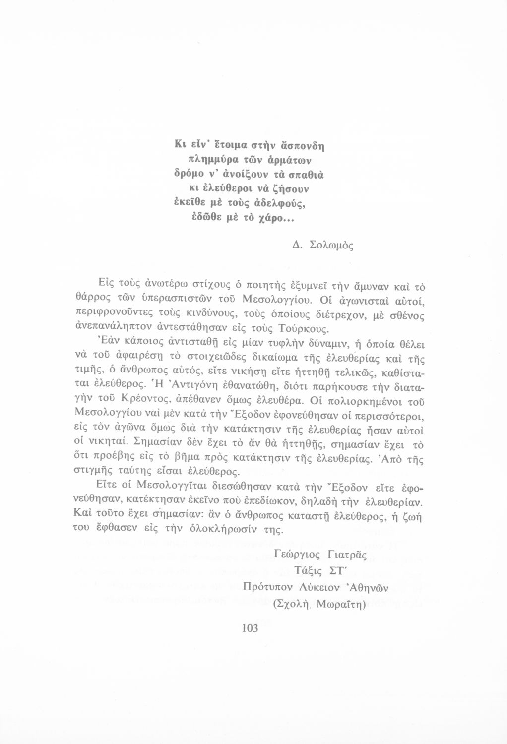 Έκδοση του Υπουργείου Εθνικής Παιδείας και Θρησκευμάτων που περιέχει κείμενα μαθητών και συγγραφέων με θέμα την Ελληνική Επανάσταση του ΄ 21. Περιλαμβάνει και σχέδια από την Α΄ Πανελλήνια Έκθεση των σχολείων Μ.Ε. του 1971.
