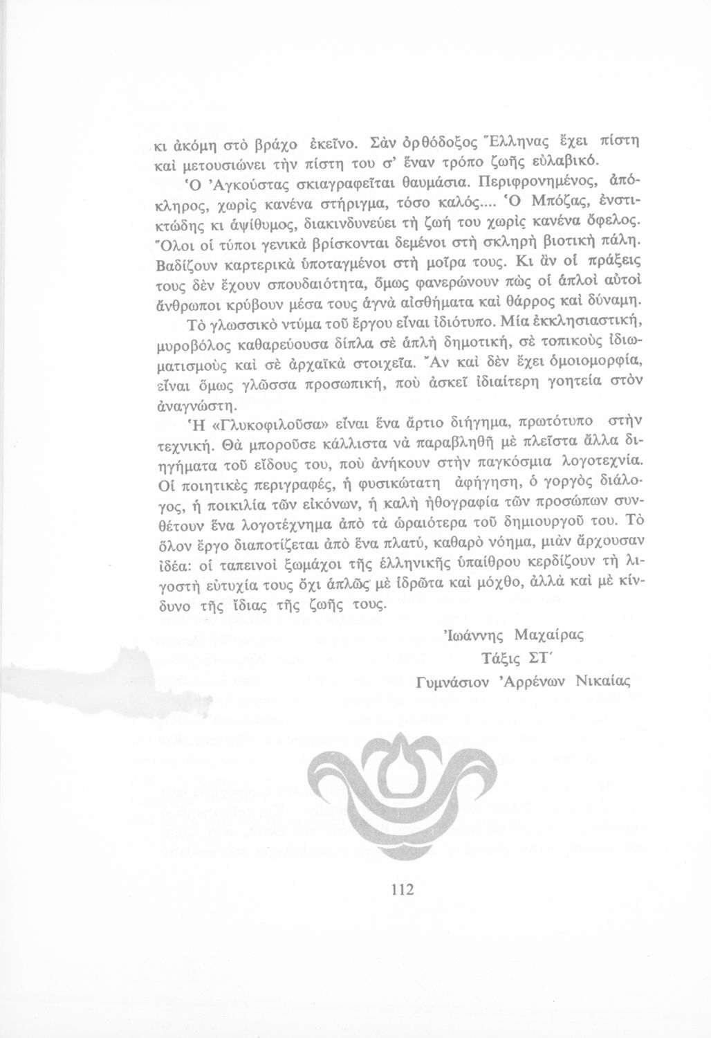 Σχολικό εγχειρίδιο Νέων Ελληνικών για τη Δευτεροβάθμια Εκπαίδευση που περιέχει κείμενα από την ελληνική πεζογραφία και την κρητική λογοτεχνία καθώς και δημοτικά τραγούδια εμπνευσμένα από την εθνική ζωή του ...