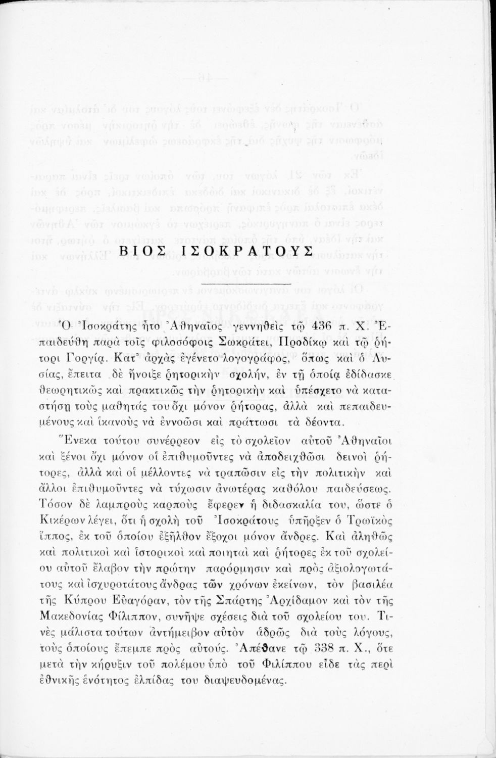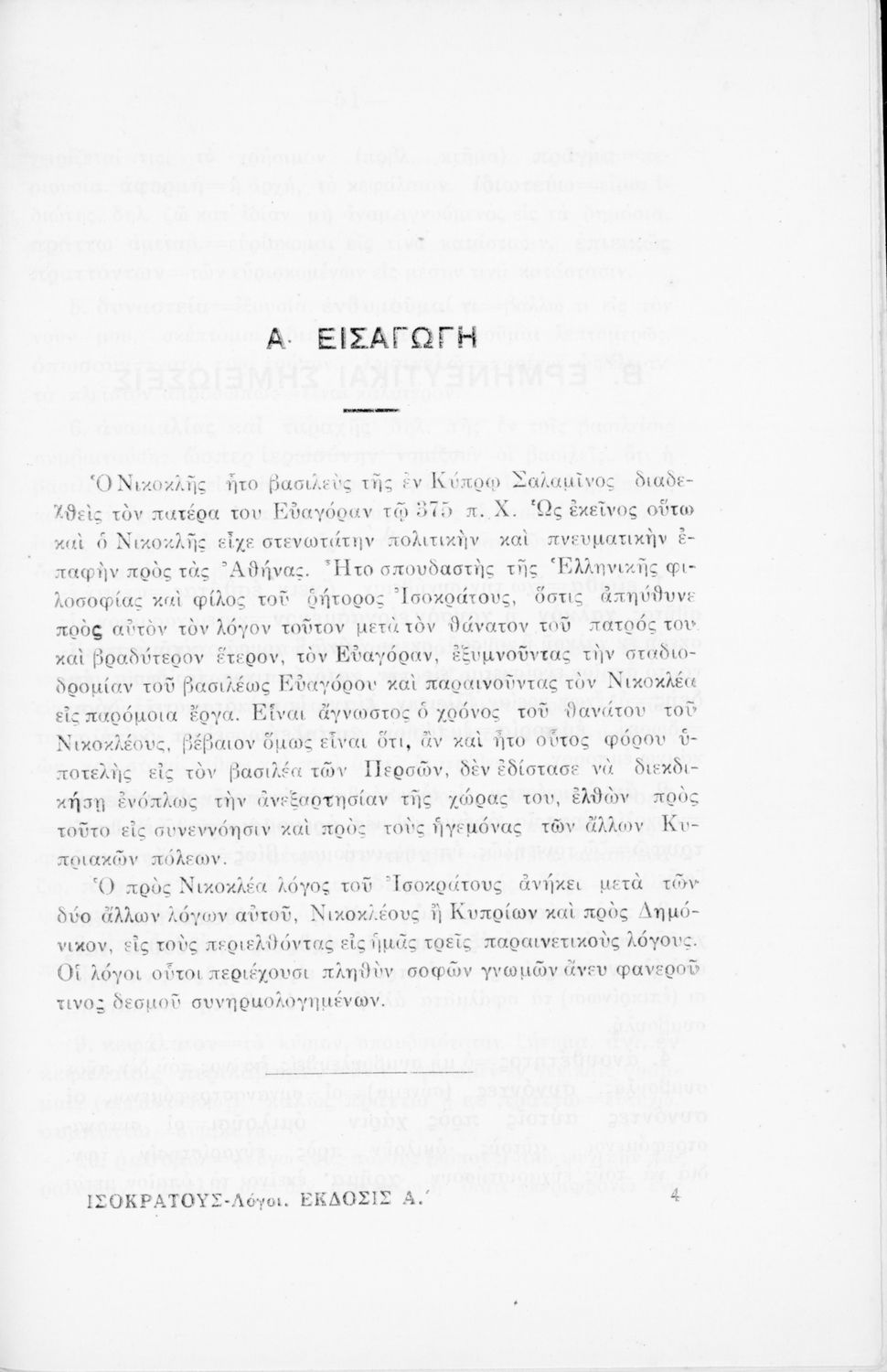 Σχολικό εγχειρίδιο Αρχαίων Ελληνικών Γ΄ Γυμνασίου που περιλαμβάνει σύντομο βιογραφικό σημείωμα του Ισοκράτη, τους Λόγους του Προς Νικοκλέα και Ευαγόρας και ερμηνευτικά και λεξιλογικά σχόλια.