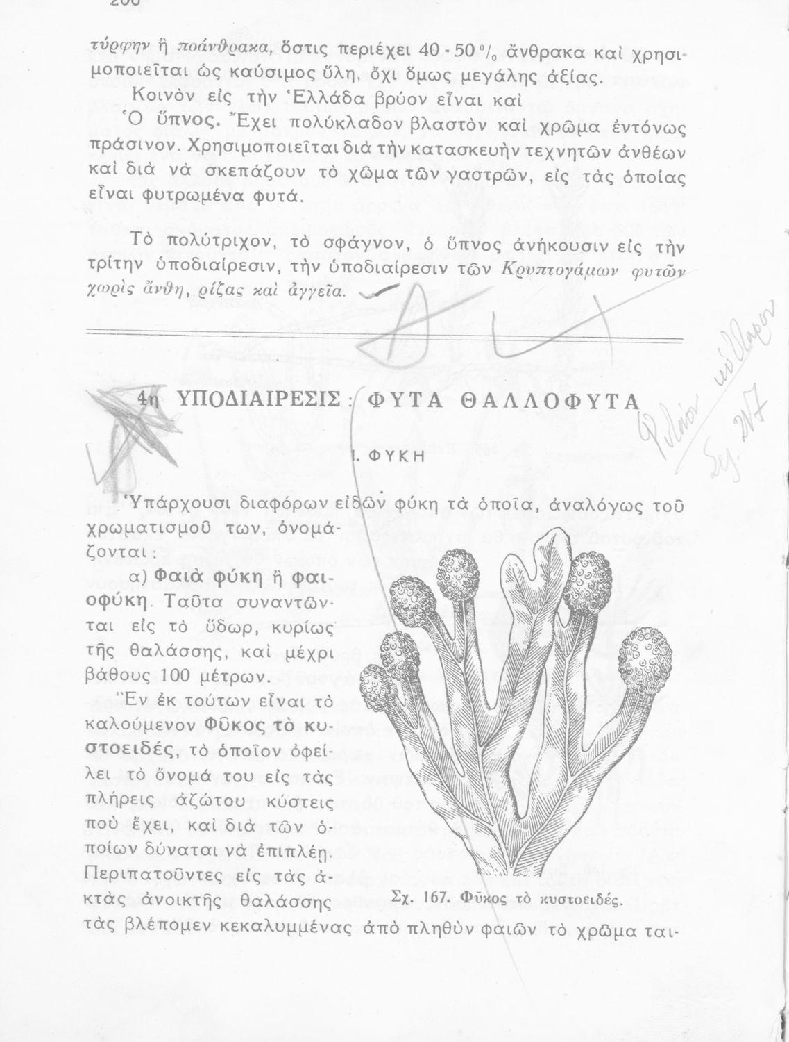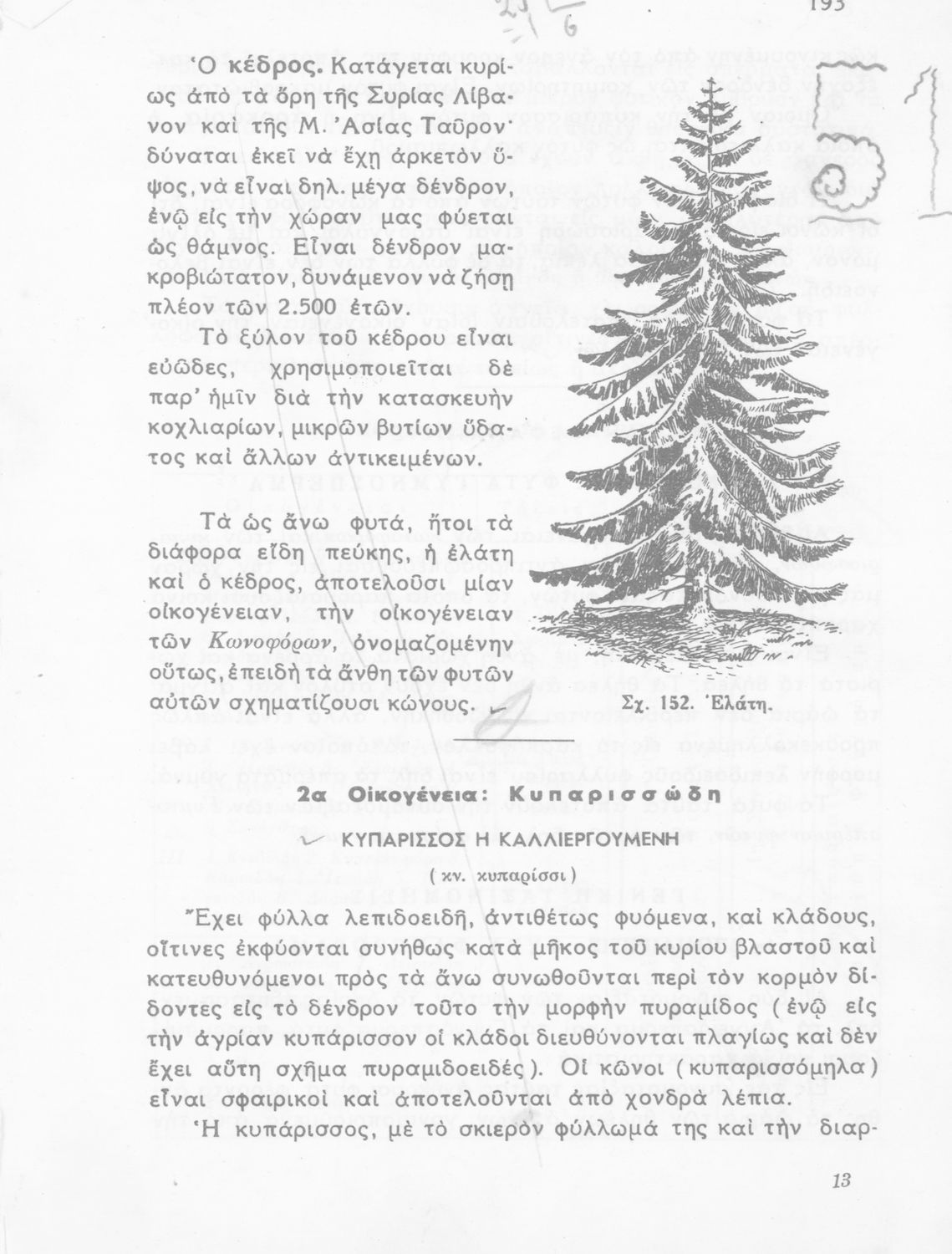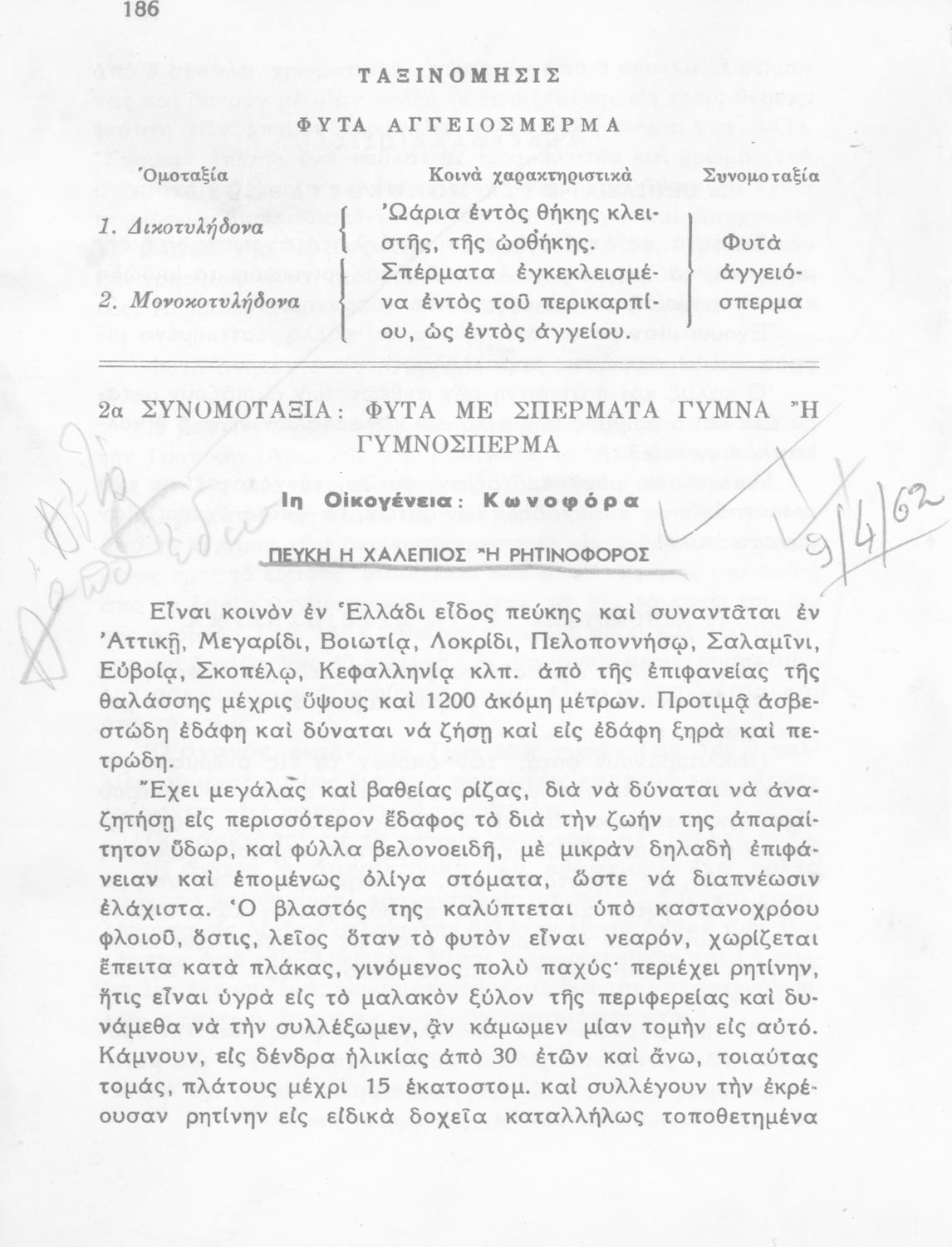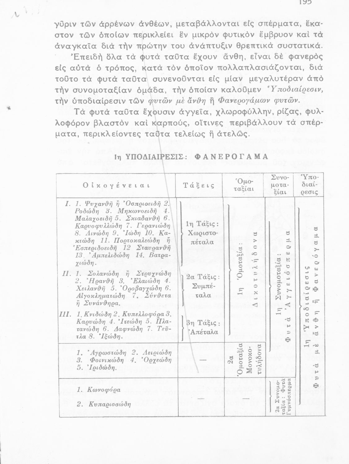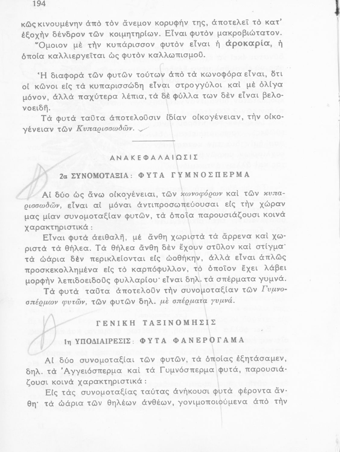 Παρουσίαση περιεχομένου: Σχολικό εγχειρίδιο Φυτολογίας που εξετάζει φυτά και δέντρα της Ελλάδας ανάλογα με τη συνομοταξία στην οποία ανήκουν και παρέχει πληροφορίες για την αναπαραγωγή τους και τη χρησιμότητά τους για τον άνθρωπο.