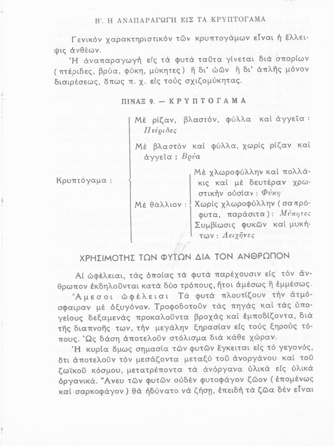 Παρουσίαση περιεχομένου: Σχολικό εγχειρίδιο Φυτολογίας που εξετάζει φυτά και δέντρα της Ελλάδας ανάλογα με τη συνομοταξία στην οποία ανήκουν και παρέχει πληροφορίες για την αναπαραγωγή τους και τη χρησιμότητά τους για τον άνθρωπο.