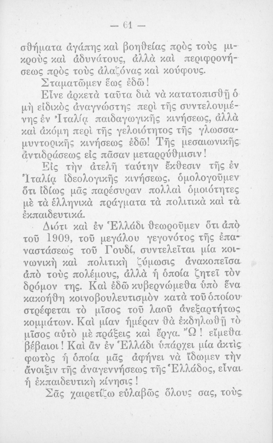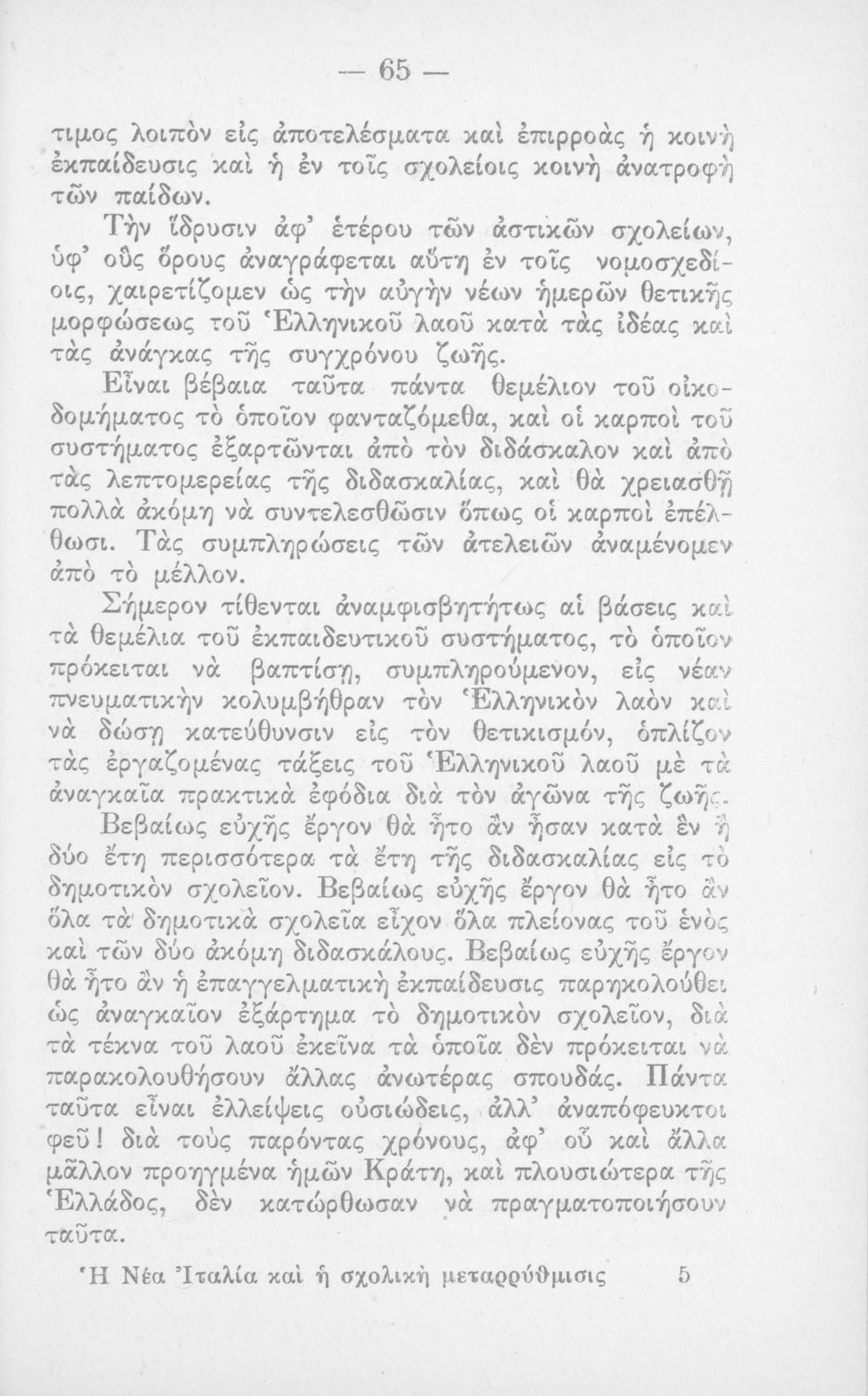 Γλώσσα: Δημοτική Παρουσίαση περιεχομένου: Παιδαγωγικό βοήθημα που αναφέρεται στην εκπαιδευτική κατάσταση της Ιταλίας. Περιλαμβάνει και προτάσεις του συγγραφέα για ελληνικά εκπαιδευτικά ζητήματα. |