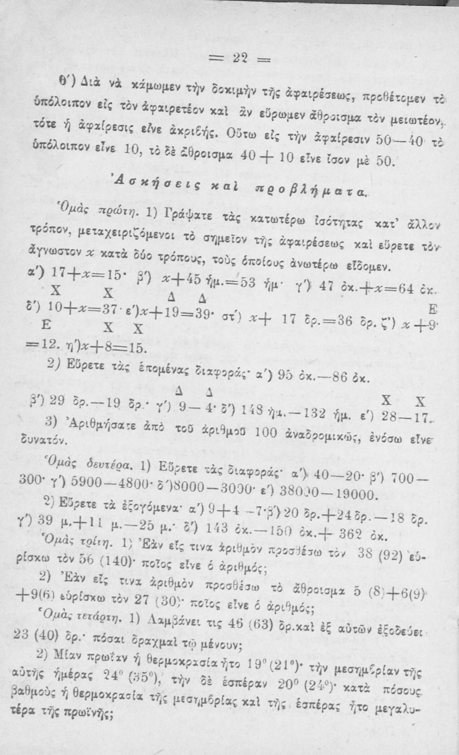 Βαθμίδα εκπαίδευσης: Δευτεροβάθμια Τάξη: Ελληνικό Σχολείο / Αστικό Σχολείο / Ανώτερα Παρθεναγωγεία Μάθημα: Μαθηματικά Γλώσσα: Απλή καθαρεύουσα Παρουσίαση περιεχομένου: Σχολικό εγχειρίδιο Αριθμητικής για τα Ελληνικά και Αστικά Σχολεία και τα Ανώτερα Παρθεναγωγεία που εστιάζει στις αριθμητικές πράξεις με ακέραιους αριθμούς και κλάσματα και περιλαμβάνει στοιχεία λογιστικής και καταστιχογραφίας. Ο συγγραφέας ήταν καθηγητής στο Πανεπιστήμιο Αθηνών. |