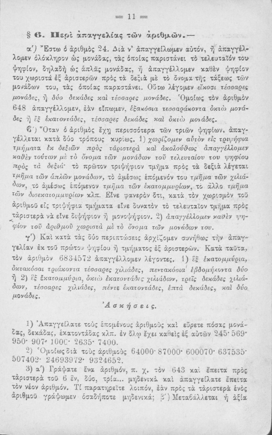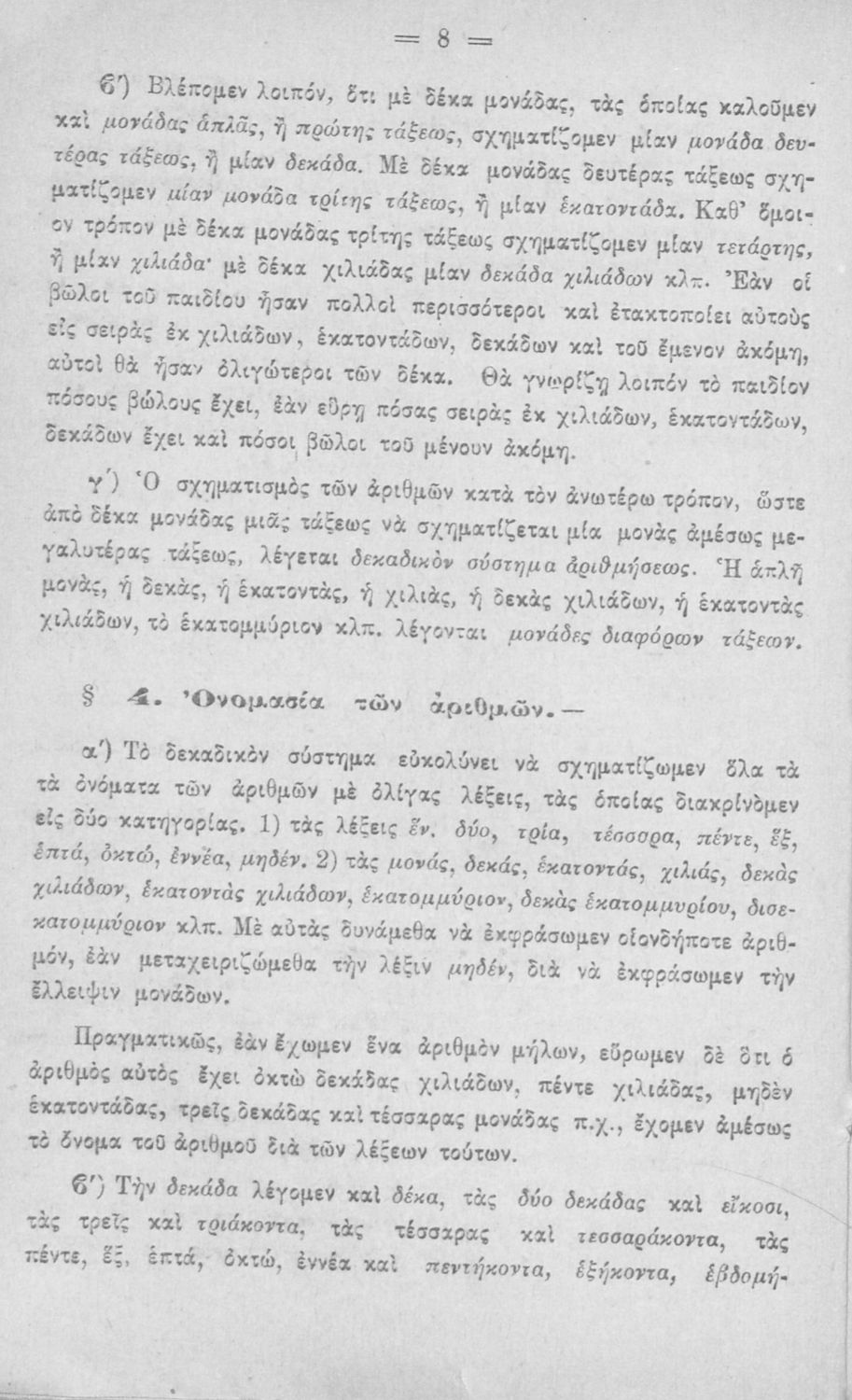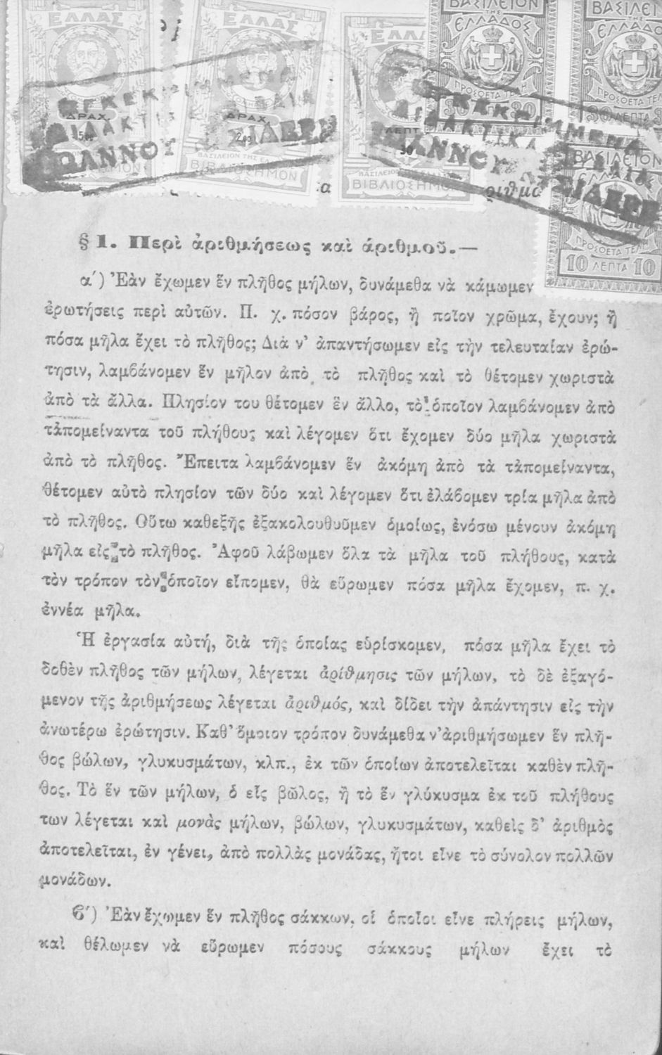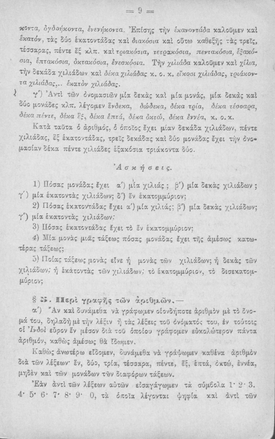 Σχολικό εγχειρίδιο Αριθμητικής για τα Ελληνικά και Αστικά Σχολεία και τα Παρθεναγωγεία που εστιάζει στις αριθμητικές πράξεις, τα κλάσματα, τους δεκαδικούς και συμμιγείς αριθμούς, και τις δυνάμεις. Περιέχει και
