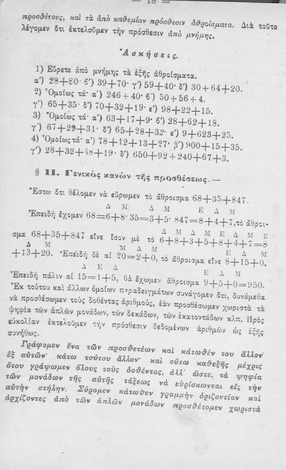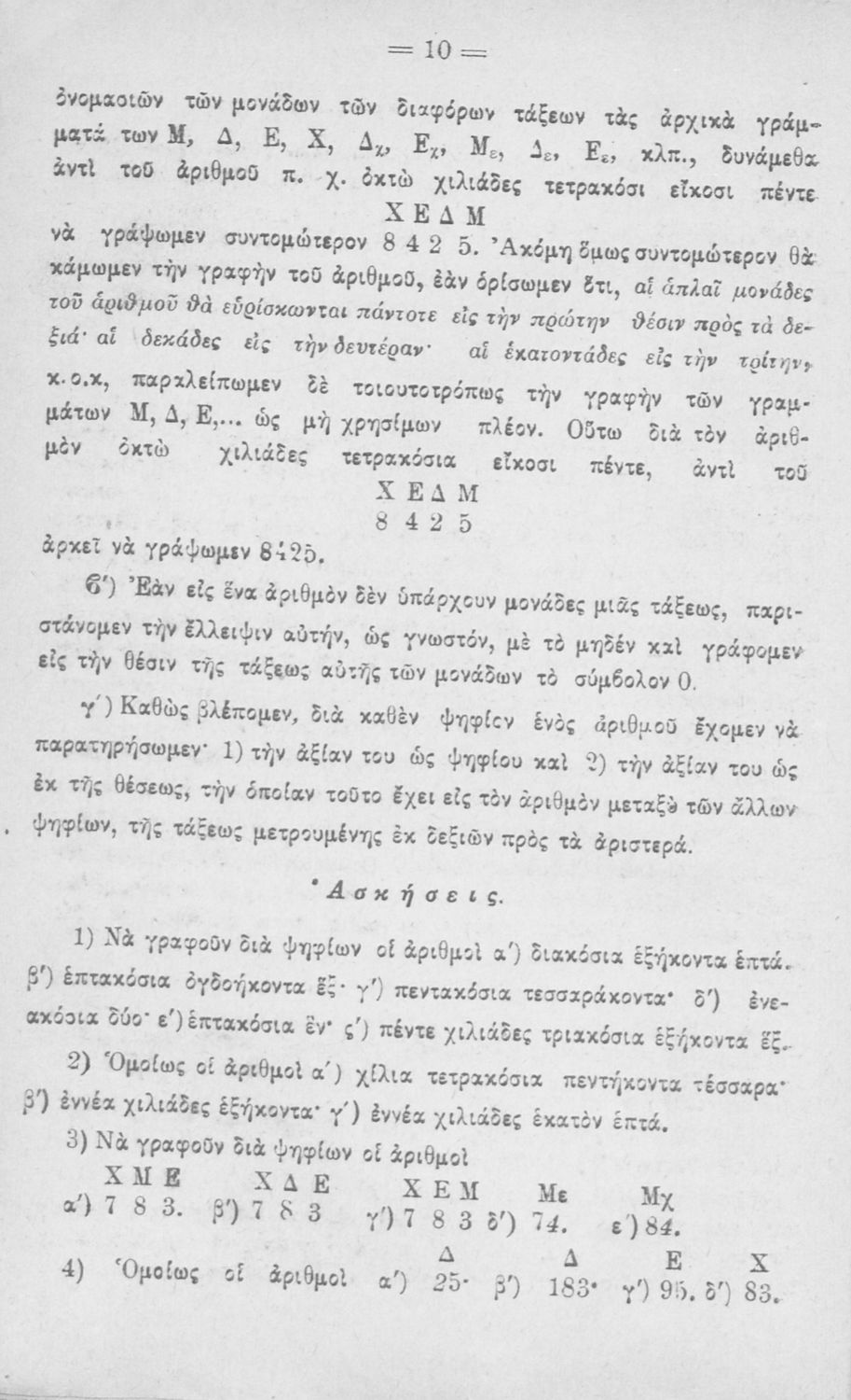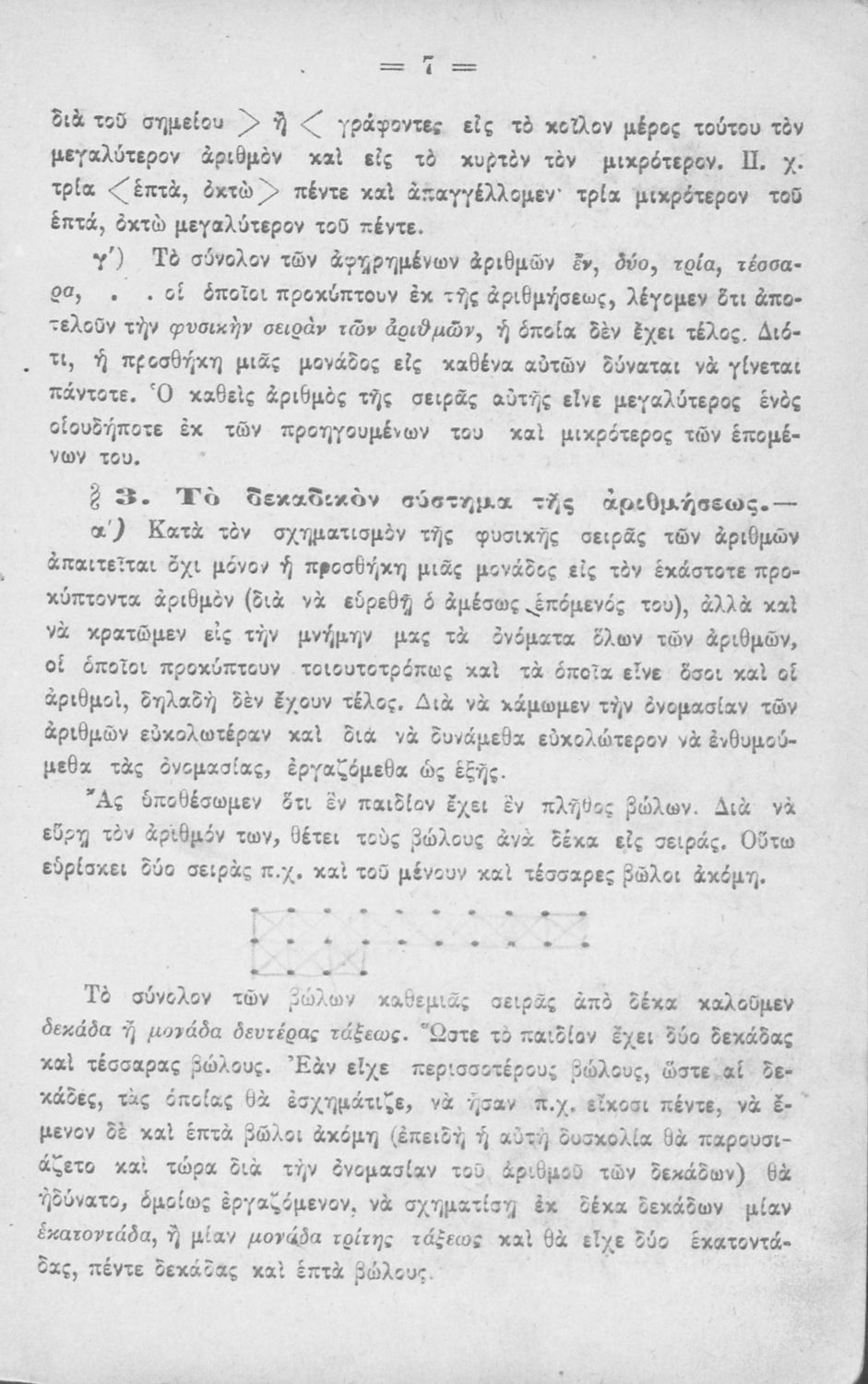 Σχολικό εγχειρίδιο Αριθμητικής για τα Ελληνικά και Αστικά Σχολεία και τα Παρθεναγωγεία που εστιάζει στις αριθμητικές πράξεις, τα κλάσματα, τους δεκαδικούς και συμμιγείς αριθμούς, και τις δυνάμεις. Περιέχει και