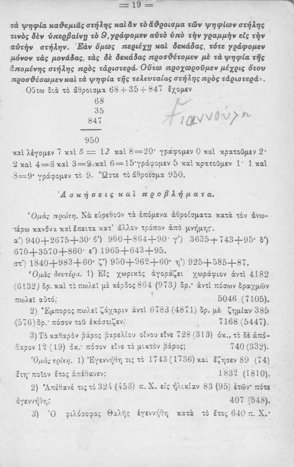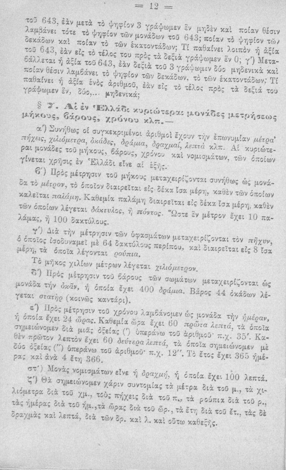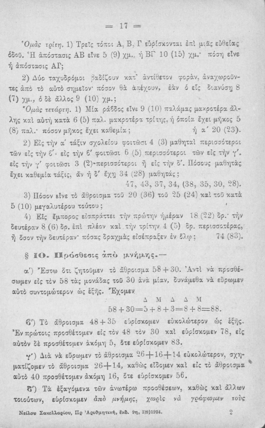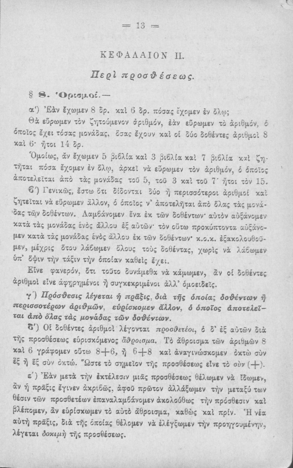 Σχολικό εγχειρίδιο Αριθμητικής για τα Ελληνικά και Αστικά Σχολεία και τα Παρθεναγωγεία που εστιάζει στις αριθμητικές πράξεις, τα κλάσματα, τους δεκαδικούς και συμμιγείς αριθμούς, και τις δυνάμεις. Περιέχει και