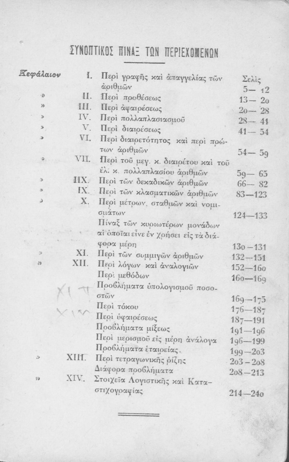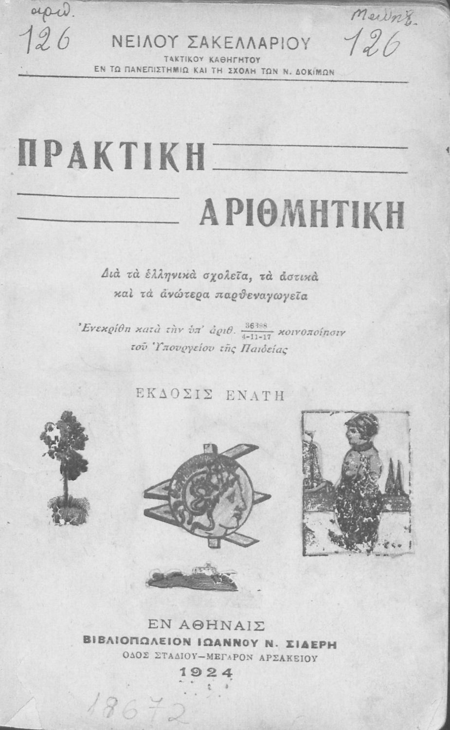 Σχολικό εγχειρίδιο Αριθμητικής για τα Ελληνικά και Αστικά Σχολεία και τα Ανώτερα Παρθεναγωγεία που εστιάζει στις αριθμητικές πράξεις με ακέραιους αριθμούς και κλάσματα και περιλαμβάνει στοιχεία λογιστικής και καταστιχογραφίας. Ο συγγραφέας ήταν καθηγητής στο Πανεπιστήμιο Αθηνών.