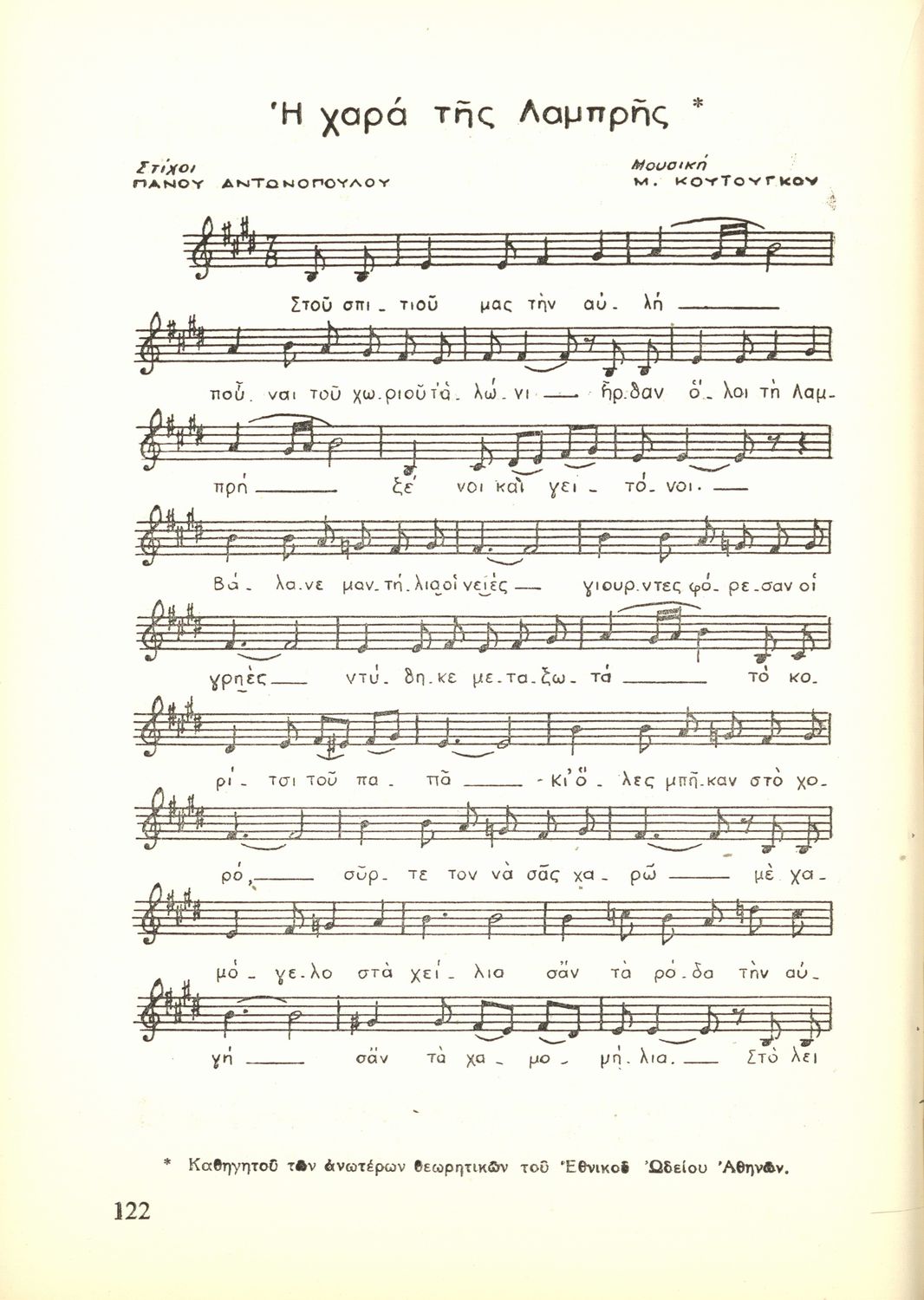 Σχολικό εγχειρίδιο Μουσικής του 1937. Περιέχει σχολικά τραγούδια με θέματα από τη θρησκεία, την πατρίδα και τη ζωή.