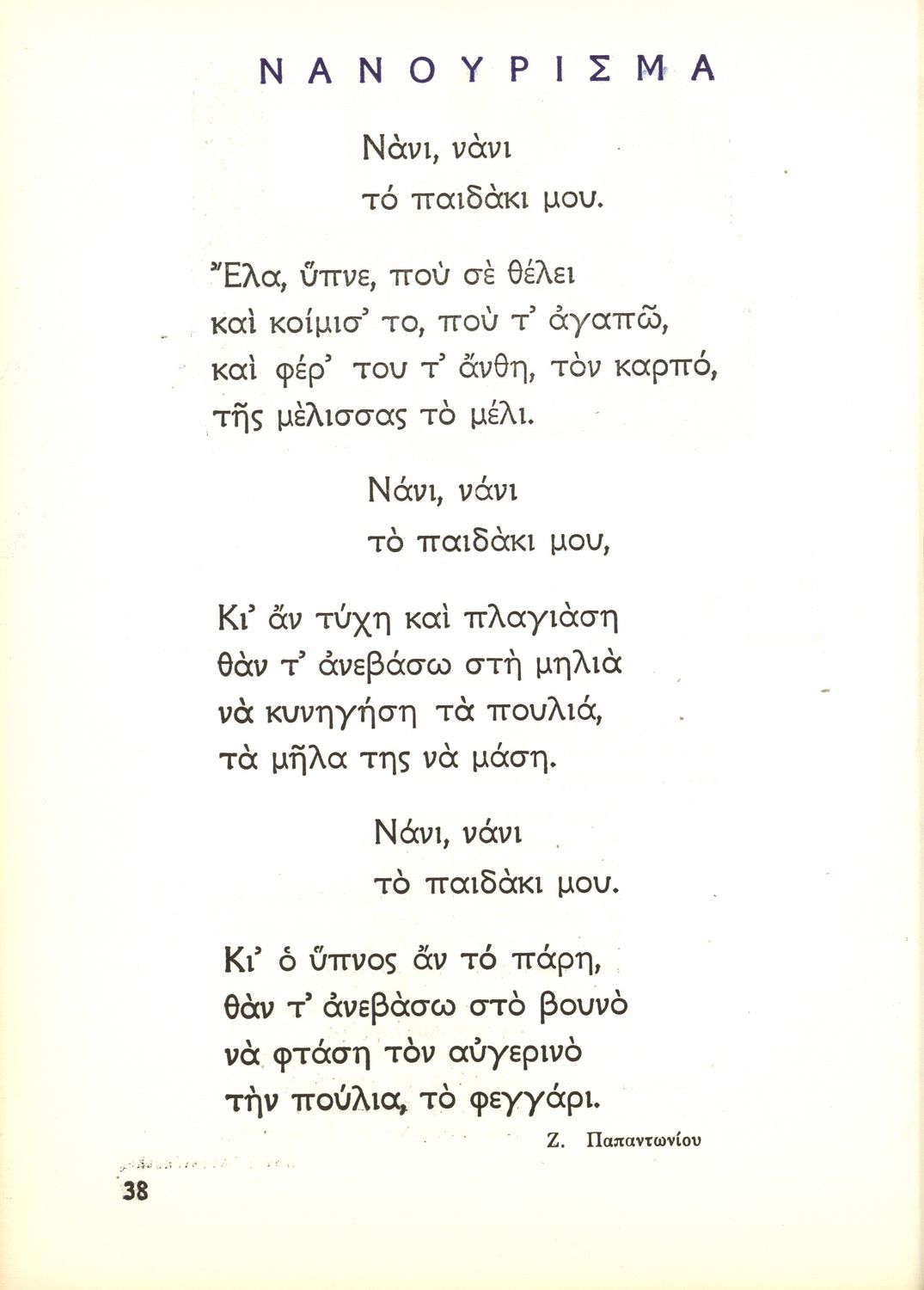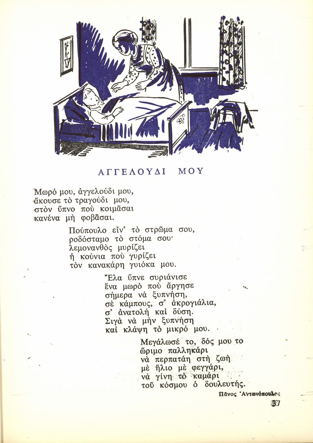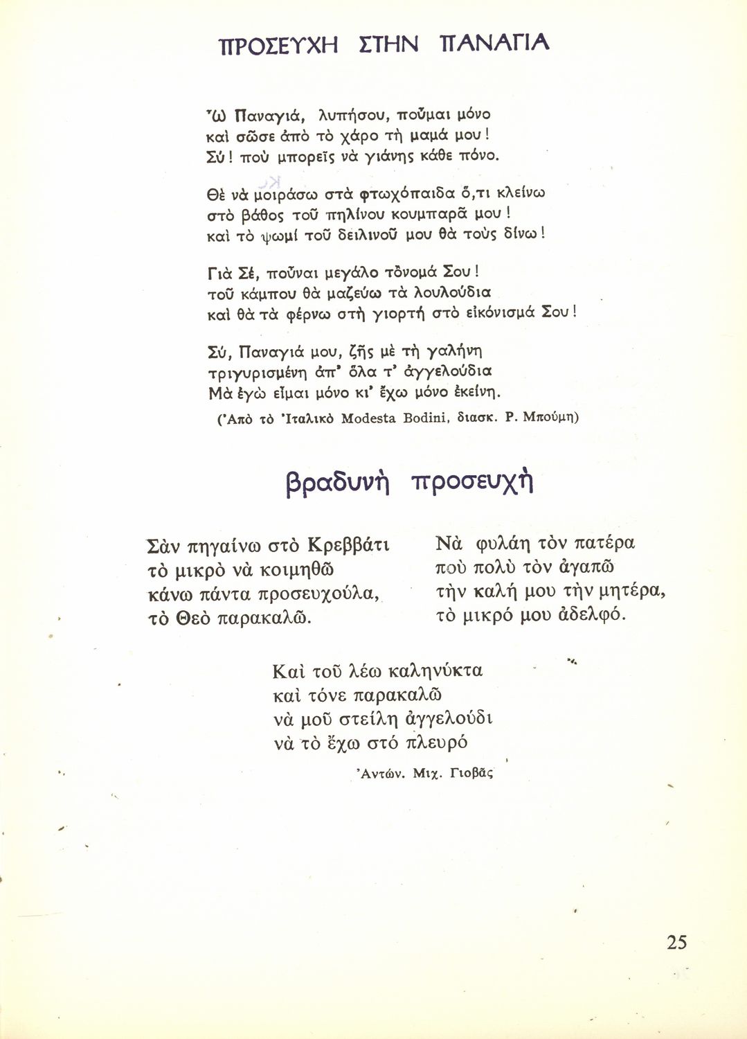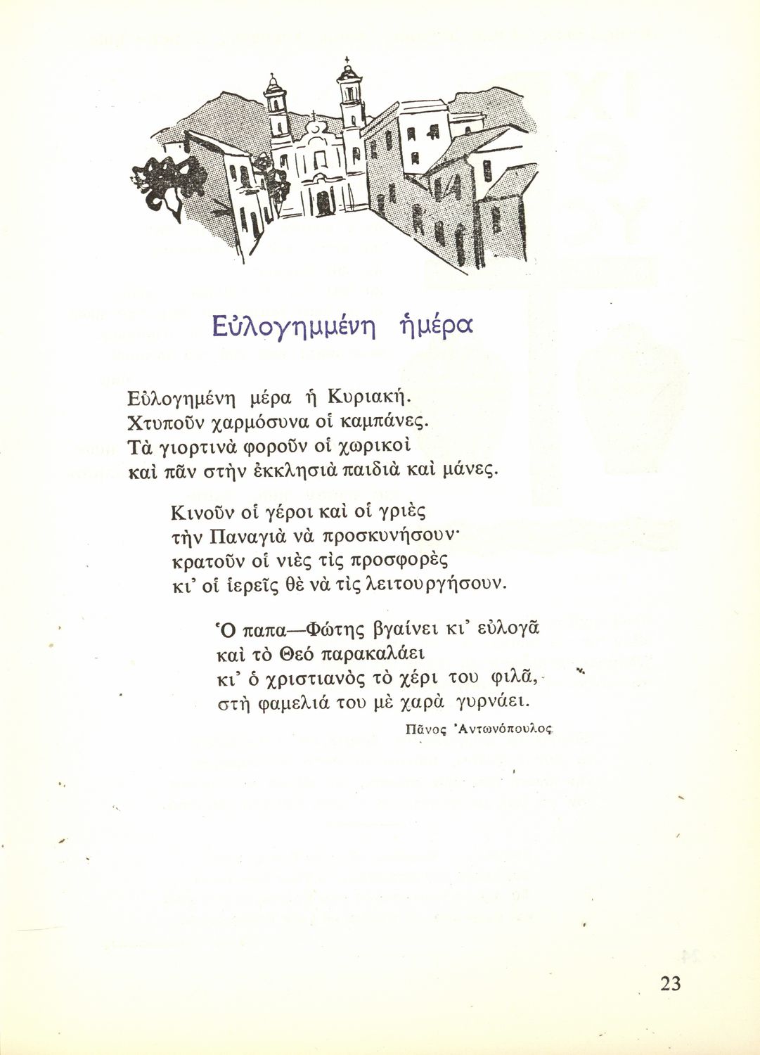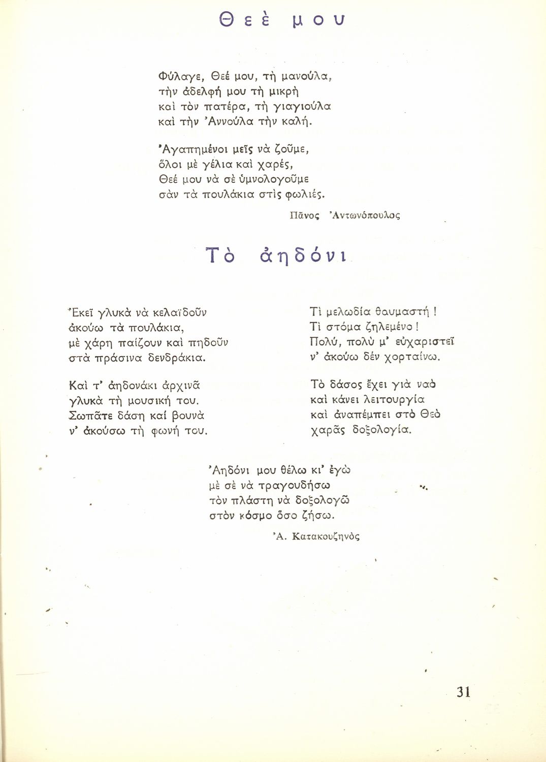 Σχολικό εγχειρίδιο Μουσικής για τις Α΄, Β΄, Γ΄, Δ΄ τάξεις του Δημοτικού. Το βιβλίο περιέχει τραγούδια και προσευχές με διάφορα θέματα. Ο συγγραφέας υπήρξε Δημοδιδάσκαλος της Μαρασλείου Παιδαγωγικής Ακαδημίας.