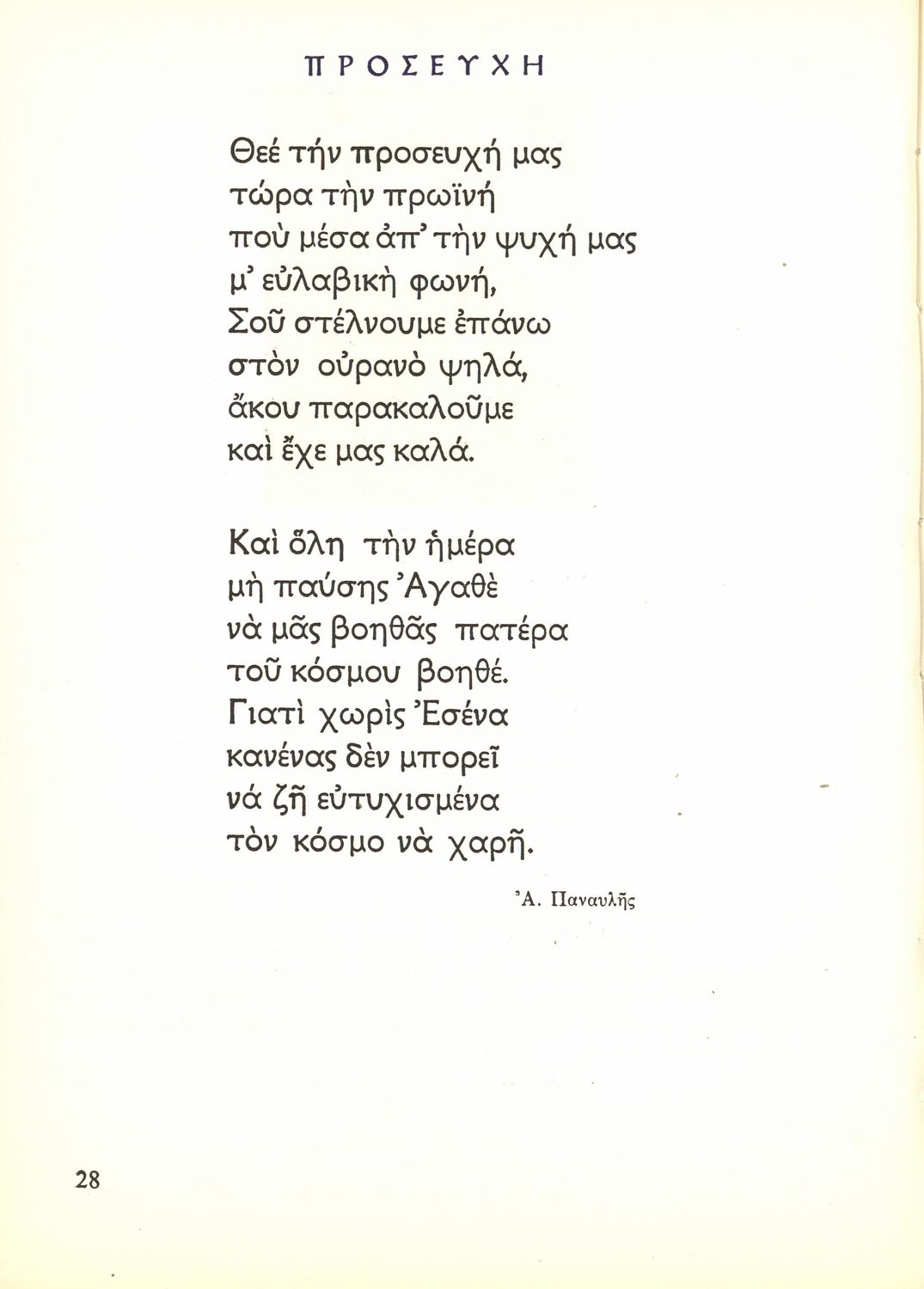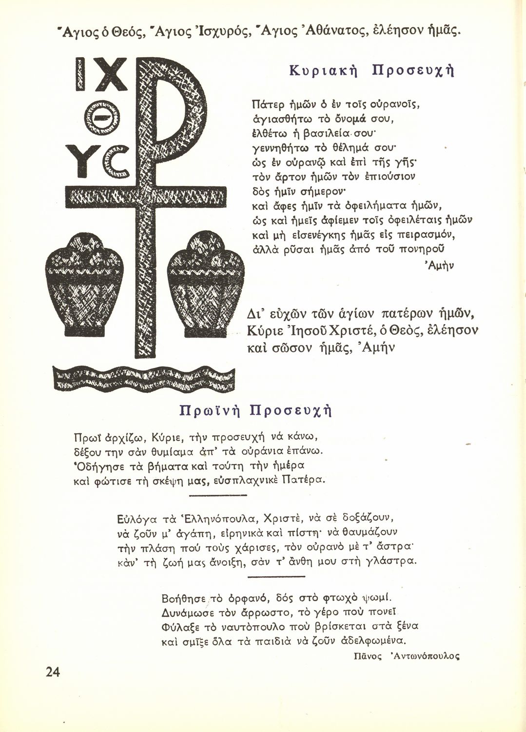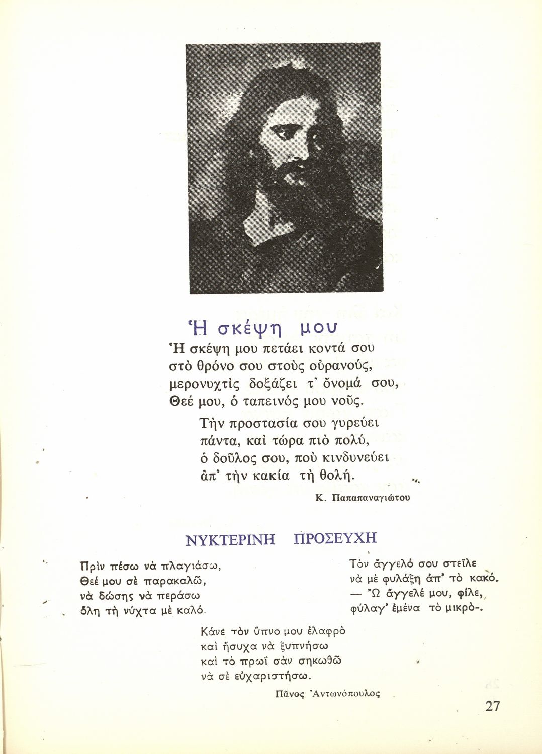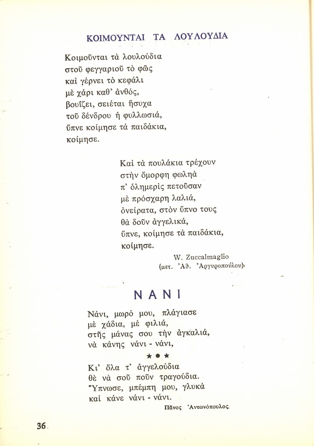 Σχολικό εγχειρίδιο Μουσικής για τις Α΄, Β΄, Γ΄, Δ΄ τάξεις του Δημοτικού. Το βιβλίο περιέχει τραγούδια και προσευχές με διάφορα θέματα. Ο συγγραφέας υπήρξε Δημοδιδάσκαλος της Μαρασλείου Παιδαγωγικής Ακαδημίας.