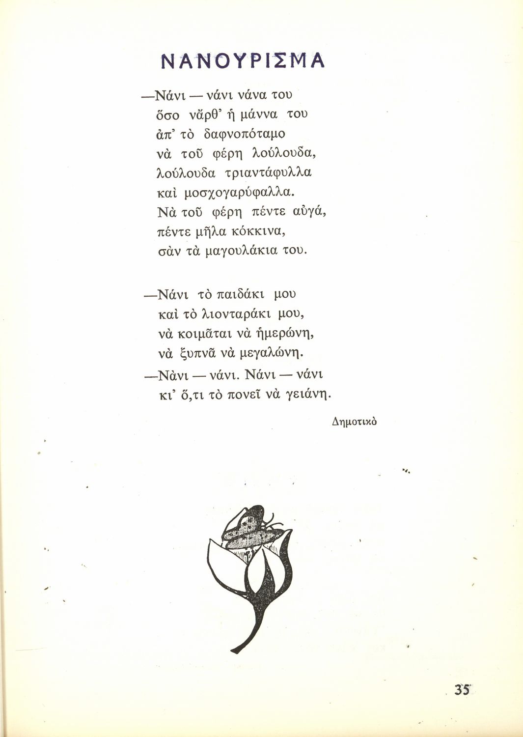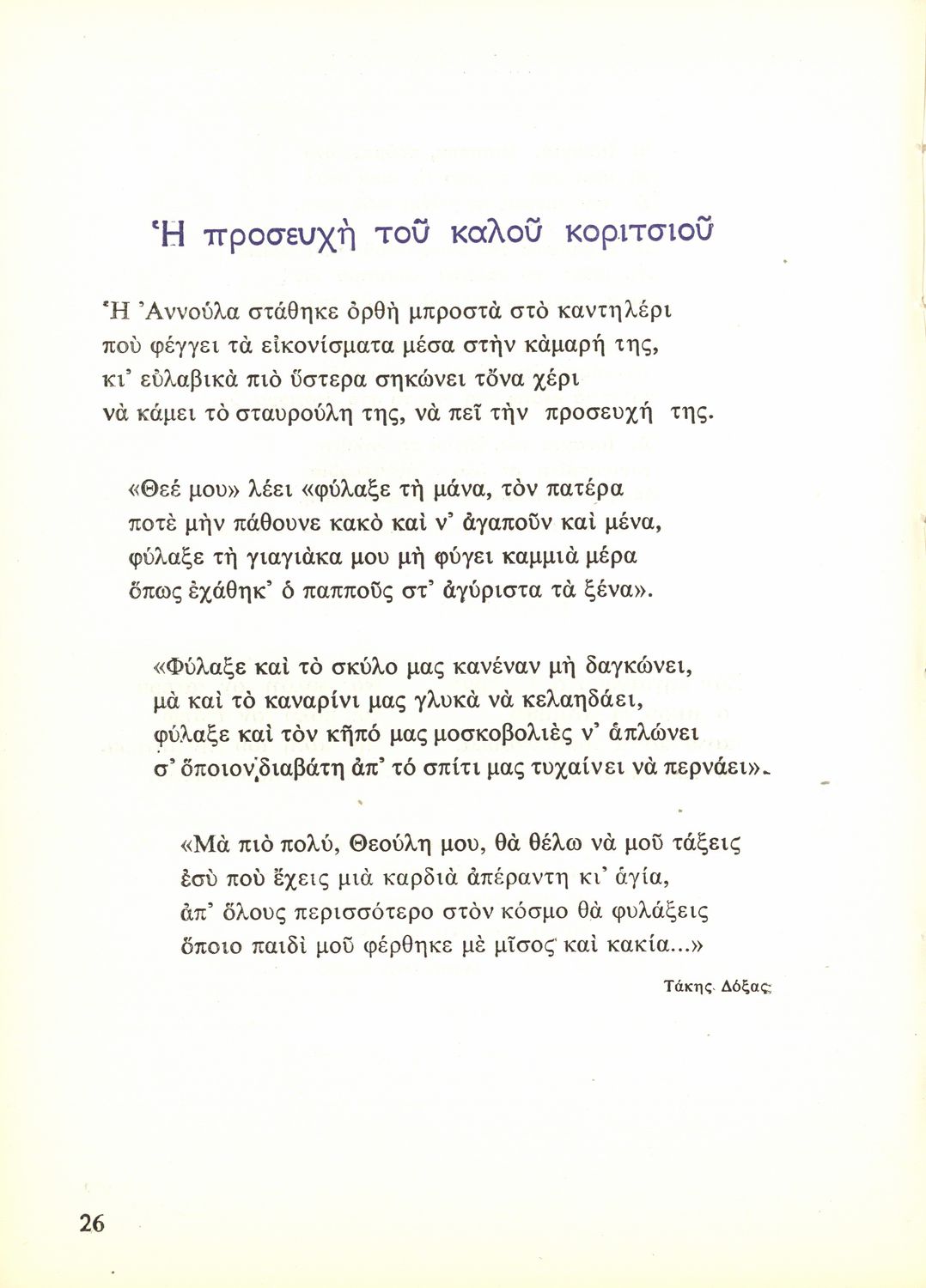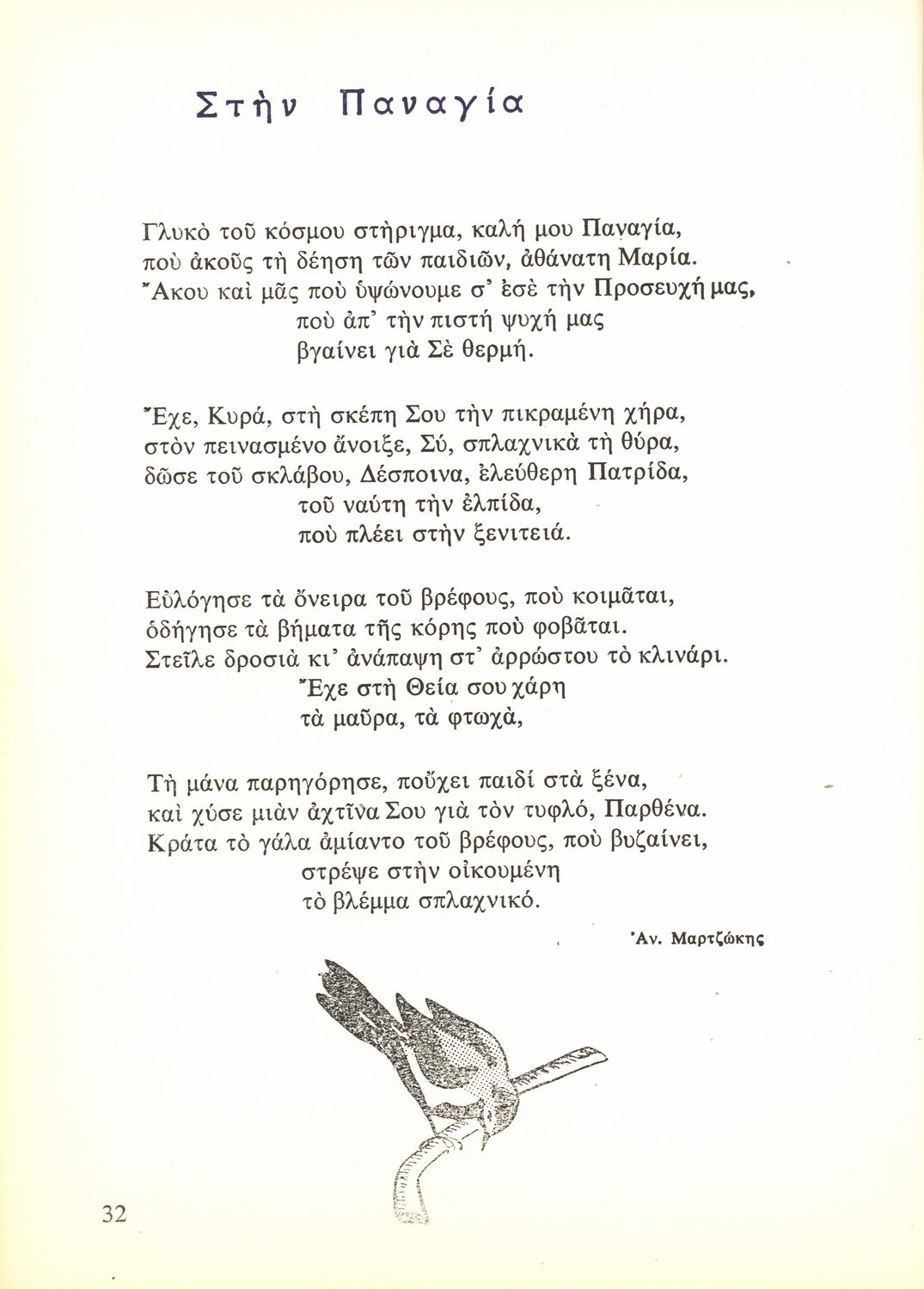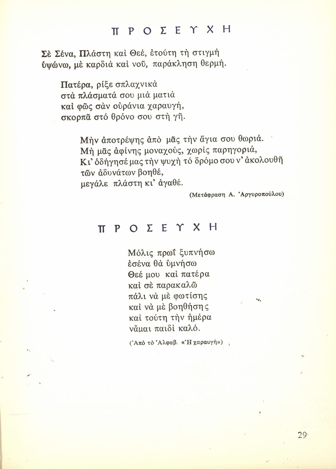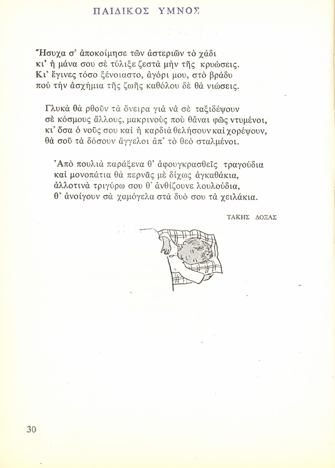 Σχολικό εγχειρίδιο Μουσικής για τις Α΄, Β΄, Γ΄, Δ΄ τάξεις του Δημοτικού. Το βιβλίο περιέχει τραγούδια και προσευχές με διάφορα θέματα. Ο συγγραφέας υπήρξε Δημοδιδάσκαλος της Μαρασλείου Παιδαγωγικής Ακαδημίας.