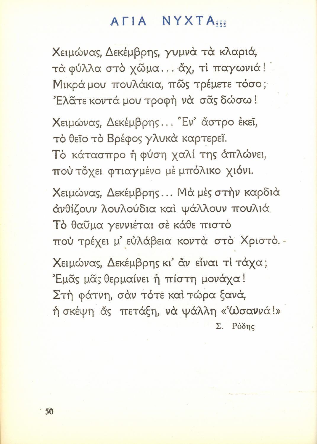Σχολικό εγχειρίδιο Μουσικής για τις Α΄, Β΄, Γ΄, Δ΄ τάξεις του Δημοτικού. Το βιβλίο περιέχει τραγούδια και προσευχές με διάφορα θέματα. Ο συγγραφέας υπήρξε Δημοδιδάσκαλος της Μαρασλείου Παιδαγωγικής Ακαδημίας.