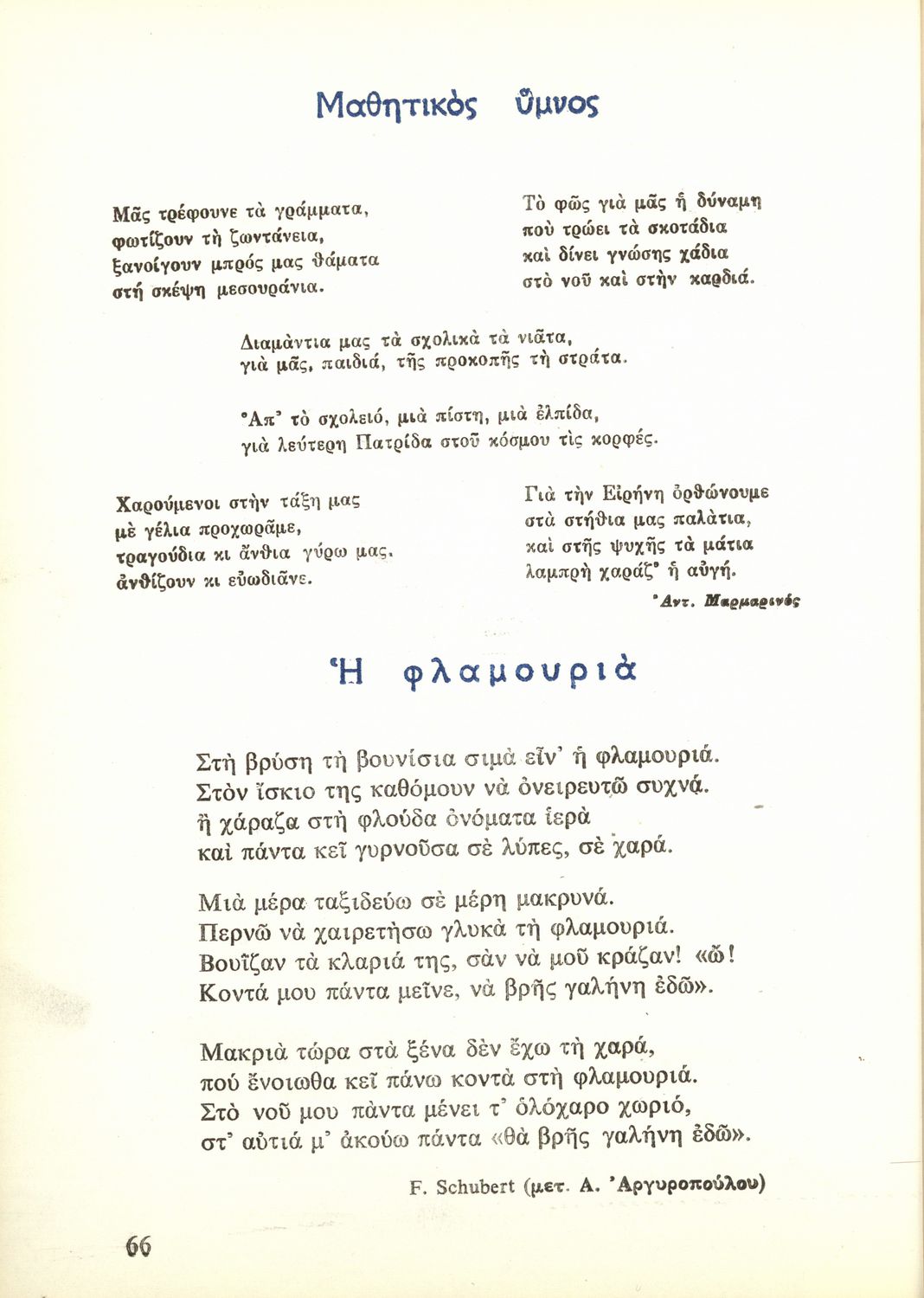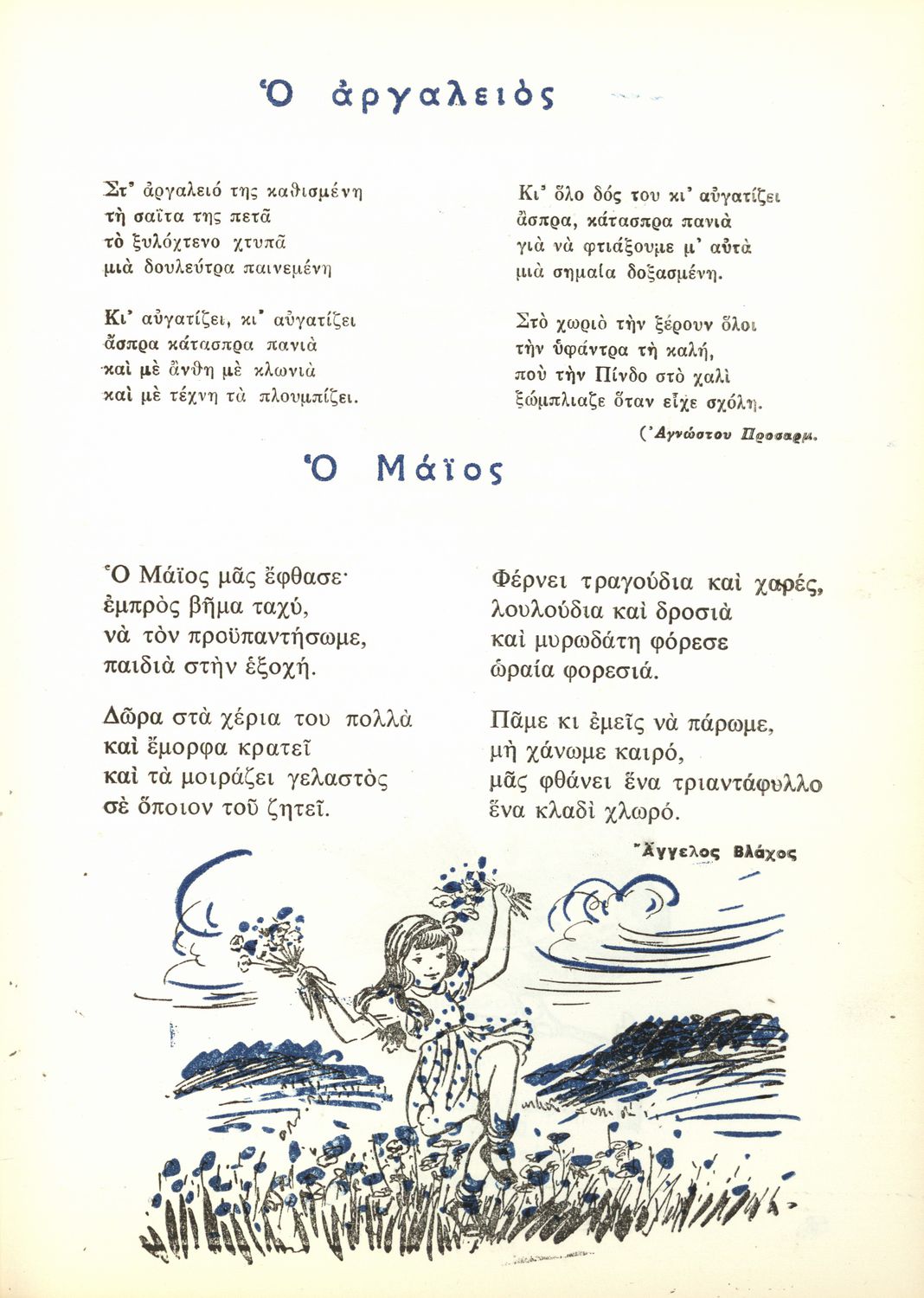 Παρουσίαση περιεχομένου: Σχολικό εγχειρίδιο Μουσικής για τις Α΄, Β΄, Γ΄, Δ΄ τάξεις του Δημοτικού. Το βιβλίο περιέχει τραγούδια και προσευχές με διάφορα θέματα. Ο συγγραφέας υπήρξε Δημοδιδάσκαλος της Μαρασλείου Παιδαγωγικής Ακαδημίας.