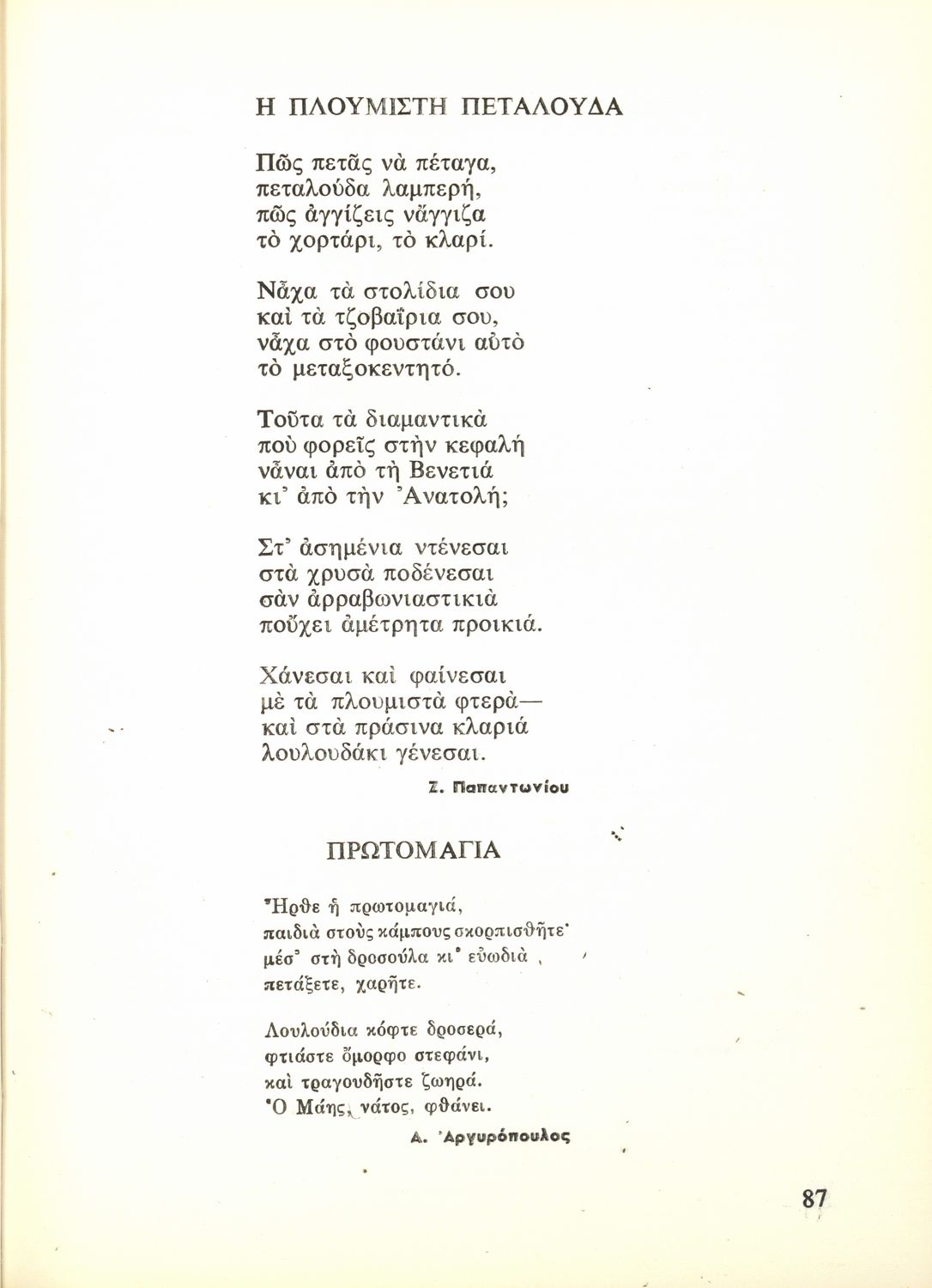 Παρουσίαση περιεχομένου: Σχολικό εγχειρίδιο Μουσικής για τις Α΄, Β΄, Γ΄, Δ΄ τάξεις του Δημοτικού. Το βιβλίο περιέχει τραγούδια και προσευχές με διάφορα θέματα. Ο συγγραφέας υπήρξε Δημοδιδάσκαλος της Μαρασλείου Παιδαγωγικής Ακαδημίας.