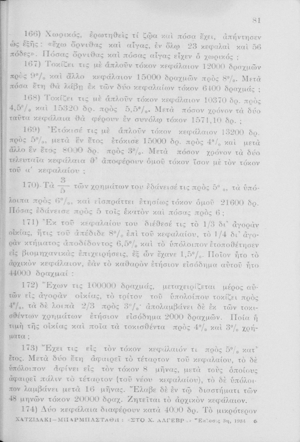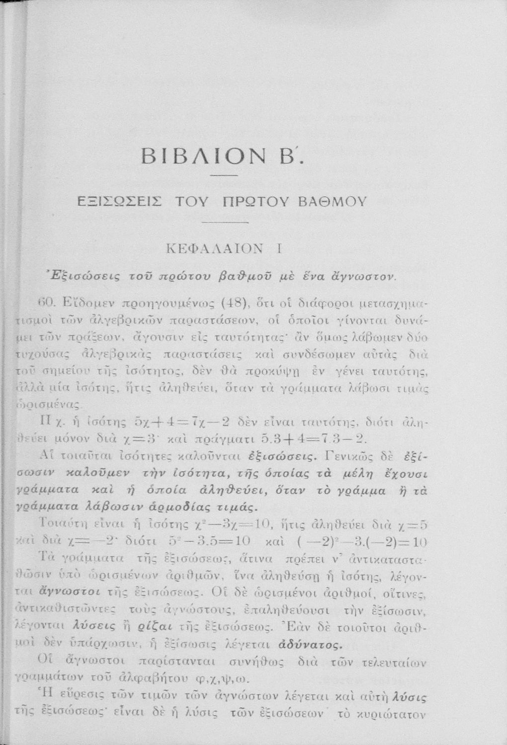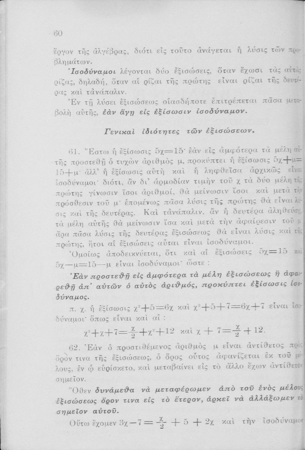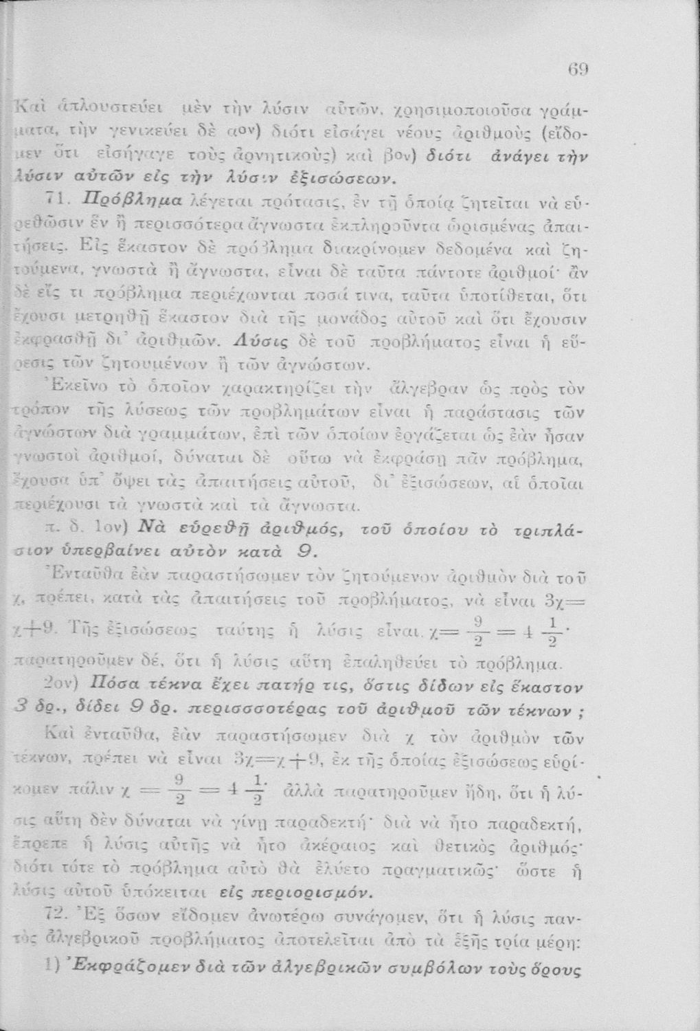 Σχολικό εγχειρίδιο Άλγεβρας Γυμνασίου που περιέχει θεωρία και ασκήσεις. Ο συγγραφέας ήταν υφηγητής στο Εθνικό Πανεπιστήμιο.