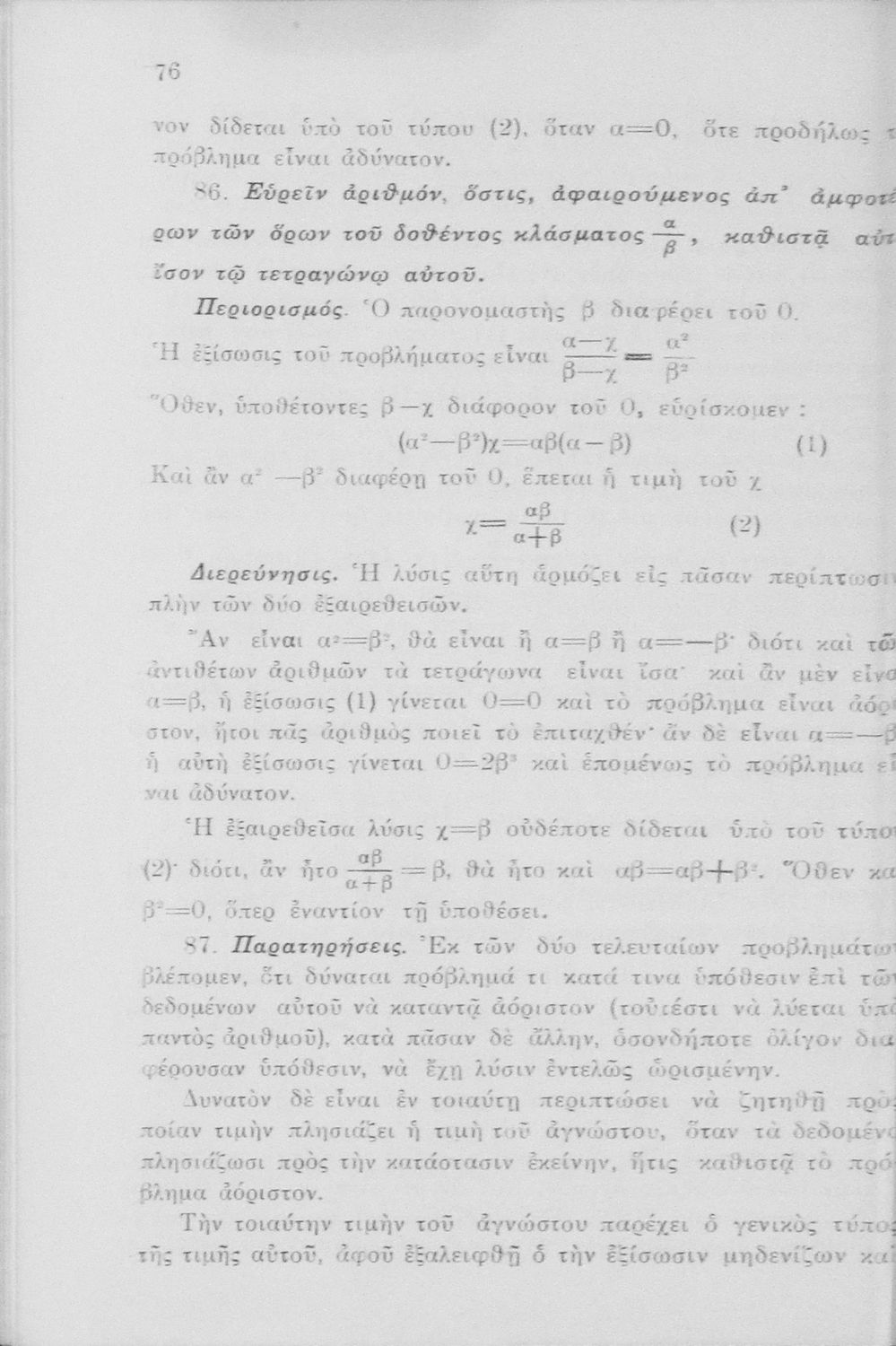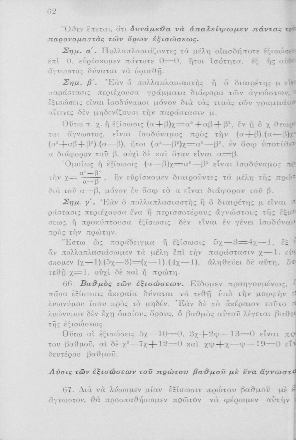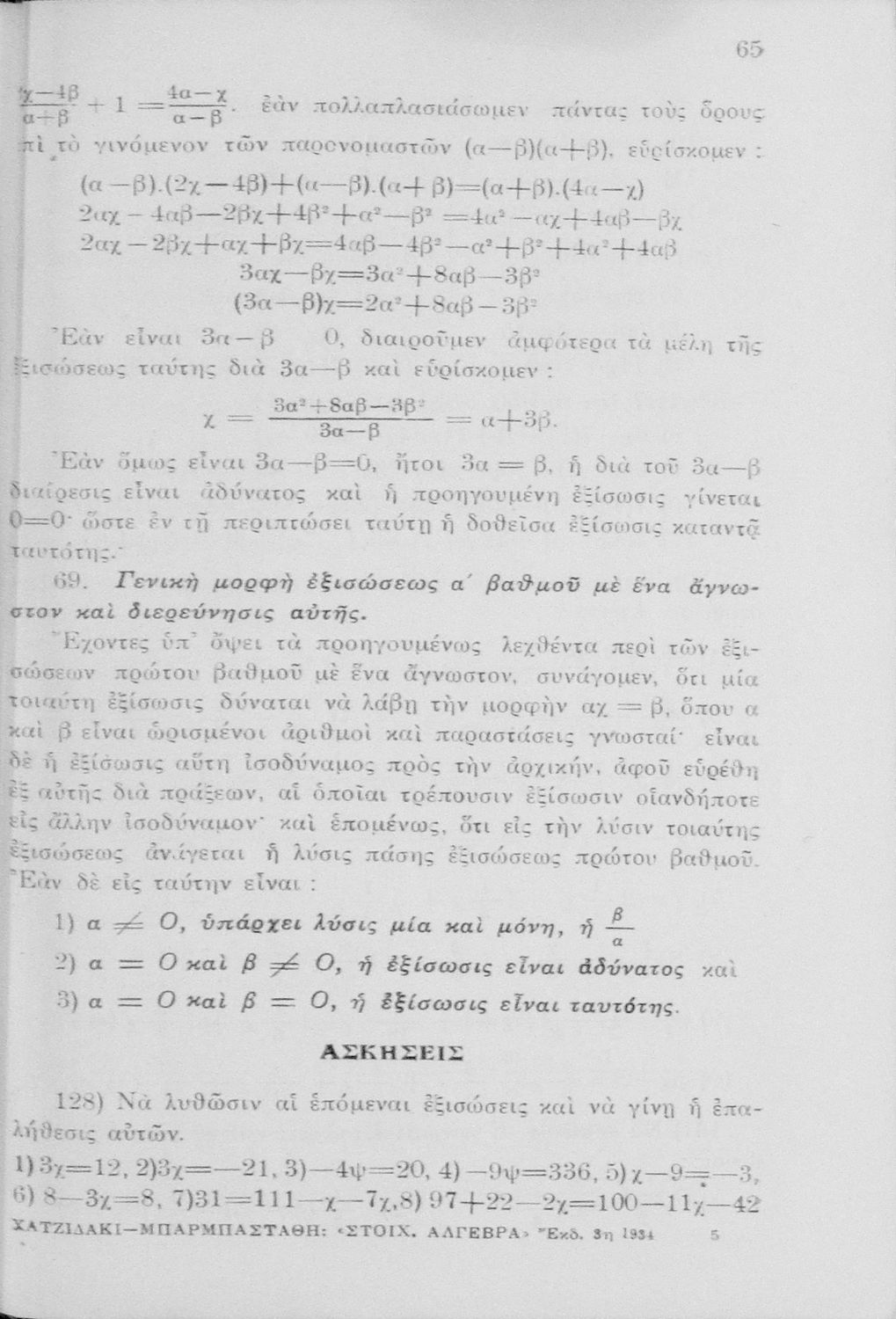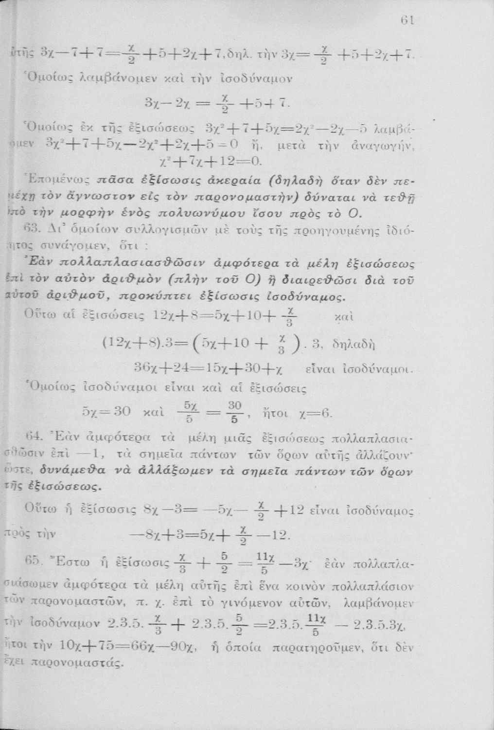 Σχολικό εγχειρίδιο Άλγεβρας Γυμνασίου που περιέχει θεωρία και ασκήσεις. Ο συγγραφέας ήταν υφηγητής στο Εθνικό Πανεπιστήμιο.