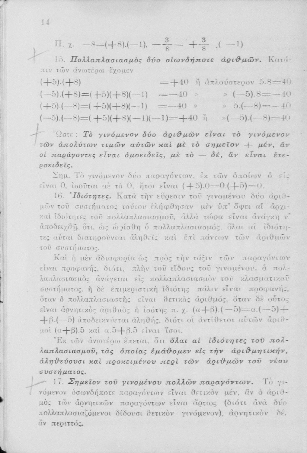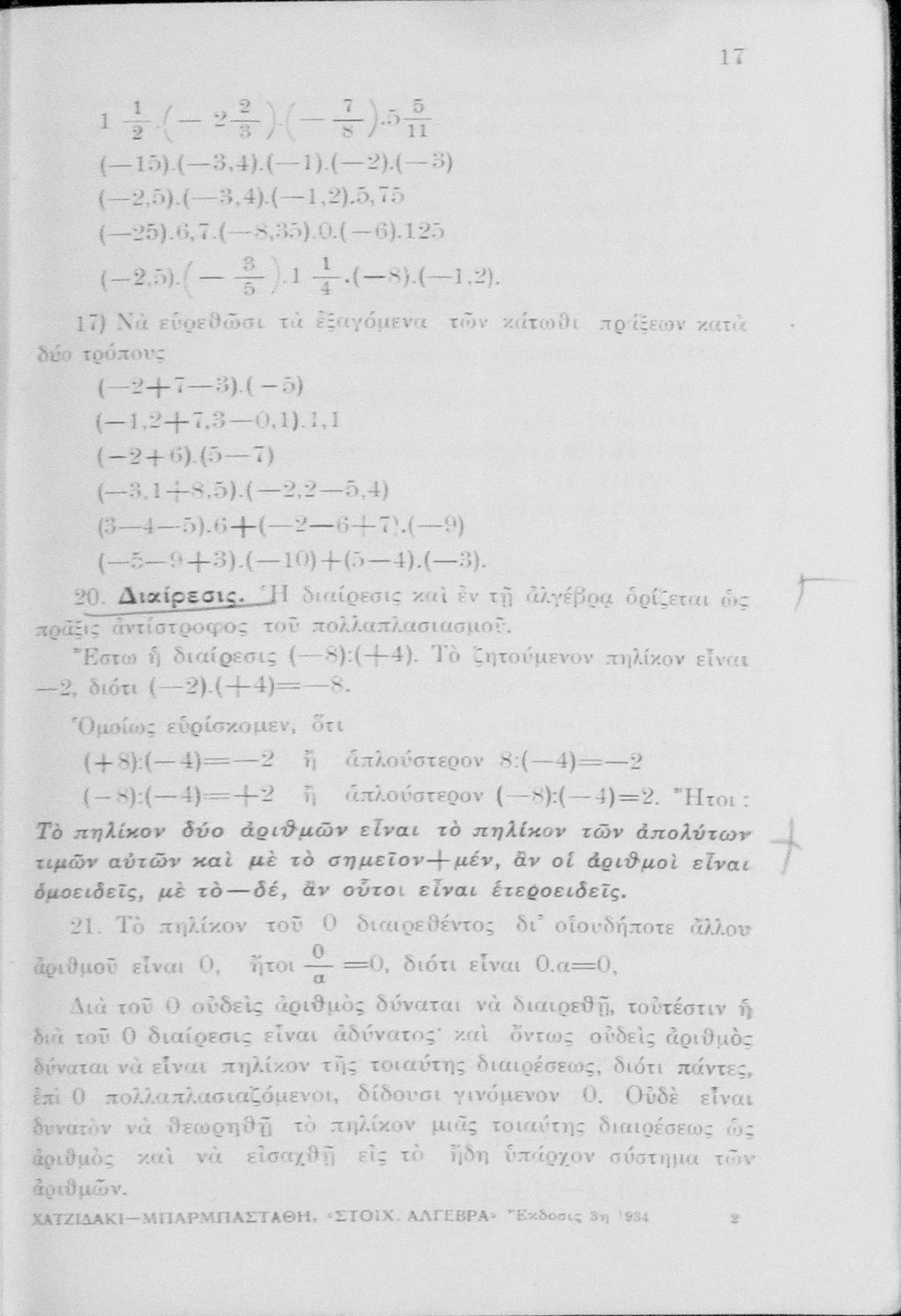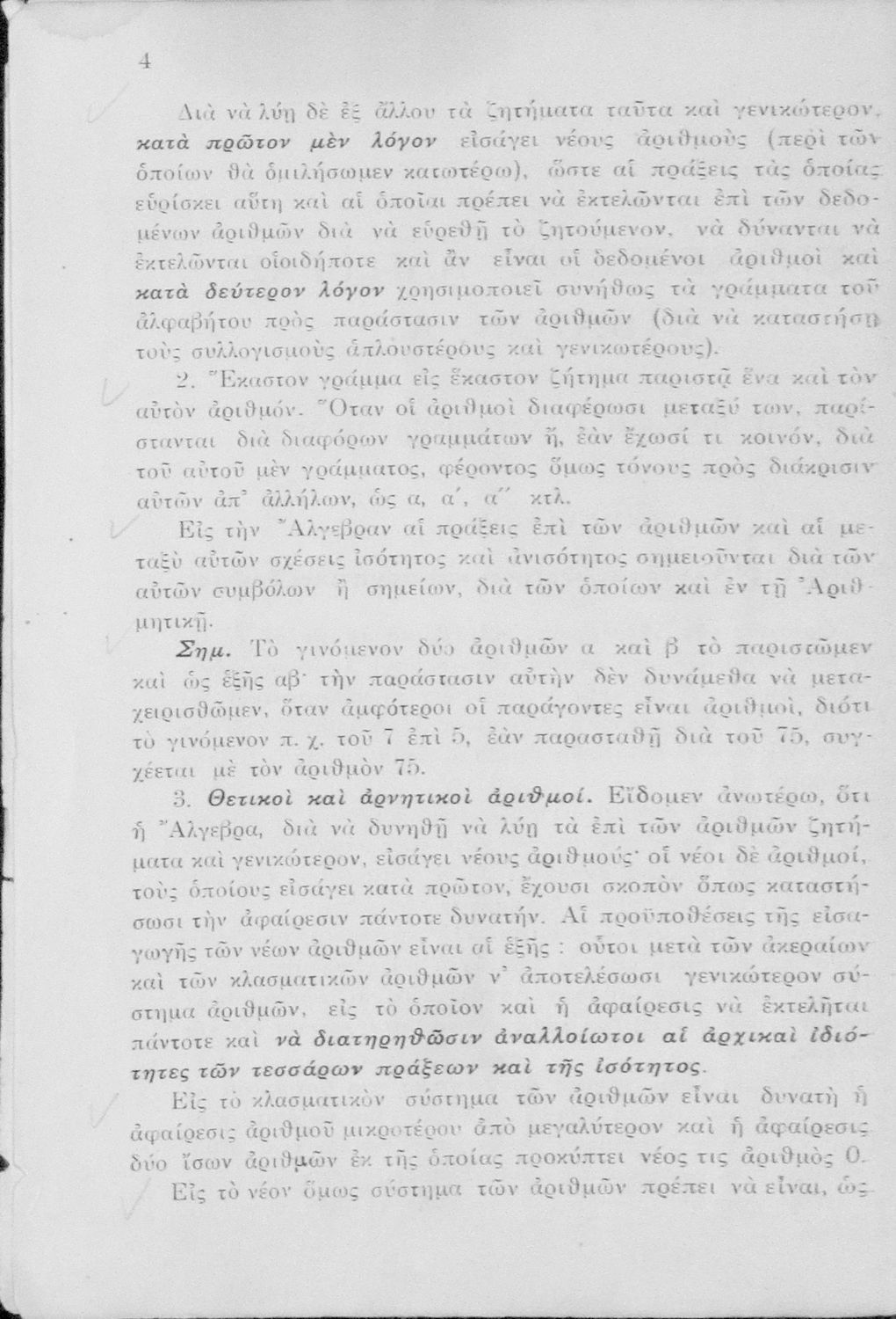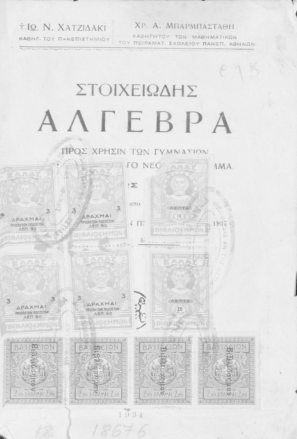 Σχολικό εγχειρίδιο Άλγεβρας Γυμνασίου που περιέχει θεωρία και ασκήσεις. Ο συγγραφέας ήταν υφηγητής στο Εθνικό Πανεπιστήμιο.