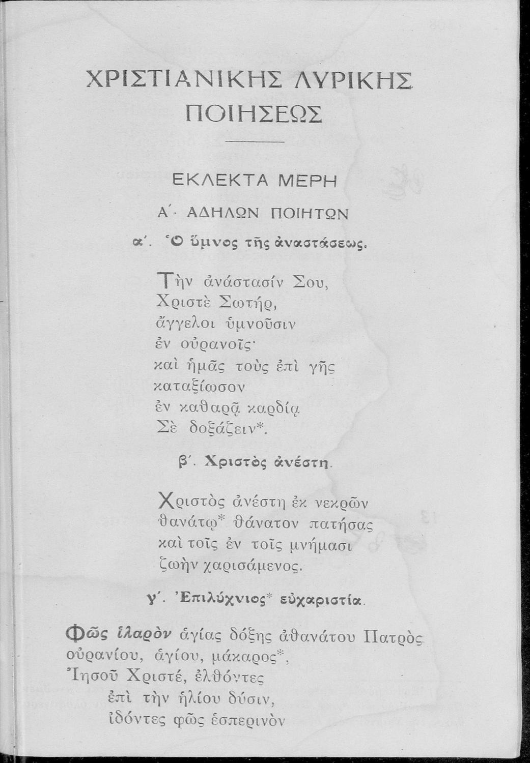 Έλληνες Λυρικοί και Χριστιανικής λυρικής Ποιήσεως εκλεκτά μέρη. Προς χρήσιν των μαθητών της Ε΄ Τάξεως των Γυμνασίων