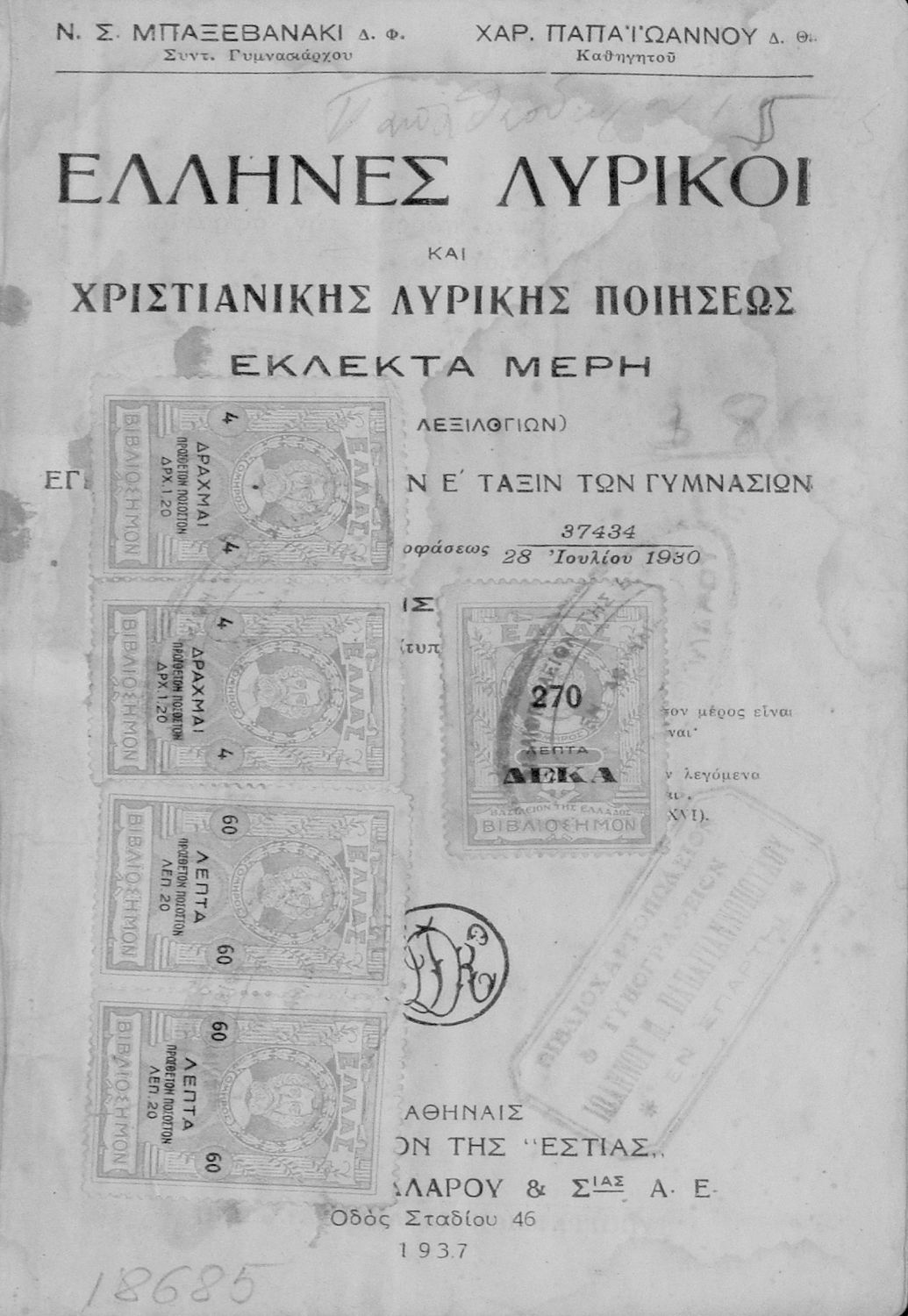 Τίτλος: Έλληνες Λυρικοί και Χριστιανικής λυρικής Ποιήσεως εκλεκτά μέρη. Προς χρήσιν των μαθητών της Ε΄ Τάξεως των Γυμνασίων