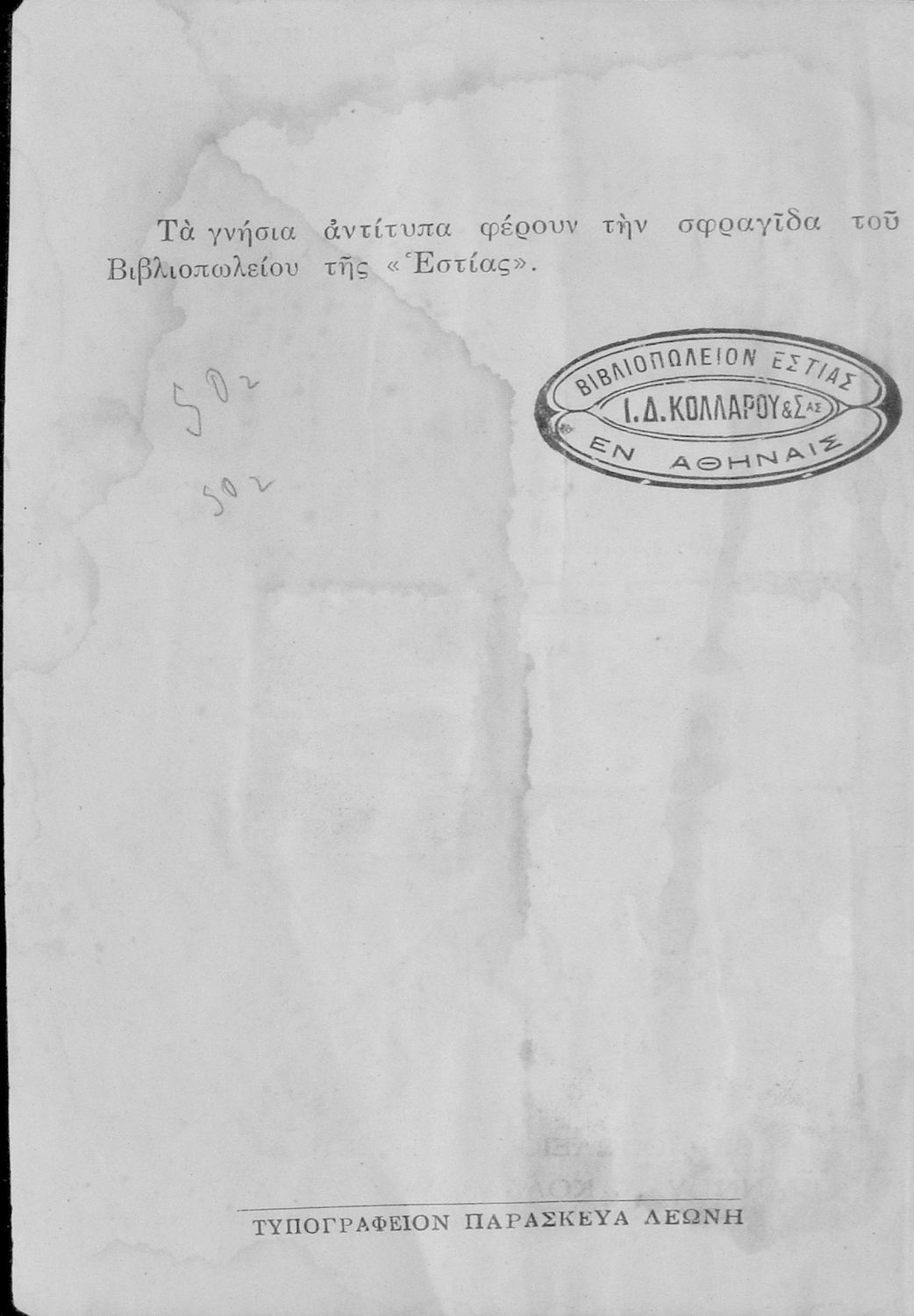 Εκδότης: Ιωάννης Δ. Κολλάρος και ΣΙΑ, Βιβλιοπωλείο της "Εστίας"