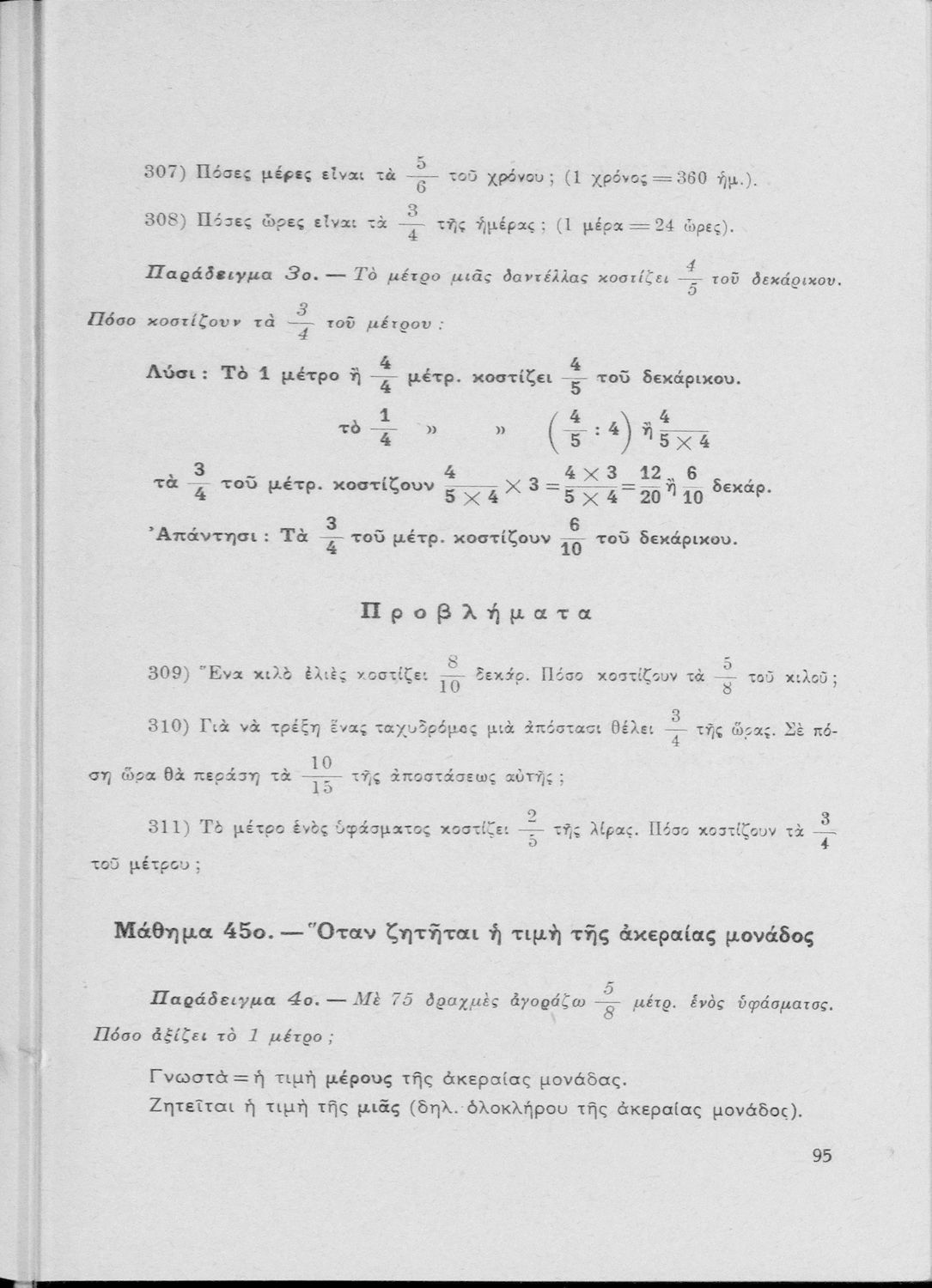 Μαθητικό βοήθημα Αριθμητικής για τις Ε΄ και ΣΤ΄ Δημοτικού που περιέχει ασκήσεις με επιχειρηματικό προσανατολισμό και εστιάζει στις αριθμητικές πράξεις με κλάσματα και την απλή μέθοδο των τριών.