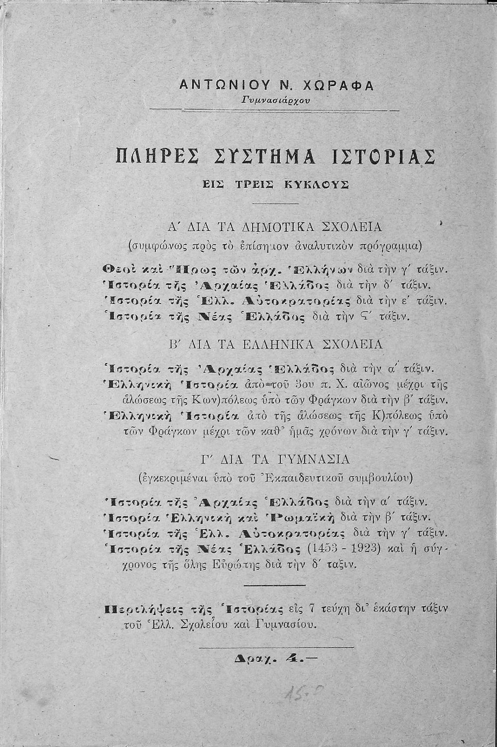 Μαθητικό βοήθημα της Α΄ Γυμνασίου για το μάθημα της Ιστορίας. Το εγχειρίδιο περιέχει περιλήψεις των κεφαλαίων του σχολικού βιβλίου. Ο συγγραφέας ήταν Γυμνασιάρχης.