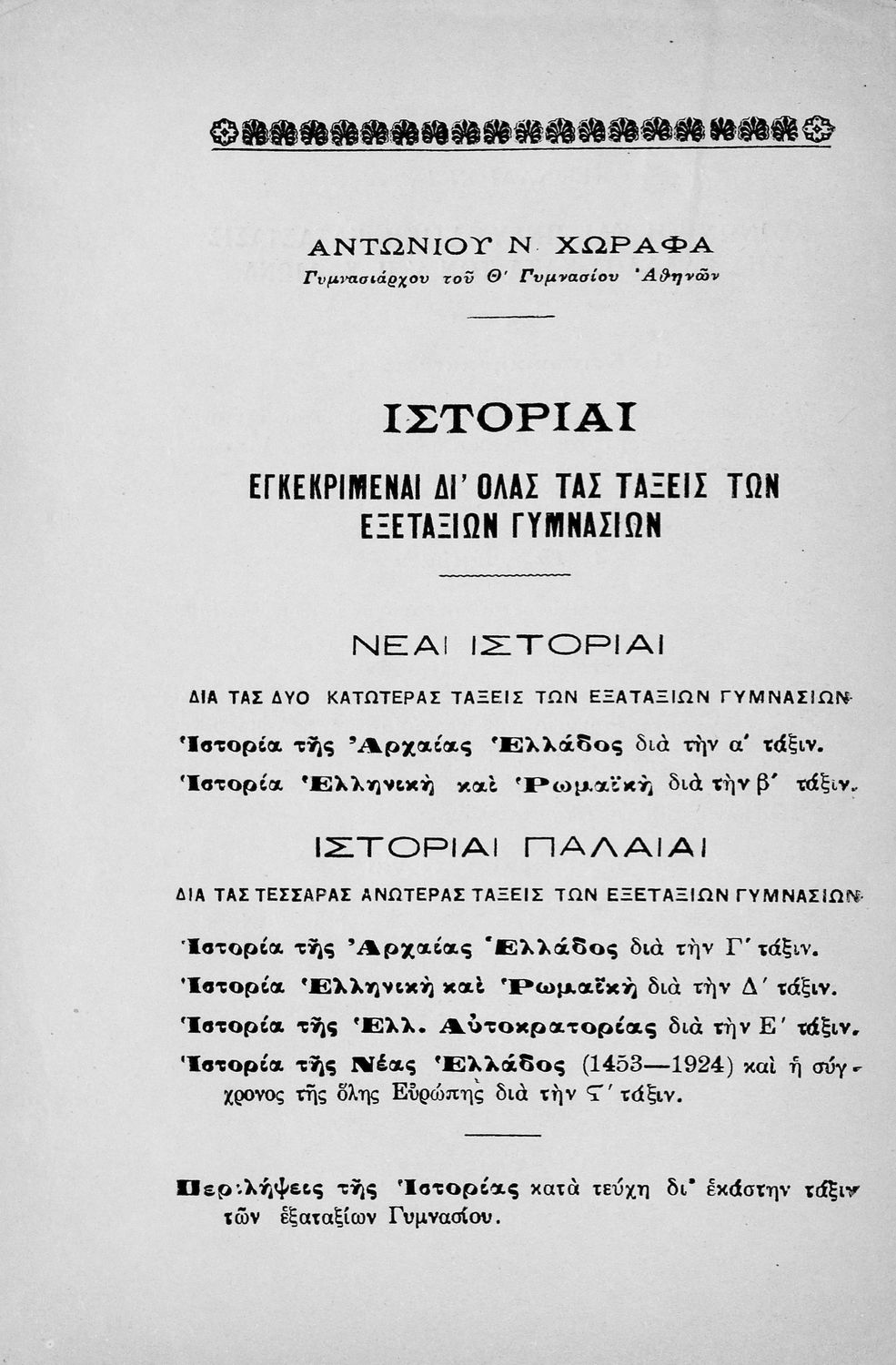 Μαθητικό βοήθημα της Α΄ Γυμνασίου για το μάθημα της Ιστορίας. Το εγχειρίδιο περιέχει περιλήψεις των κεφαλαίων του σχολικού βιβλίου. Ο συγγραφέας ήταν Γυμνασιάρχης.